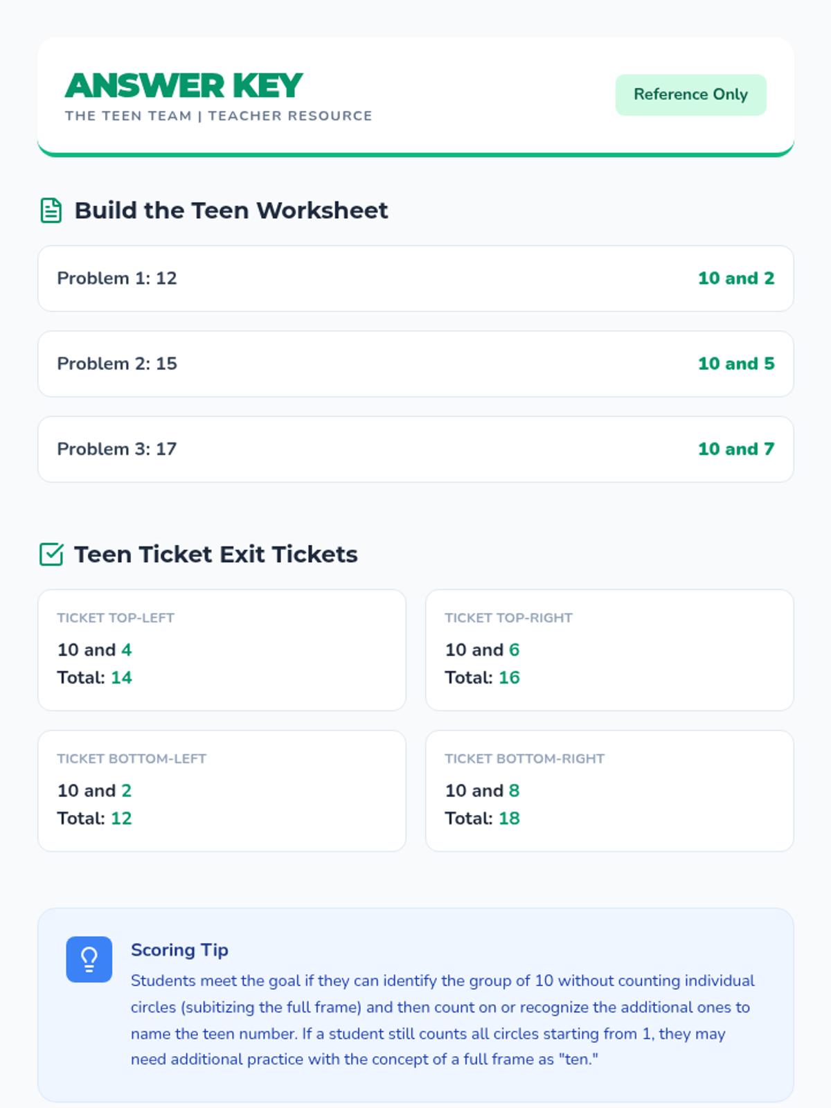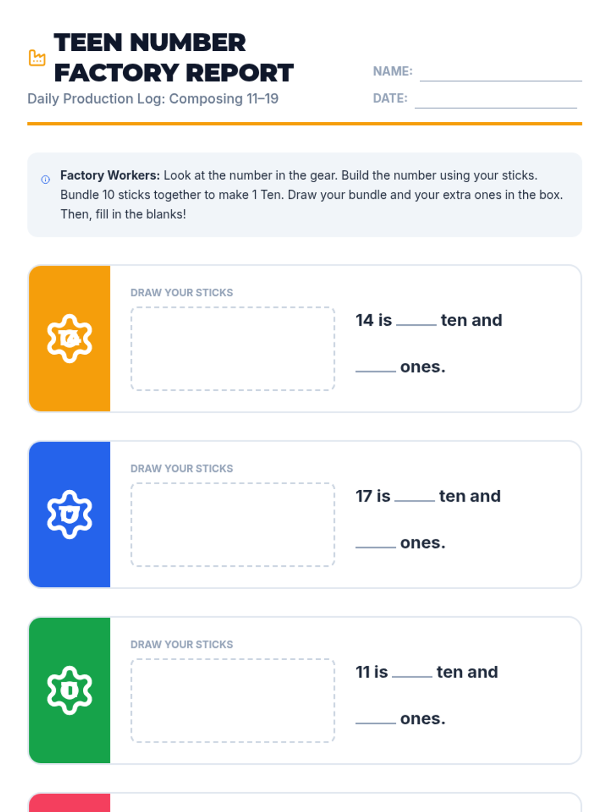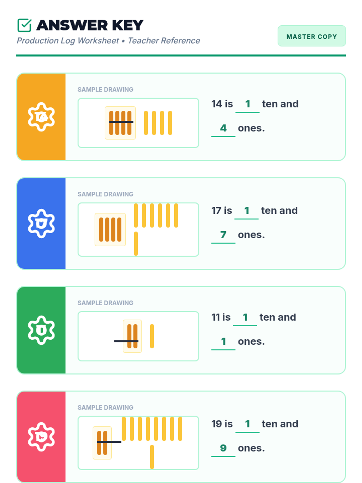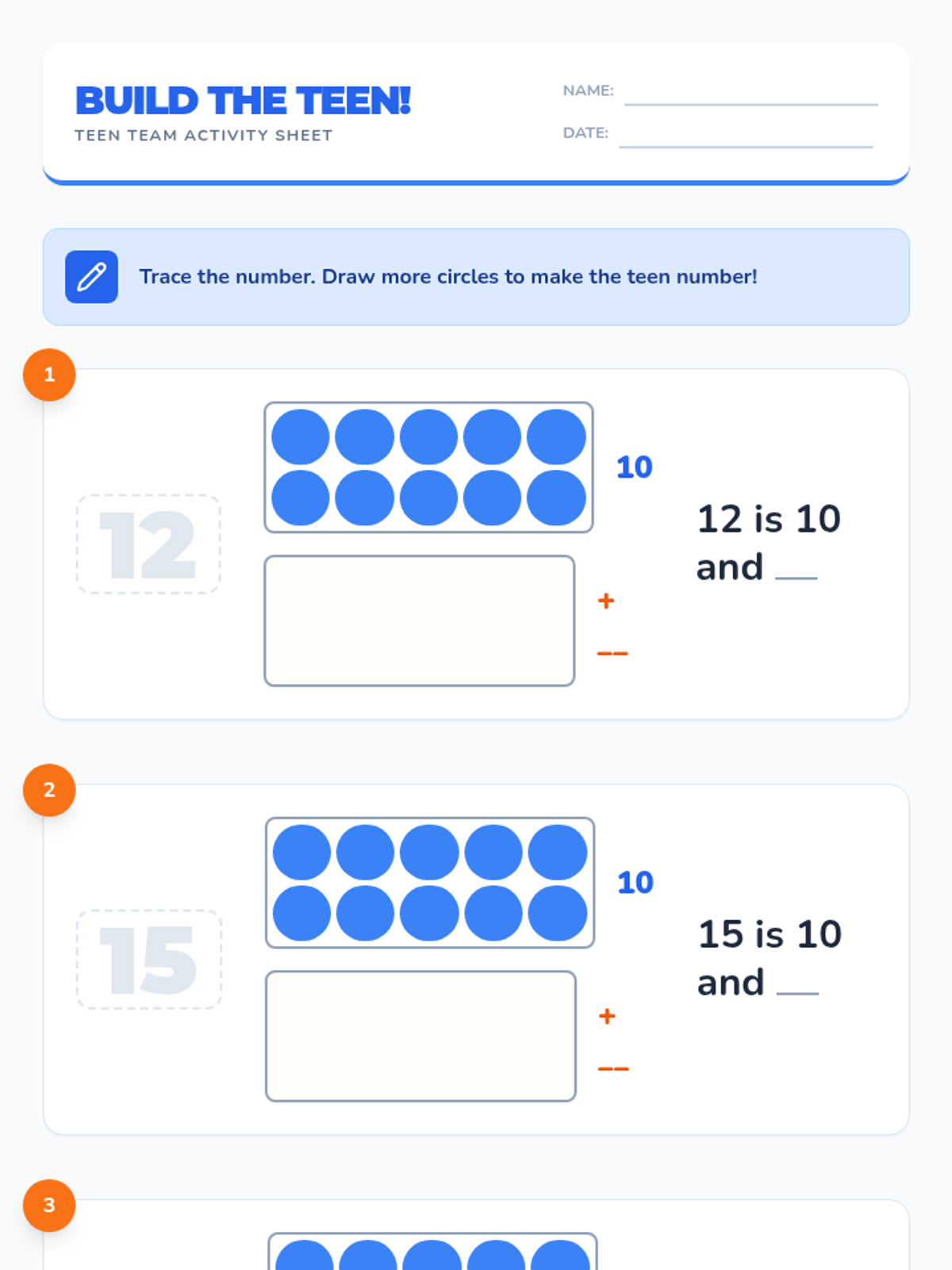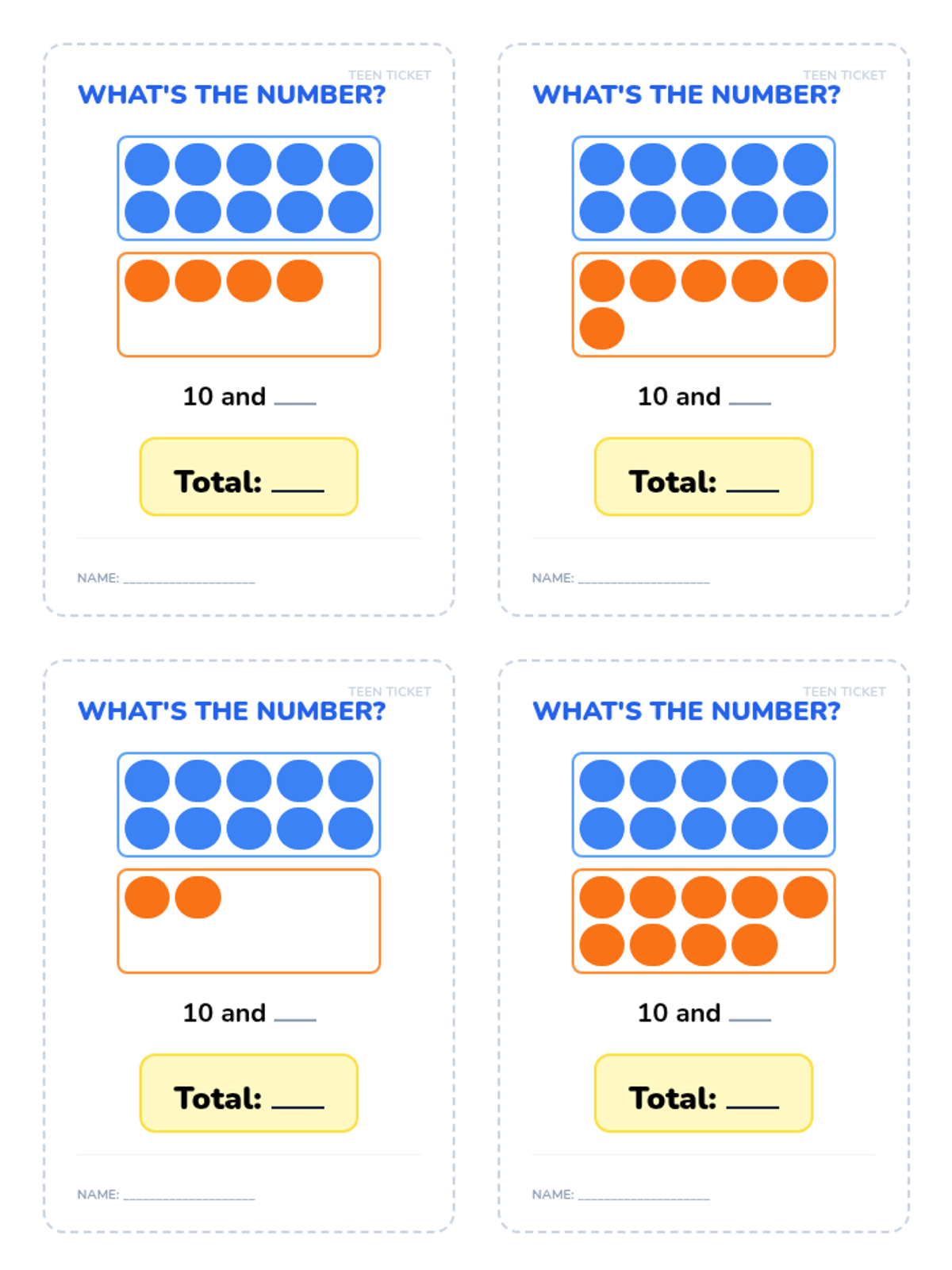 Connecting concrete counters to drawings and visual models for all teen numbers.