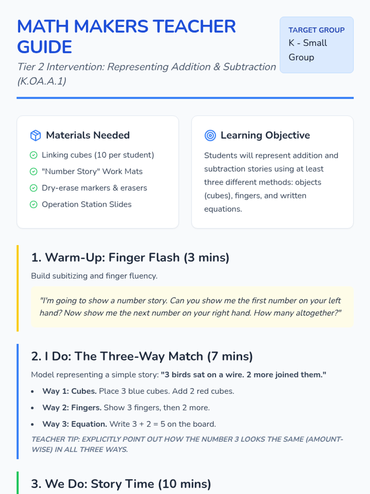 A targeted Tier 2 intervention lesson for Kindergarten students focusing on representing addition and subtraction through multiple modalities like cubes, fingers, and equations. This lesson builds flexible thinking by showing the same problem in different ways to meet Colorado standard K.OA.A.1.