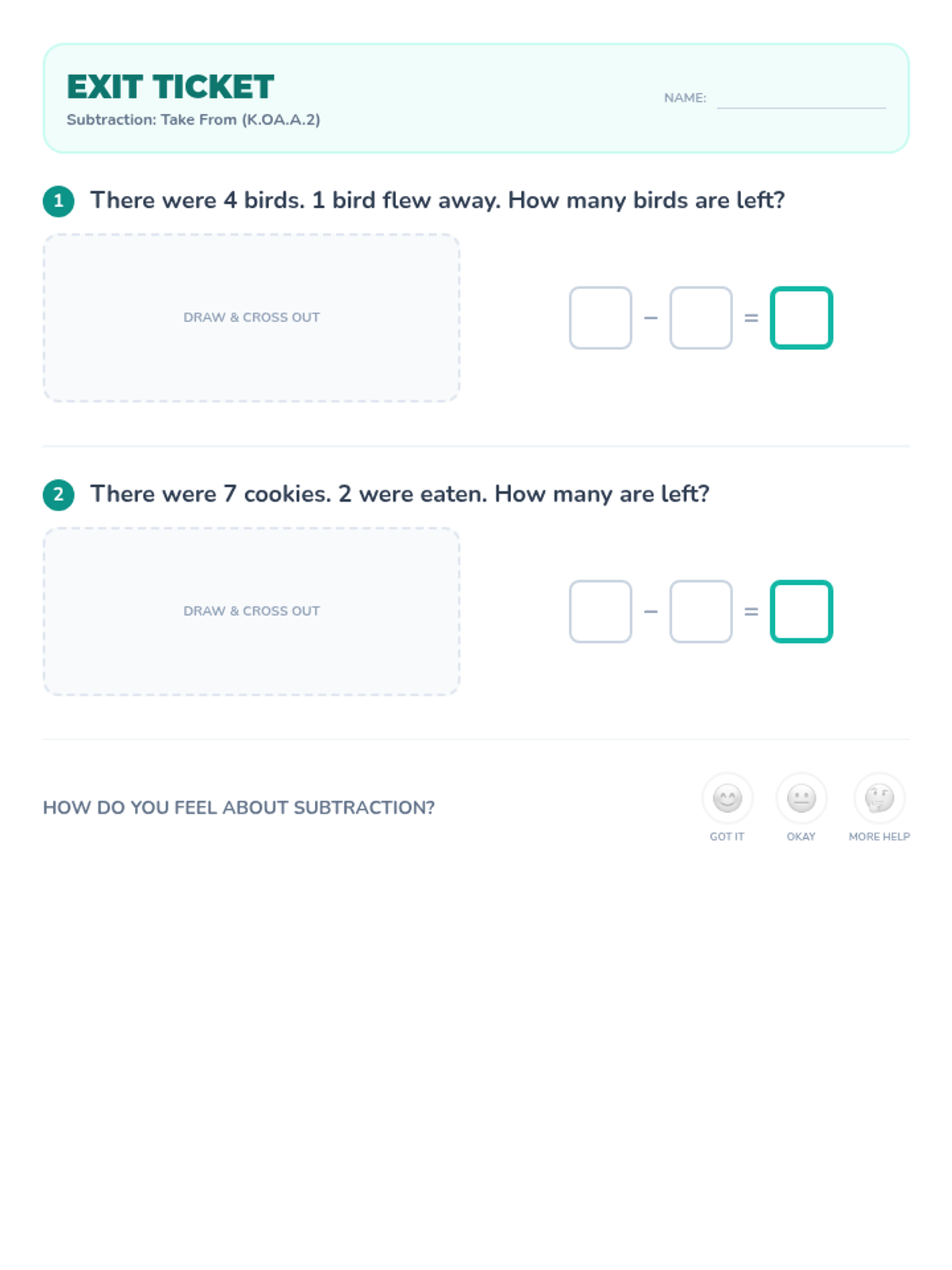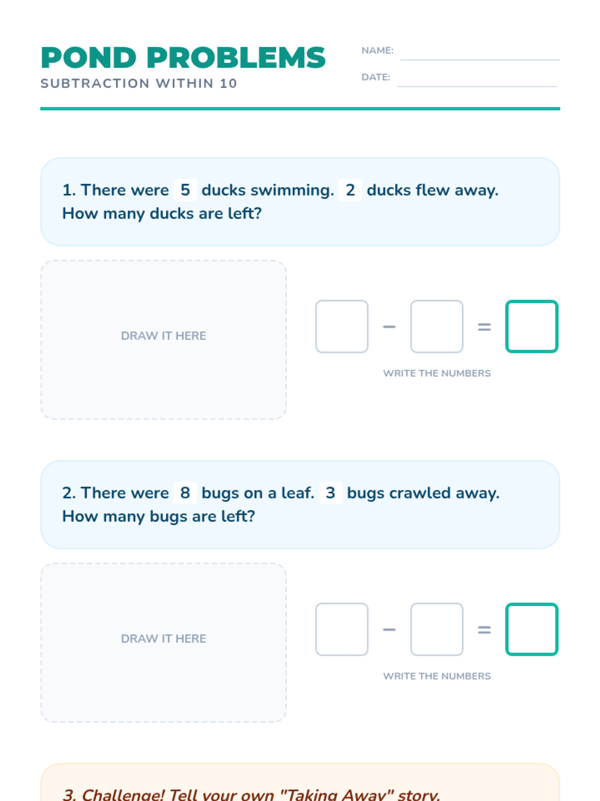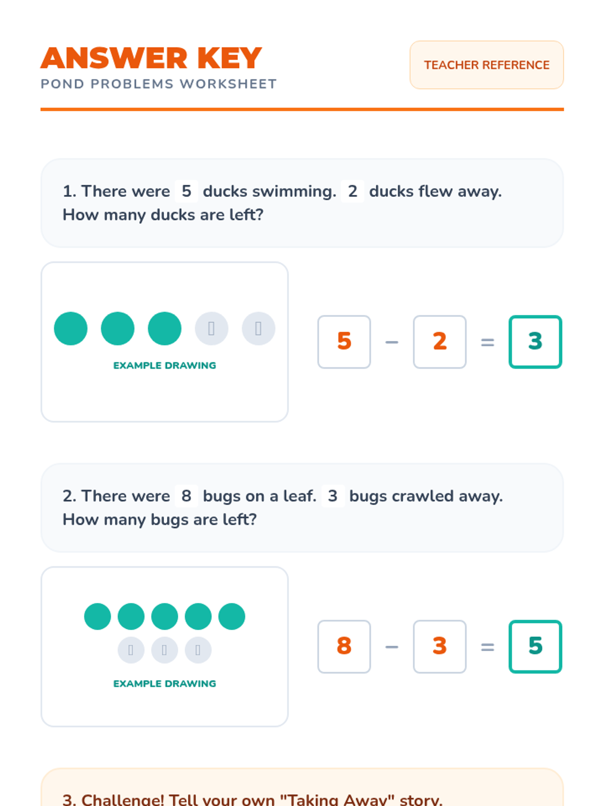 An introductory lesson on subtraction for numbers up to 10. Students learn the concepts of 'taking away' and finding the 'difference' through visual storytelling and guided practice.