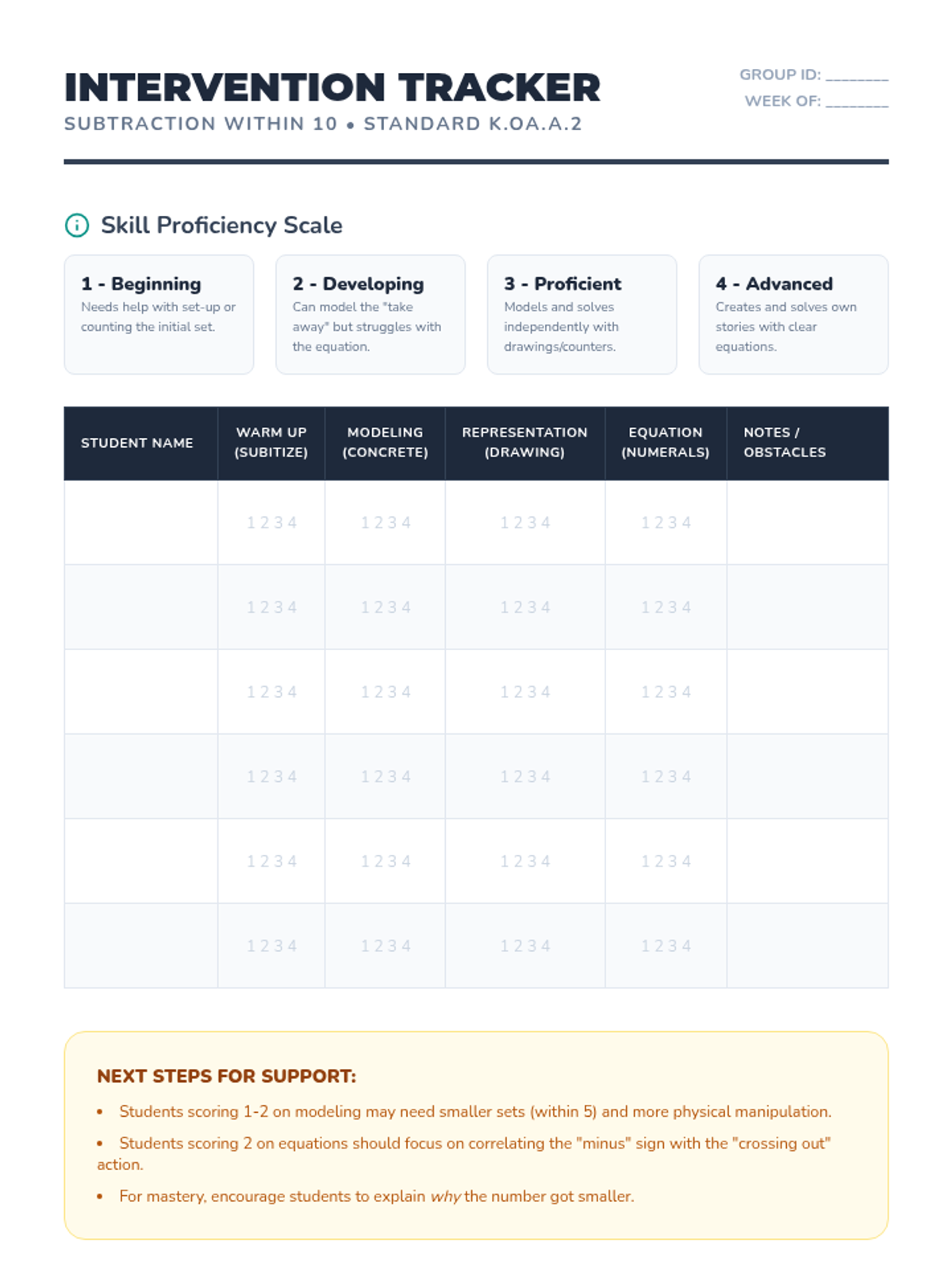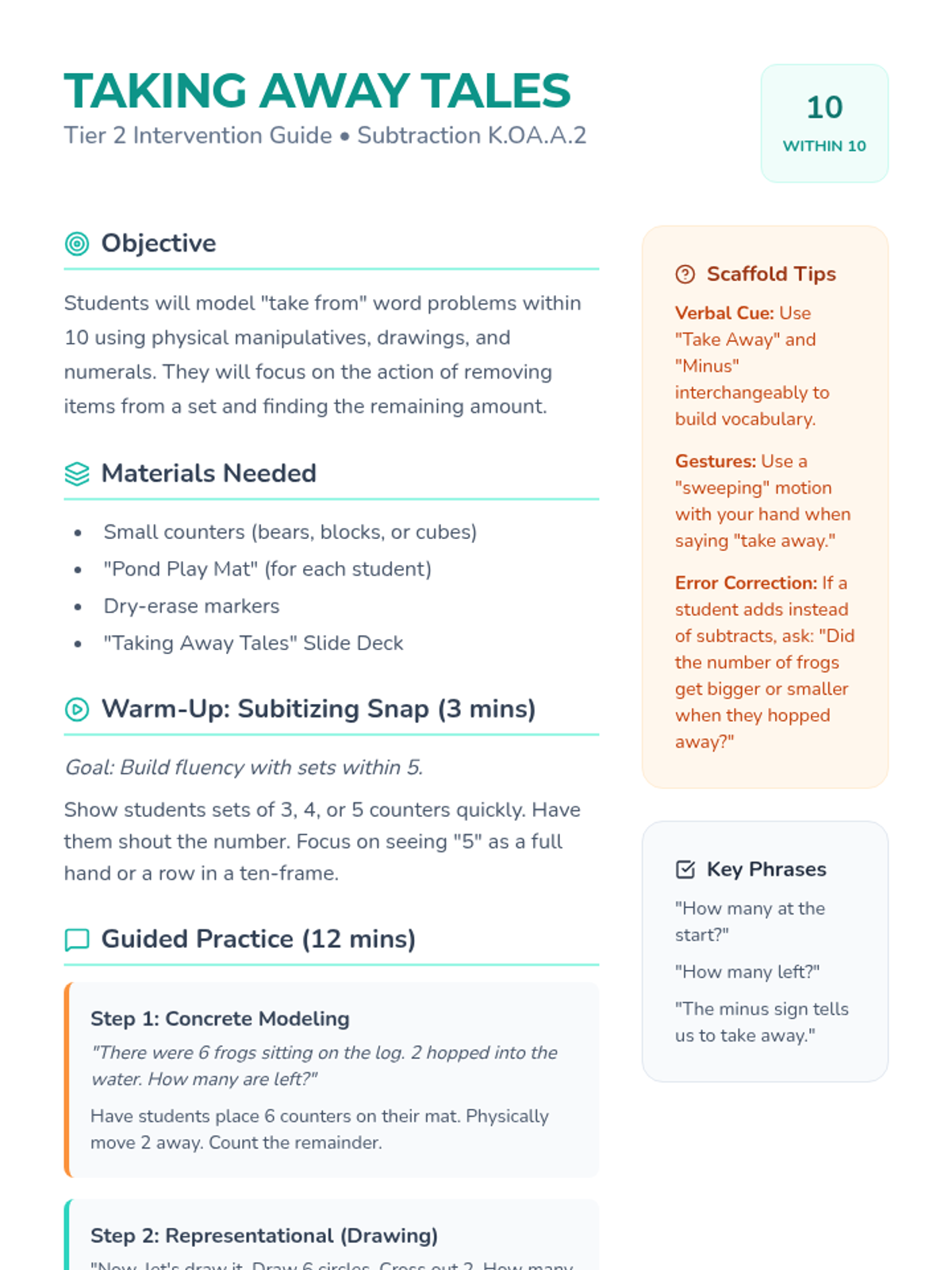 A targeted Tier 2 intervention lesson focusing on 'take from' subtraction word problems within 10. Students move from concrete manipulation of objects to representing stories through drawings and simple equations.