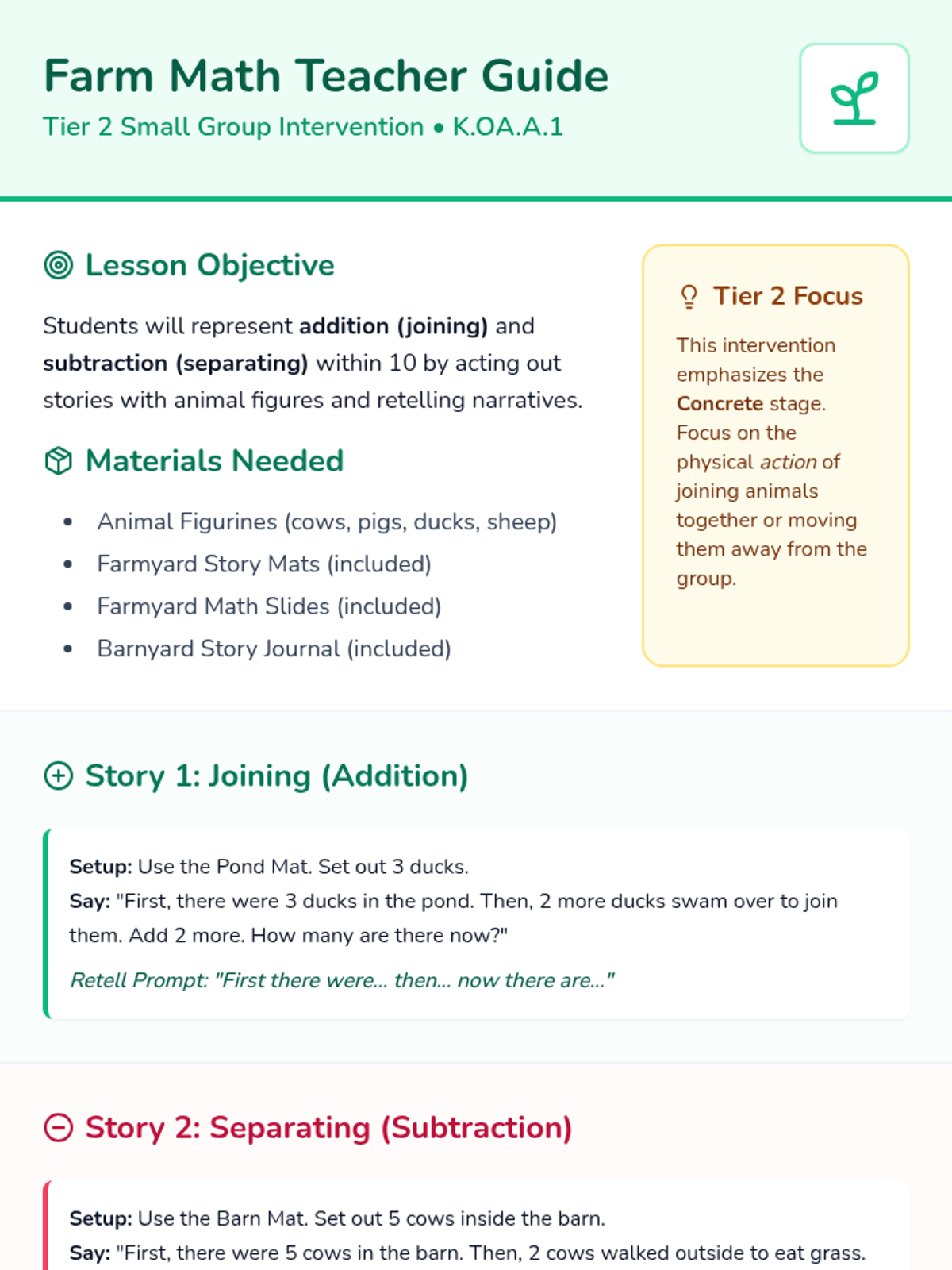 A Tier 2 intervention lesson for Kindergarten students focusing on representing addition through acting out stories with toy figures and retelling math narratives. Students will use manipulatives and story mats to visualize and solve simple addition problems within 10.