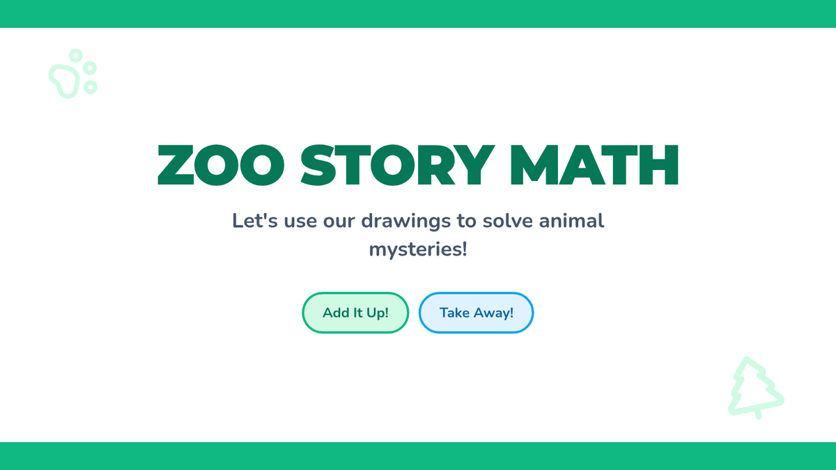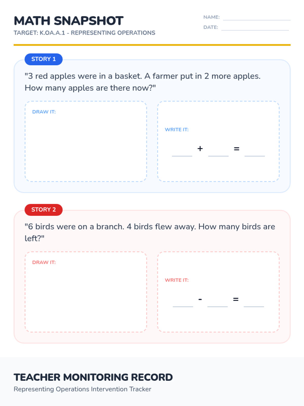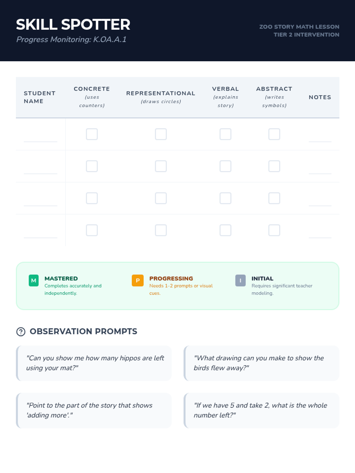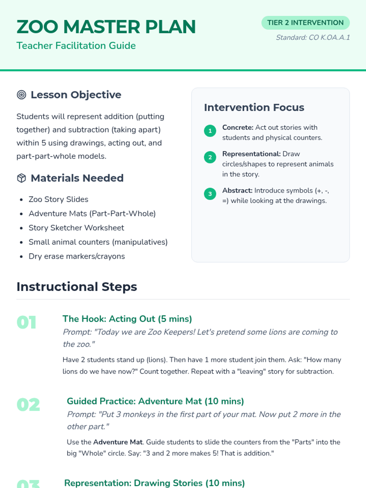 A Tier 2 intervention lesson for Kindergarteners focusing on representing addition and subtraction through stories, drawings, and part-part-whole models with a fun zoo theme.