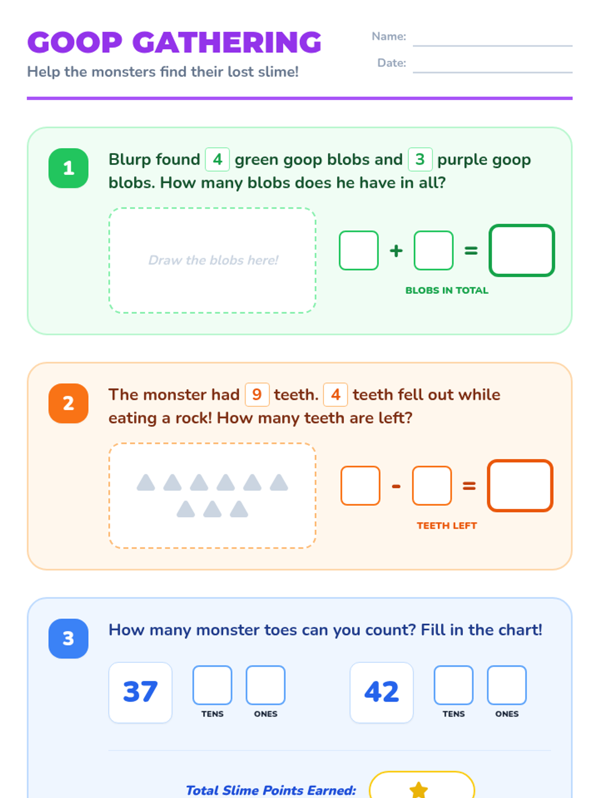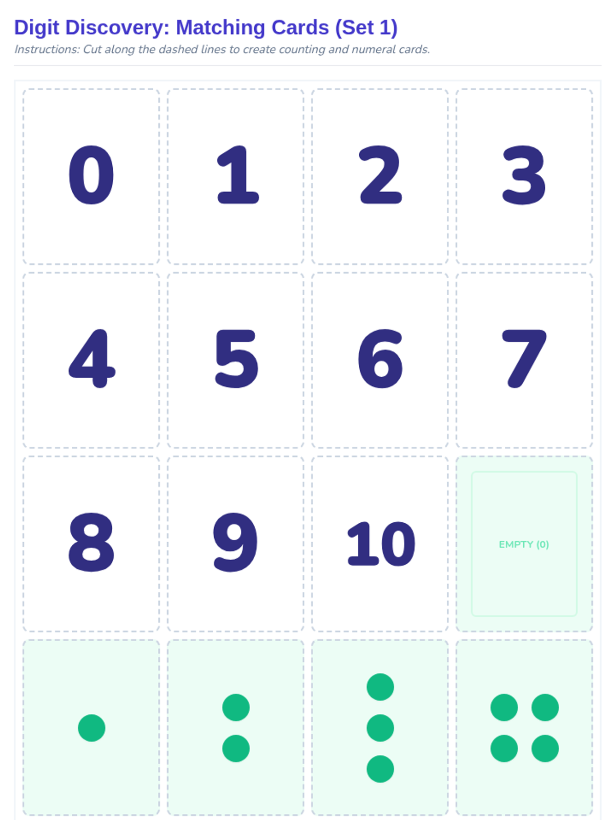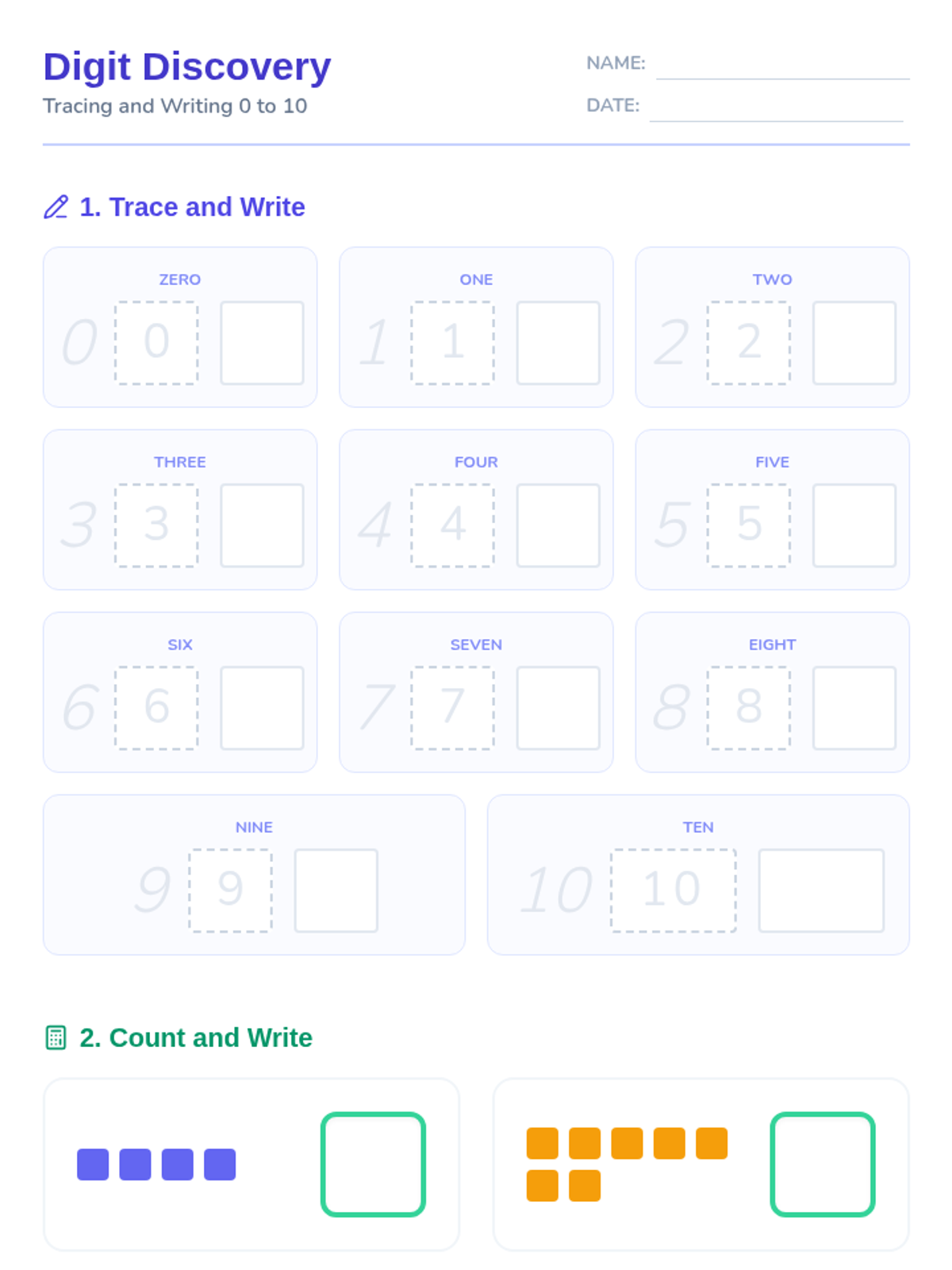 Numbers 0-10Numeral recognition, counting, and cardinality for integers zero through ten. Strengthens one-to-one correspondence and basic number sense through visual sets and tracing.