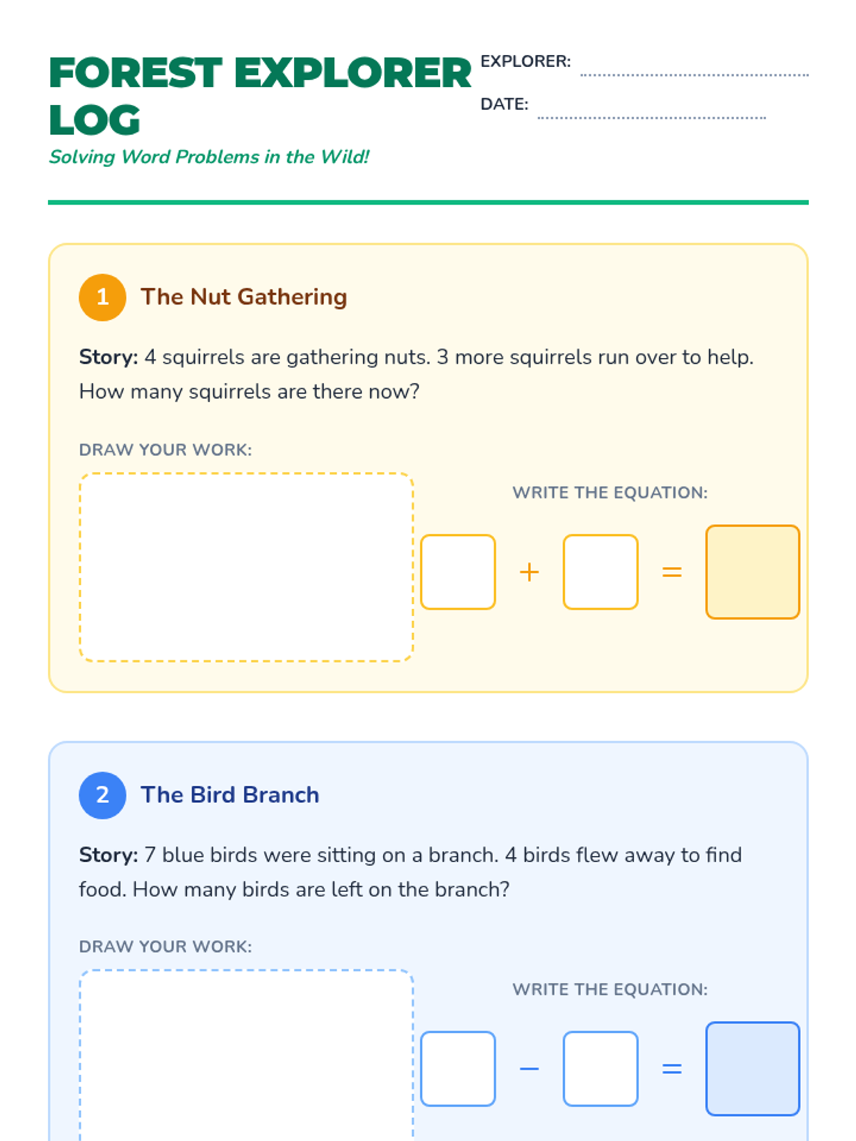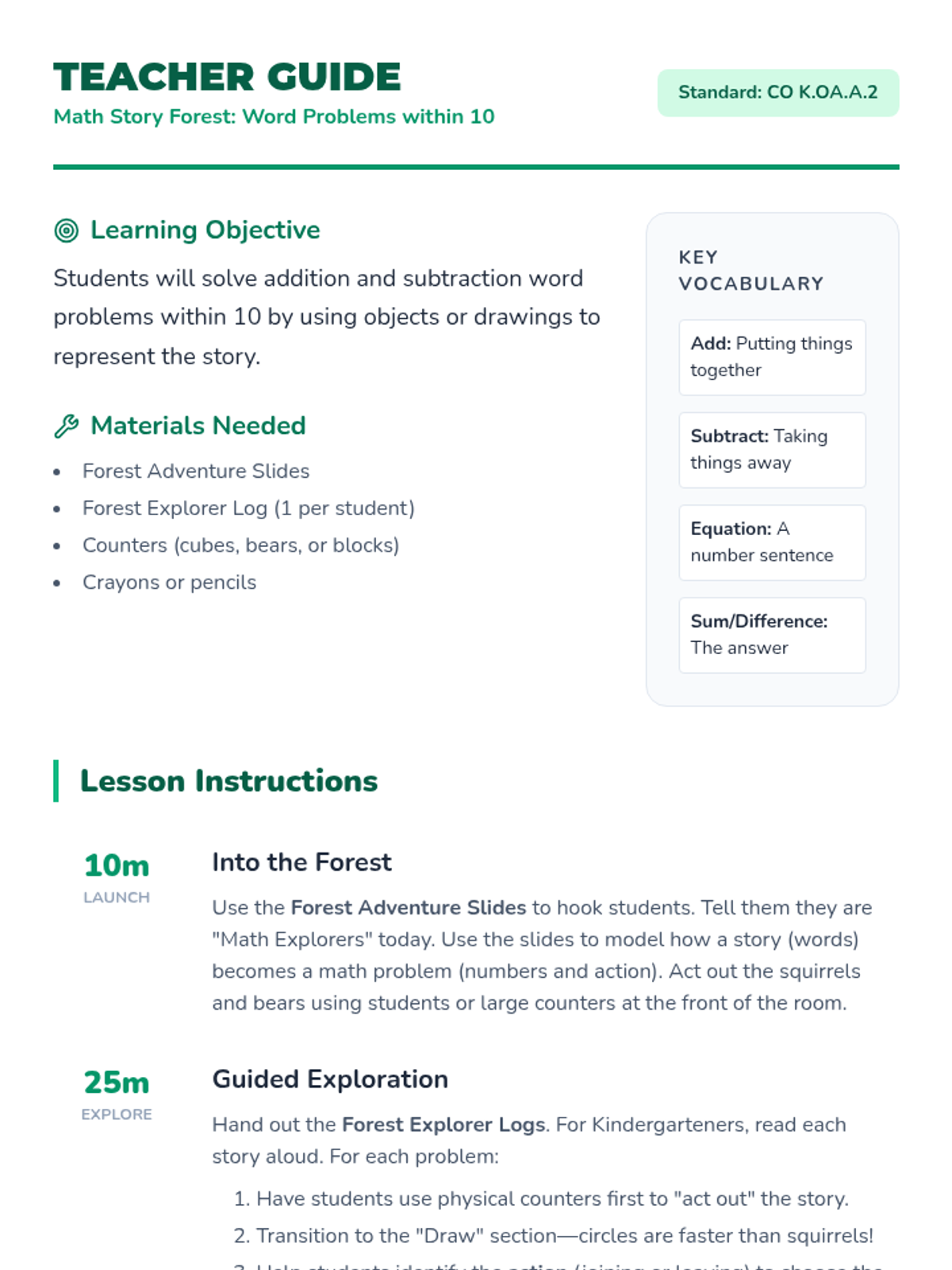 A Kindergarten lesson focused on solving addition and subtraction word problems within 10 using storytelling, drawings, and manipulatives. Students explore 'Adding To', 'Putting Together', 'Taking From', and 'Taking Apart' through a forest-themed adventure.