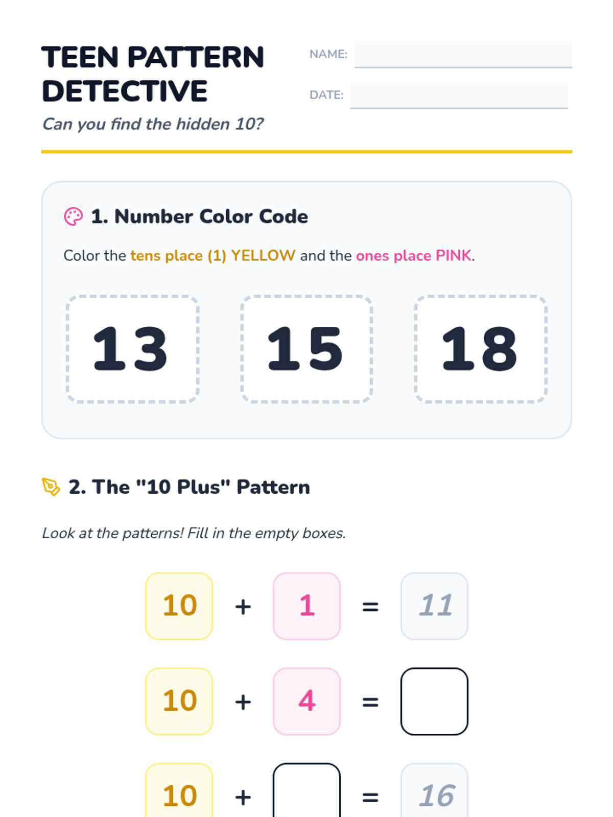 Students build on the 'ten and some more' concept specifically for 14 and 15, introducing the double 10-frame visual model.