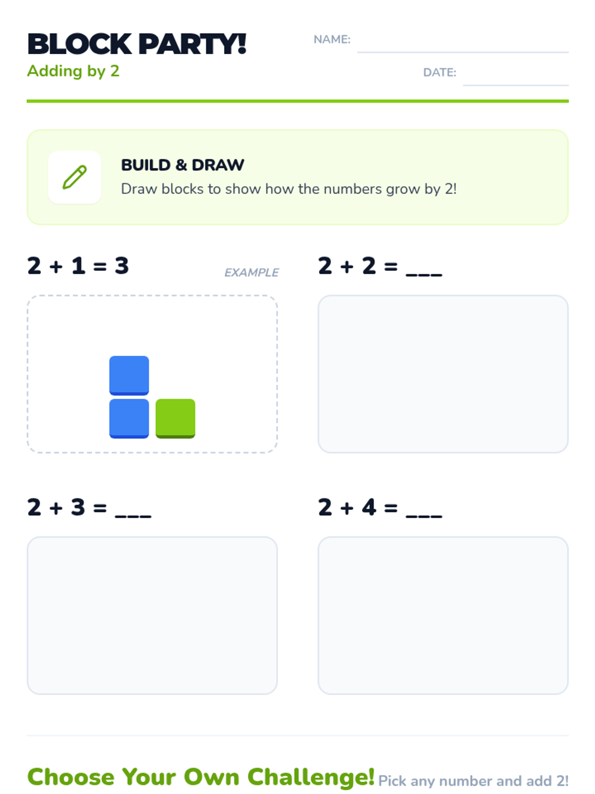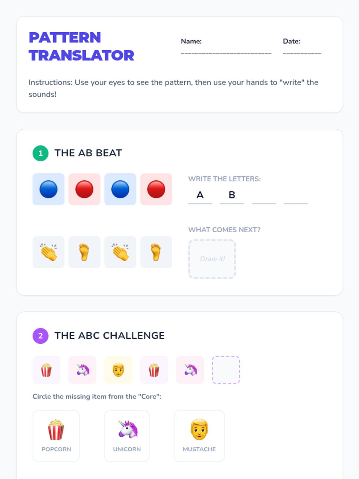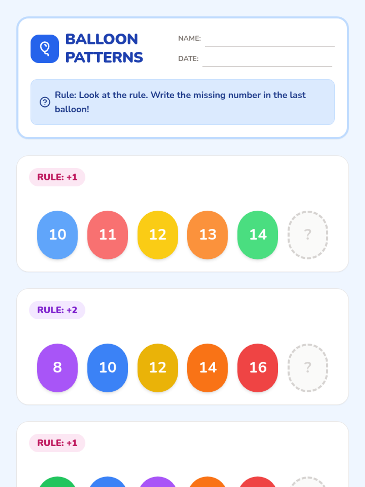 Patterns and RelationshipsIdentification, extension, and creation of repeating and growing patterns using shapes, colors, and numbers. Develops algebraic thinking by analyzing sequences and defining functional relationships between variables.