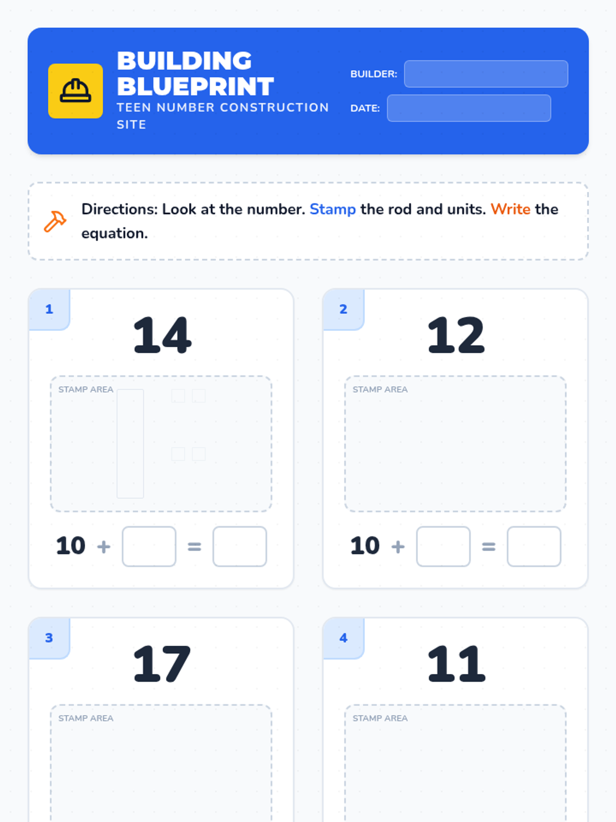 Students explore the structure of 16 and 17 as a full 10-frame and extra ones.