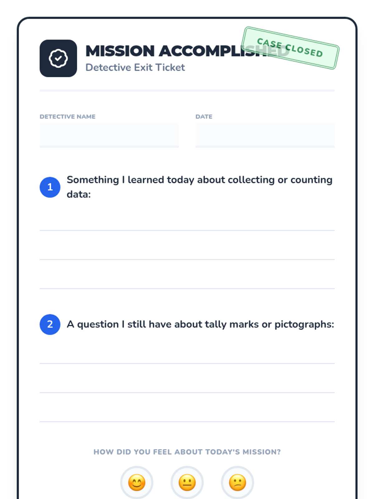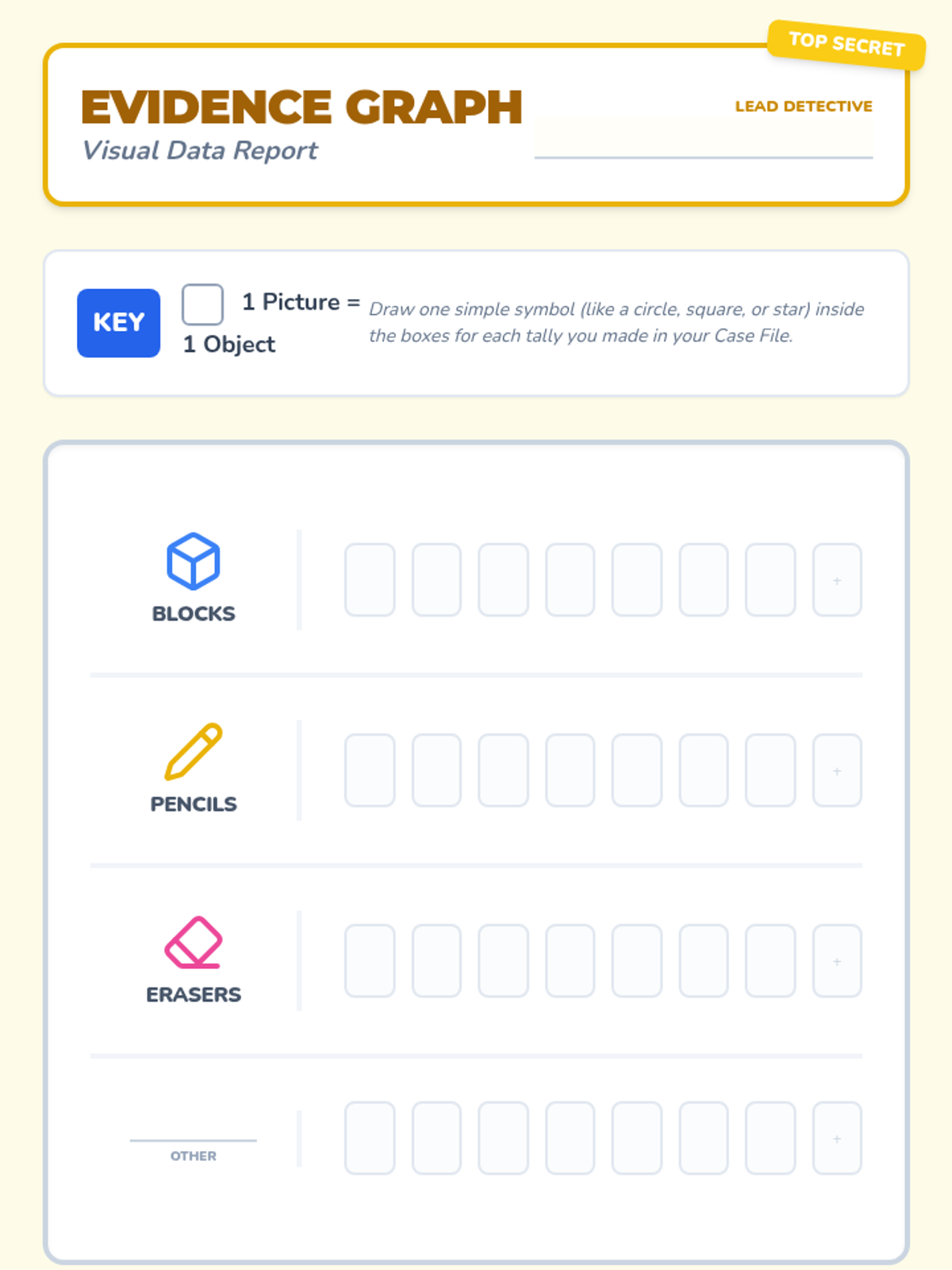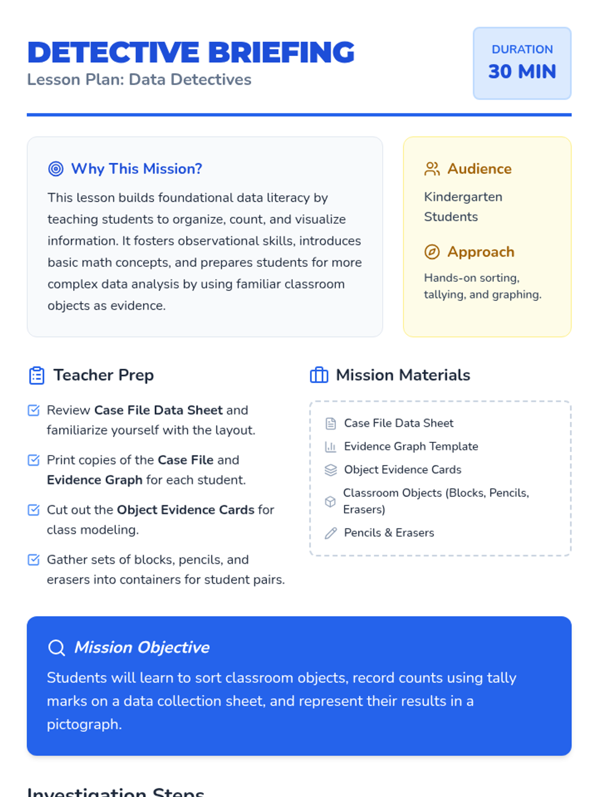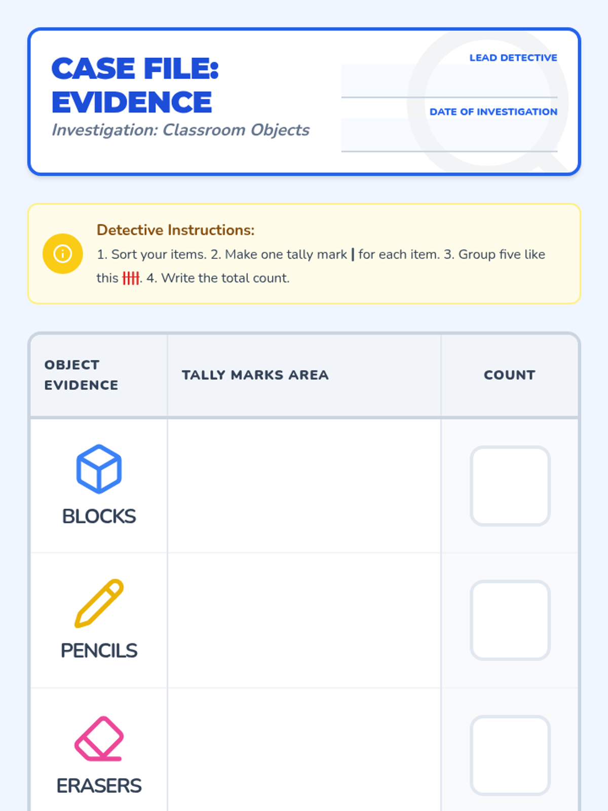 In this 30-minute kindergarten lesson, students become Data Detectives to collect and record simple data by sorting classroom objects. Students will learn to use tally marks and represent their findings in a pictograph.