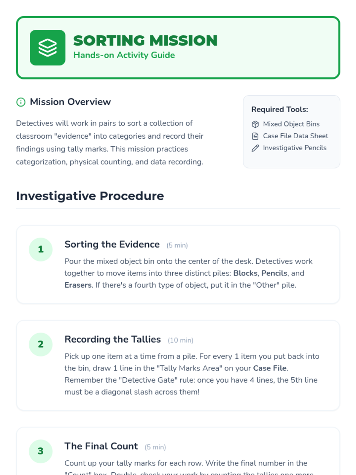 An observational hunt where students tally items in their environment to practice real-time data recording.
