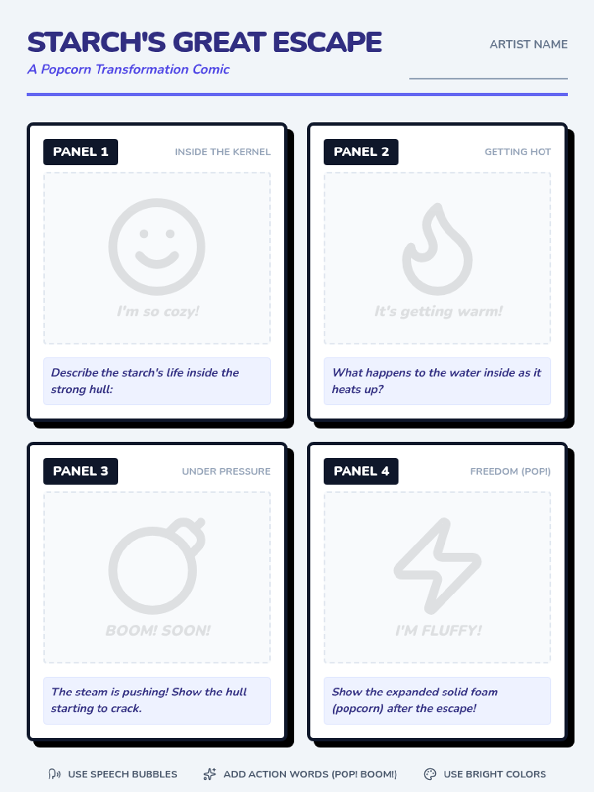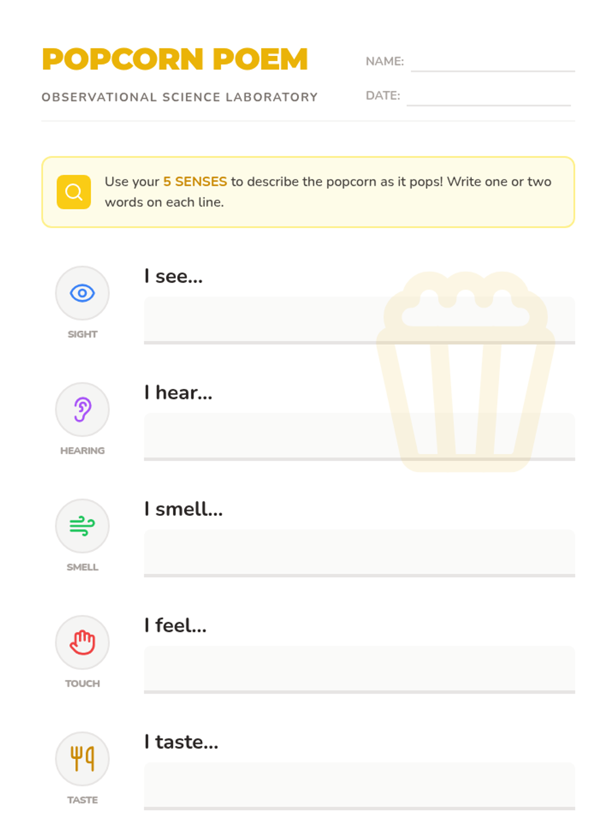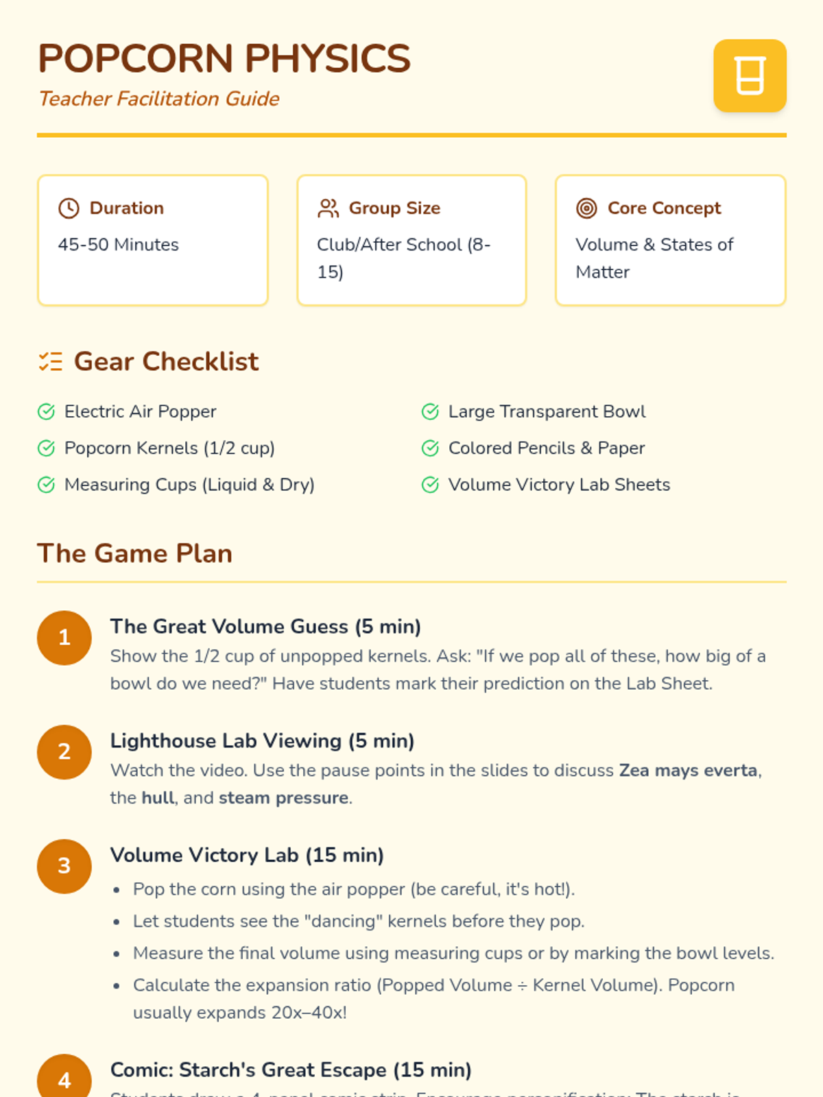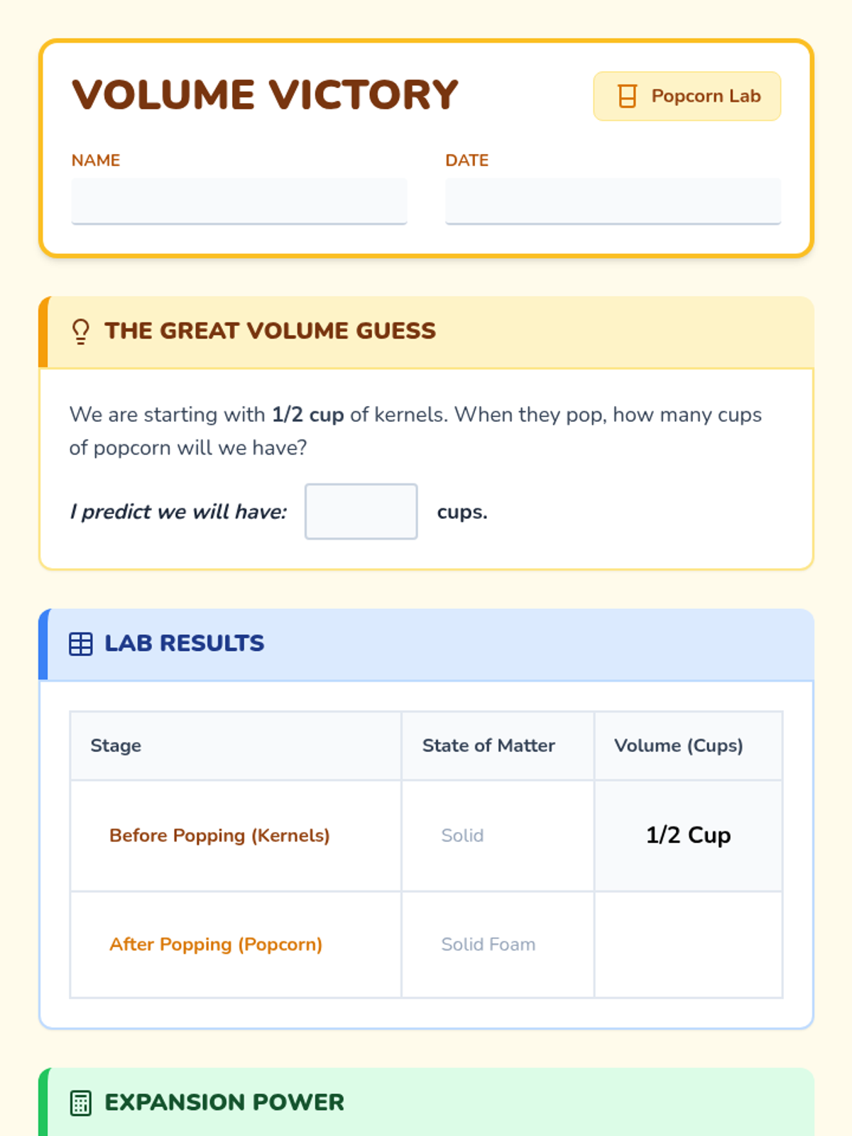 A fun, hands-on exploration of states of matter and volume expansion through the science of popcorn. Students predict, observe, and measure the physical change from hard kernels to fluffy foam.