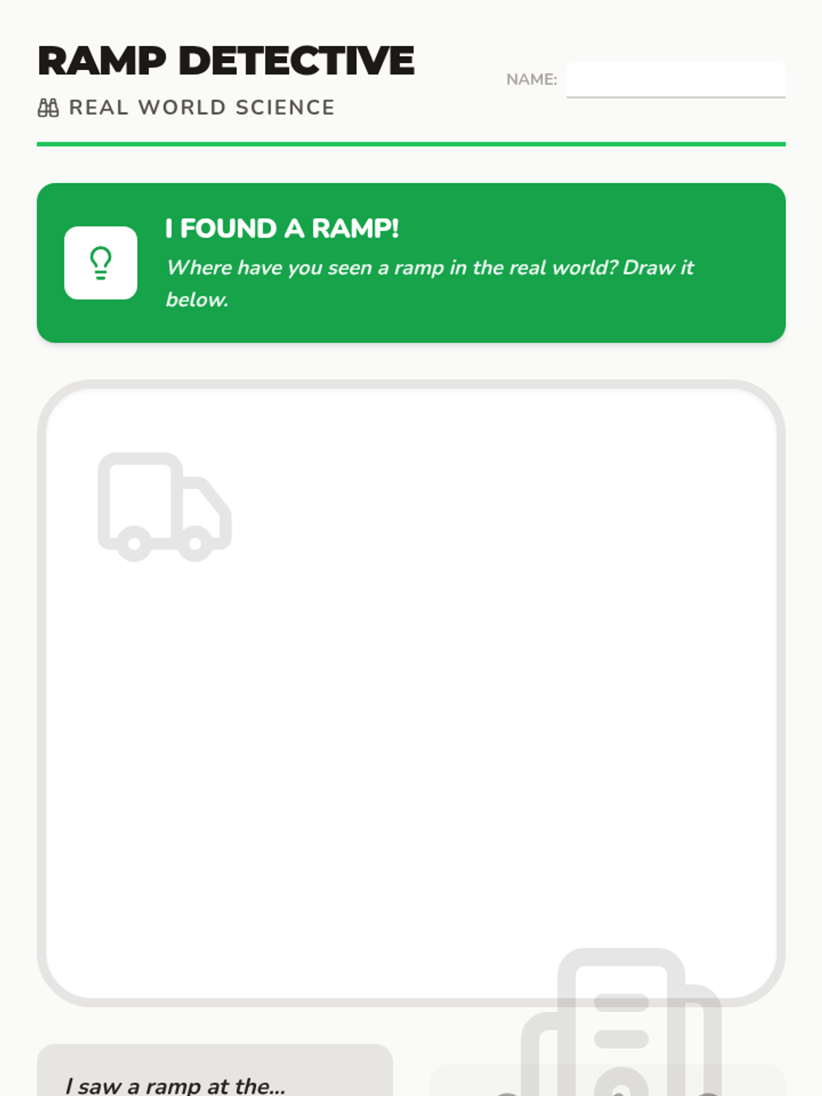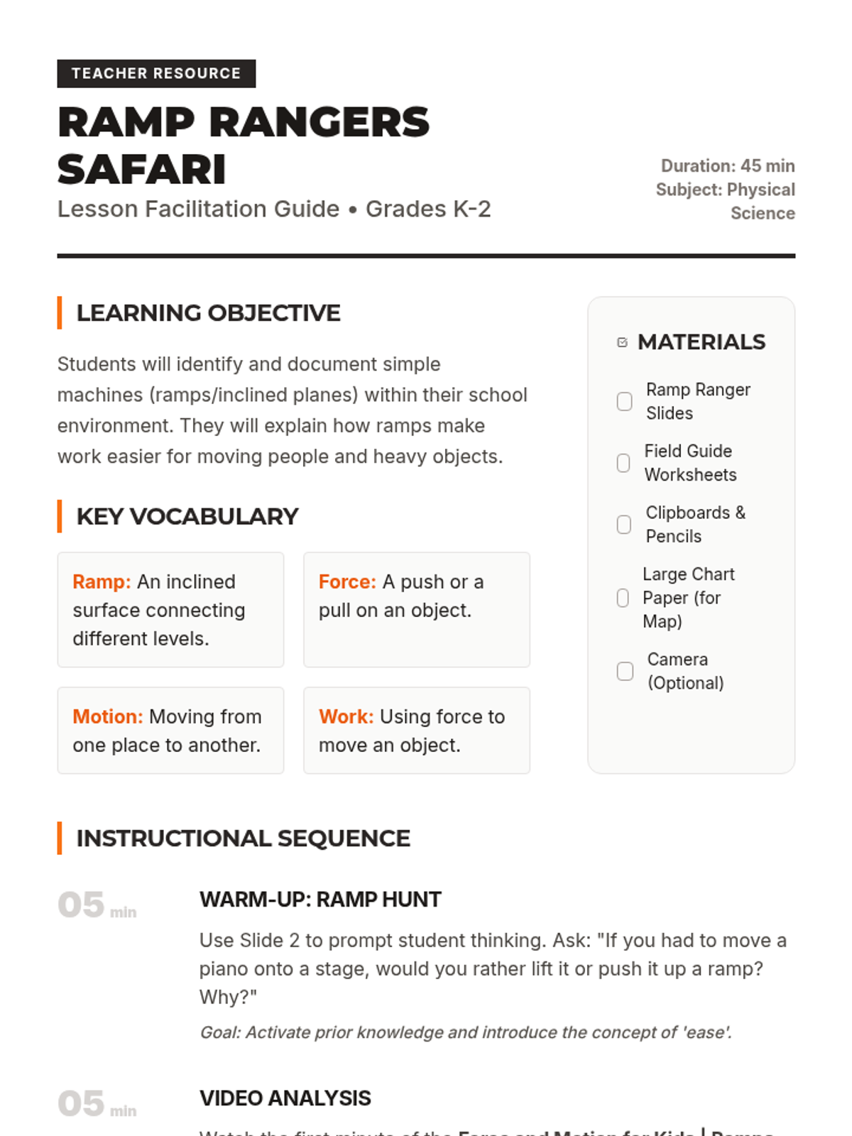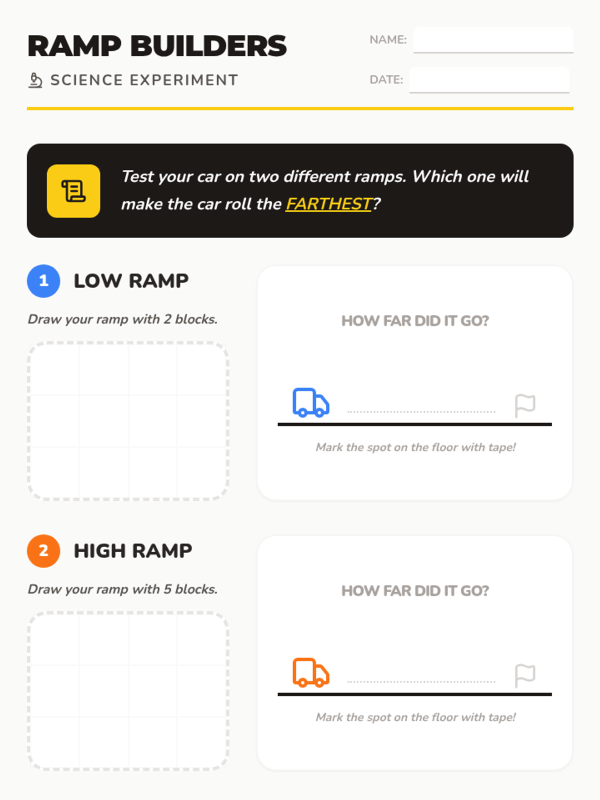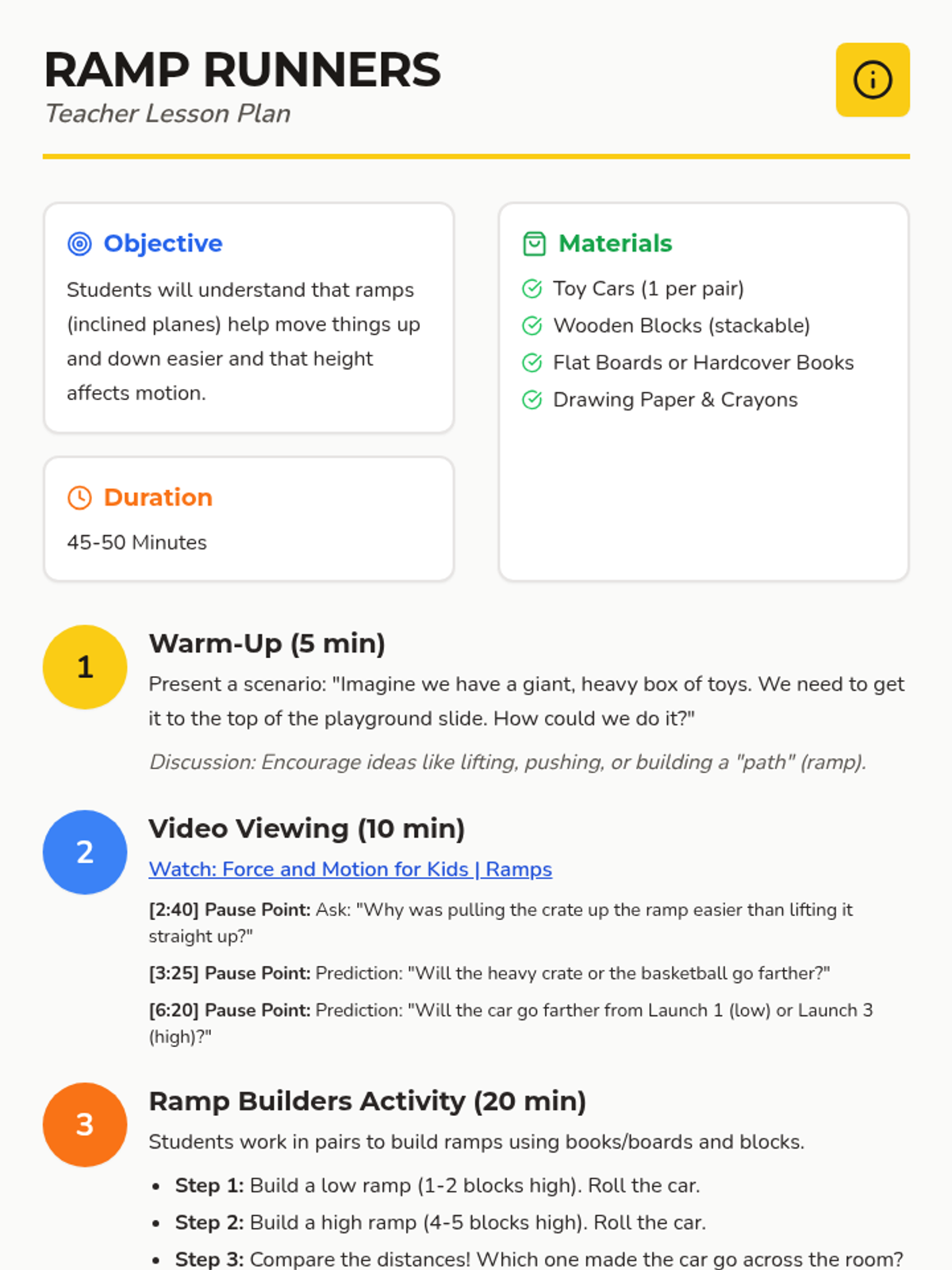 A hands-on science lesson for K-1 students exploring how ramps (inclined planes) make moving heavy objects easier and how height affects the distance an object travels.