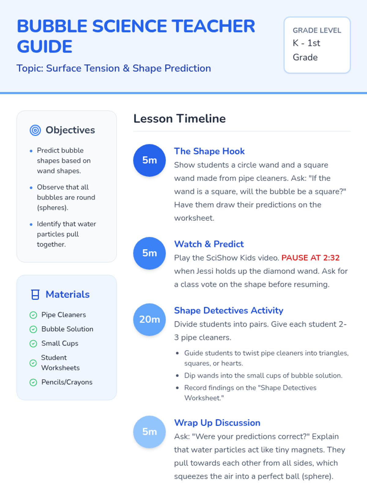 A playful science and mindfulness lesson for Pre-K and Kindergarten students focused on breath control and observation through the magic of bubbles. Students learn the physics of why bubbles are round and practice the art of gentle 'Dragon Breaths' to create them.