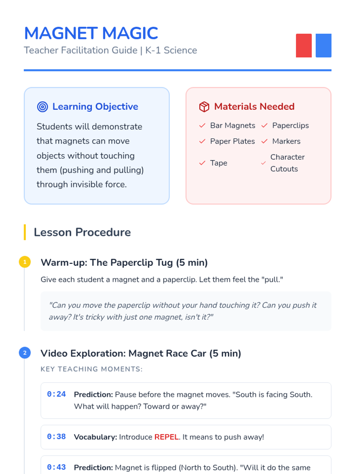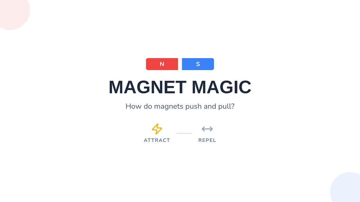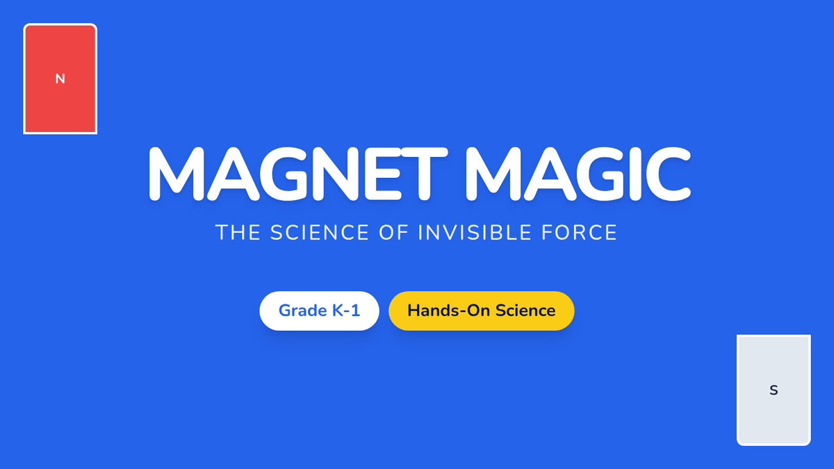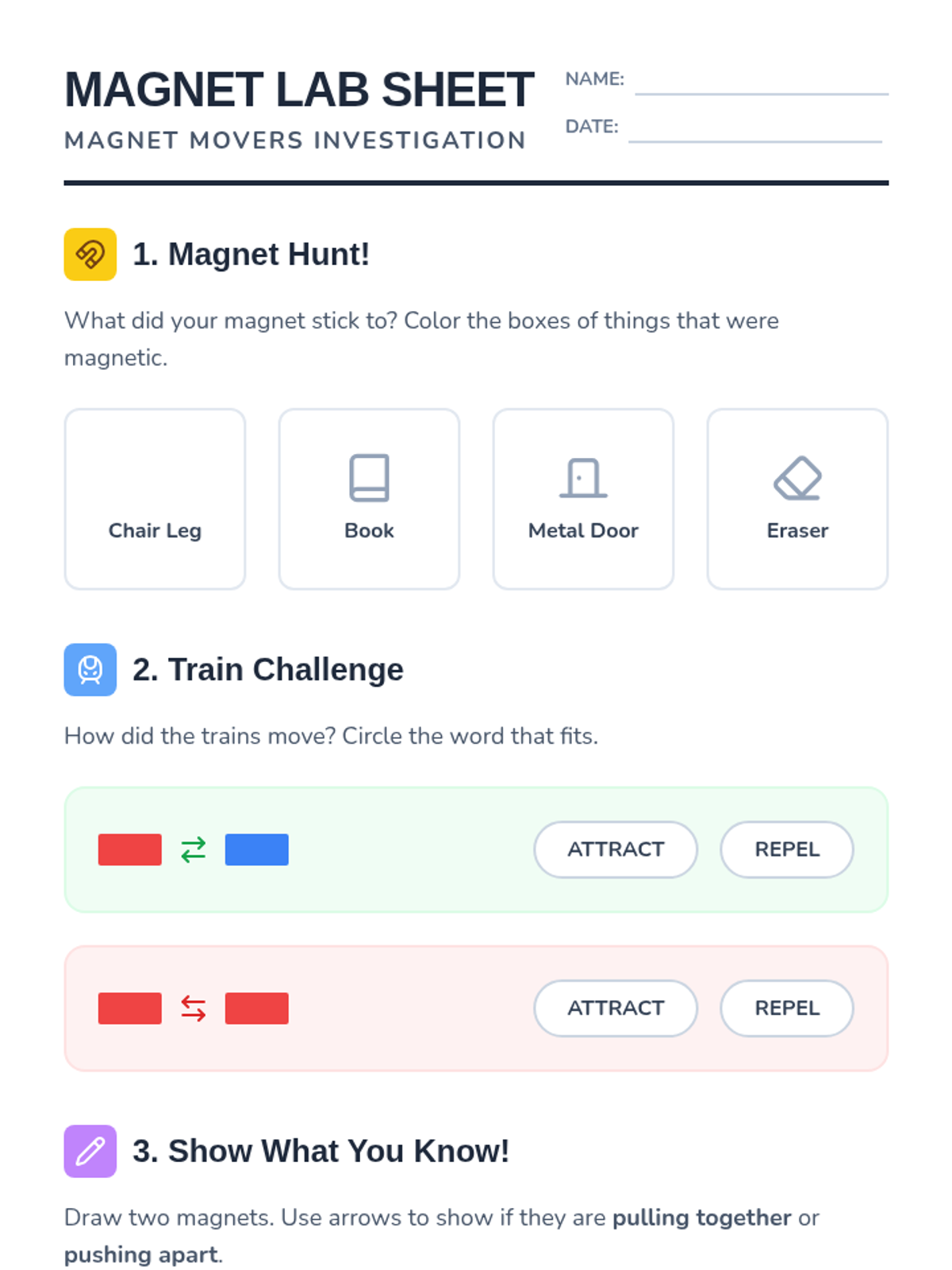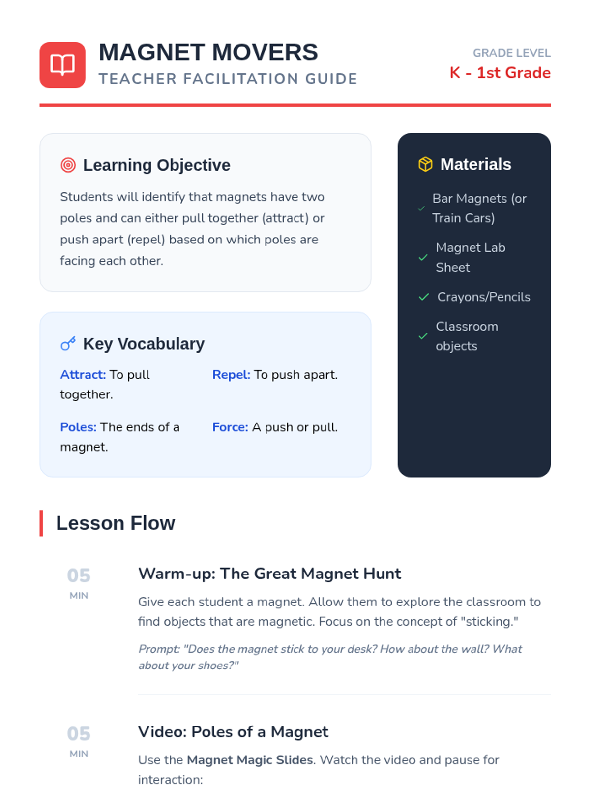An introductory lesson for Kindergarten and 1st-grade students to explore magnetic forces. Students will learn the concepts of 'attract' and 'repel' through a guided video viewing, hands-on experimentation with magnetic trains, and a classroom scavenger hunt.