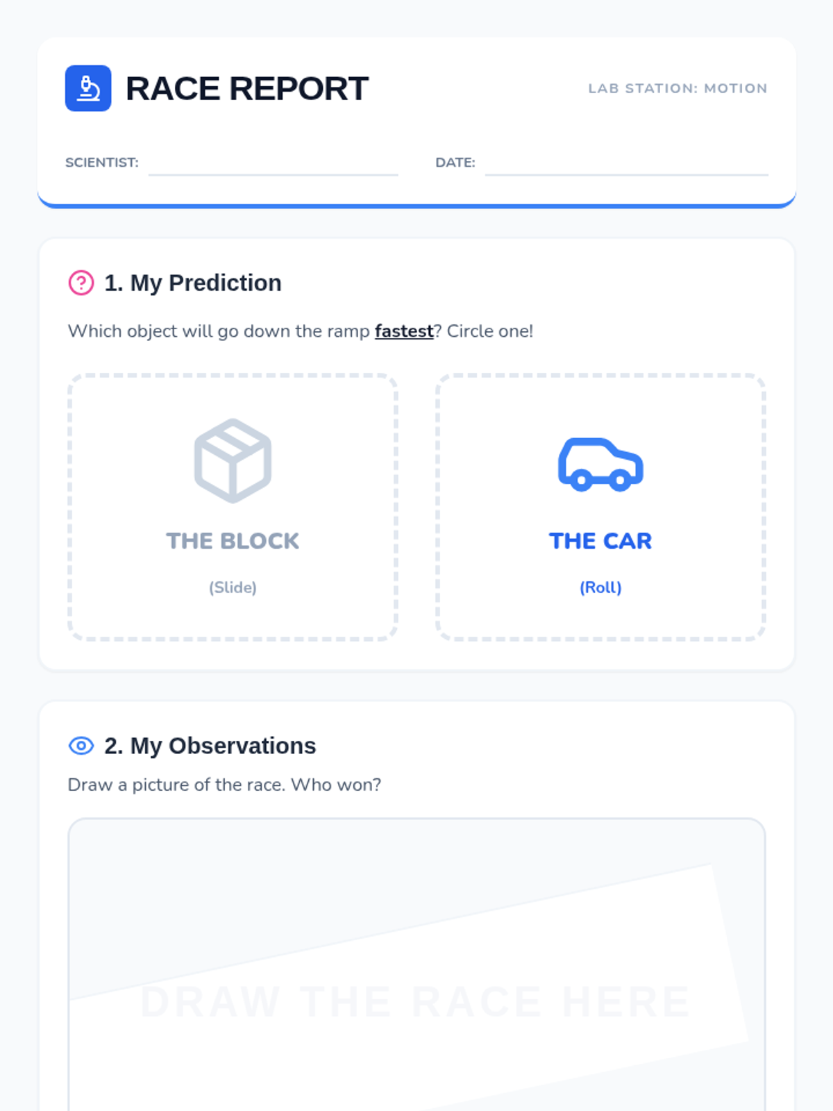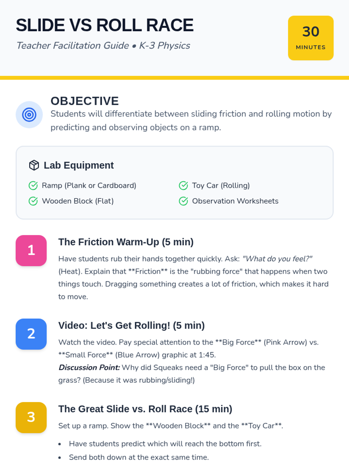 A hands-on physics lesson for K-3 students exploring how wheels reduce friction by comparing sliding and rolling motion through an experimental race.