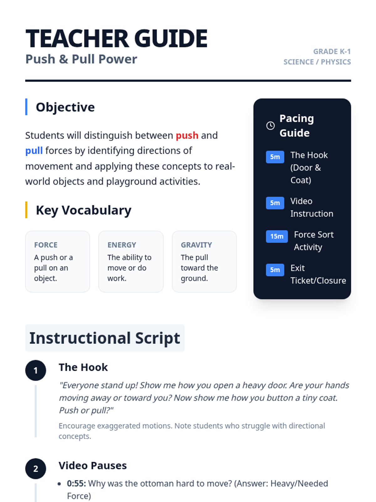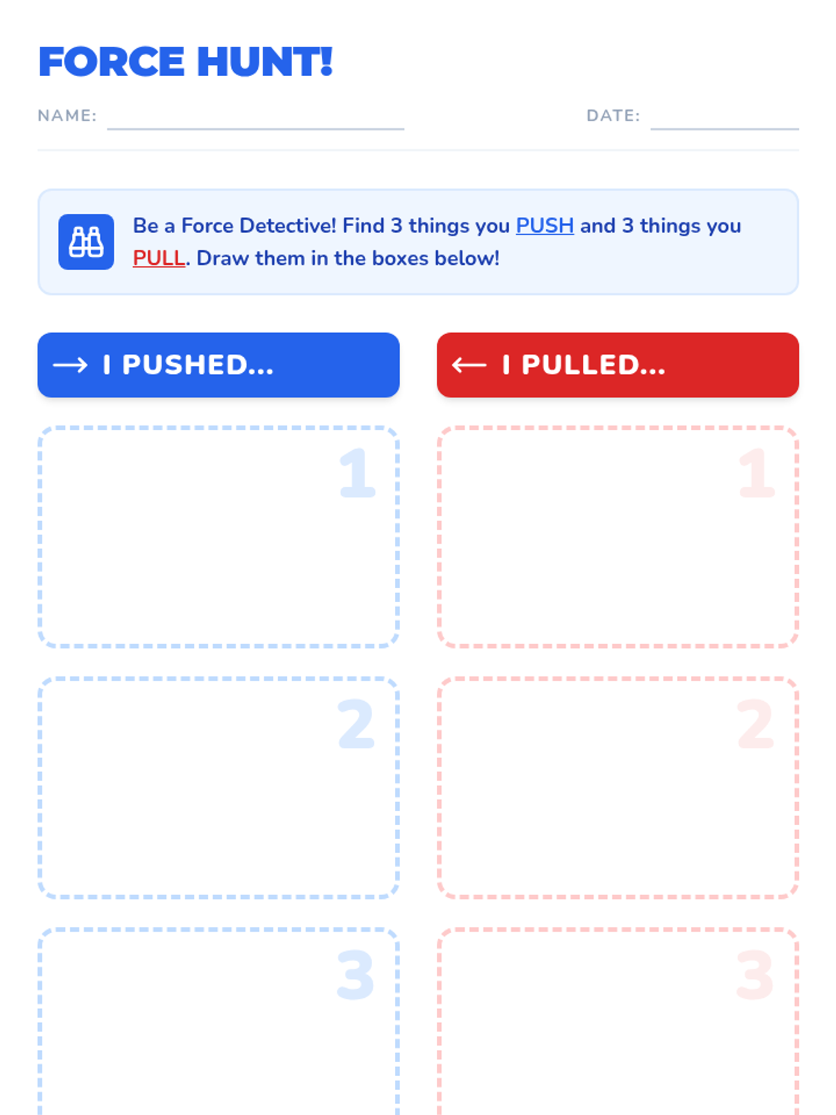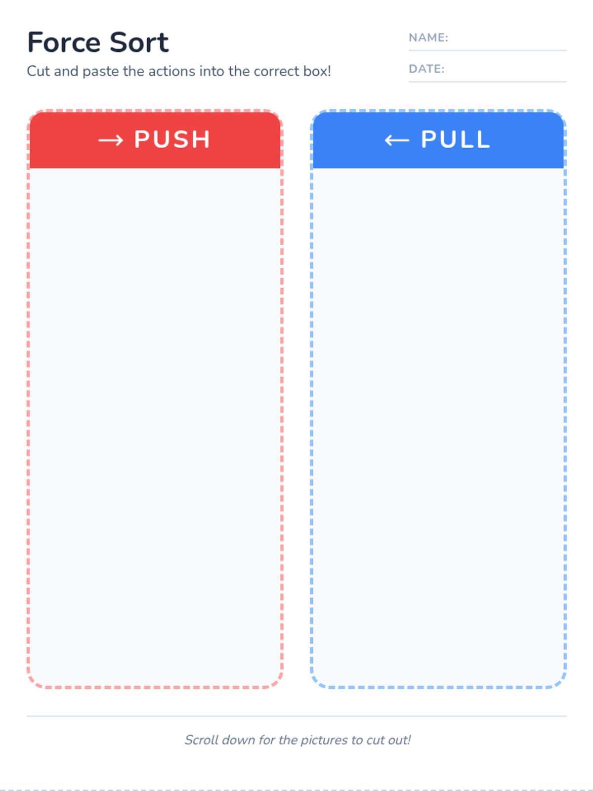 Students will explore the physics of motion by distinguishing between push and pull forces using real-world examples, interactive demonstrations, and a video-guided sorting activity.