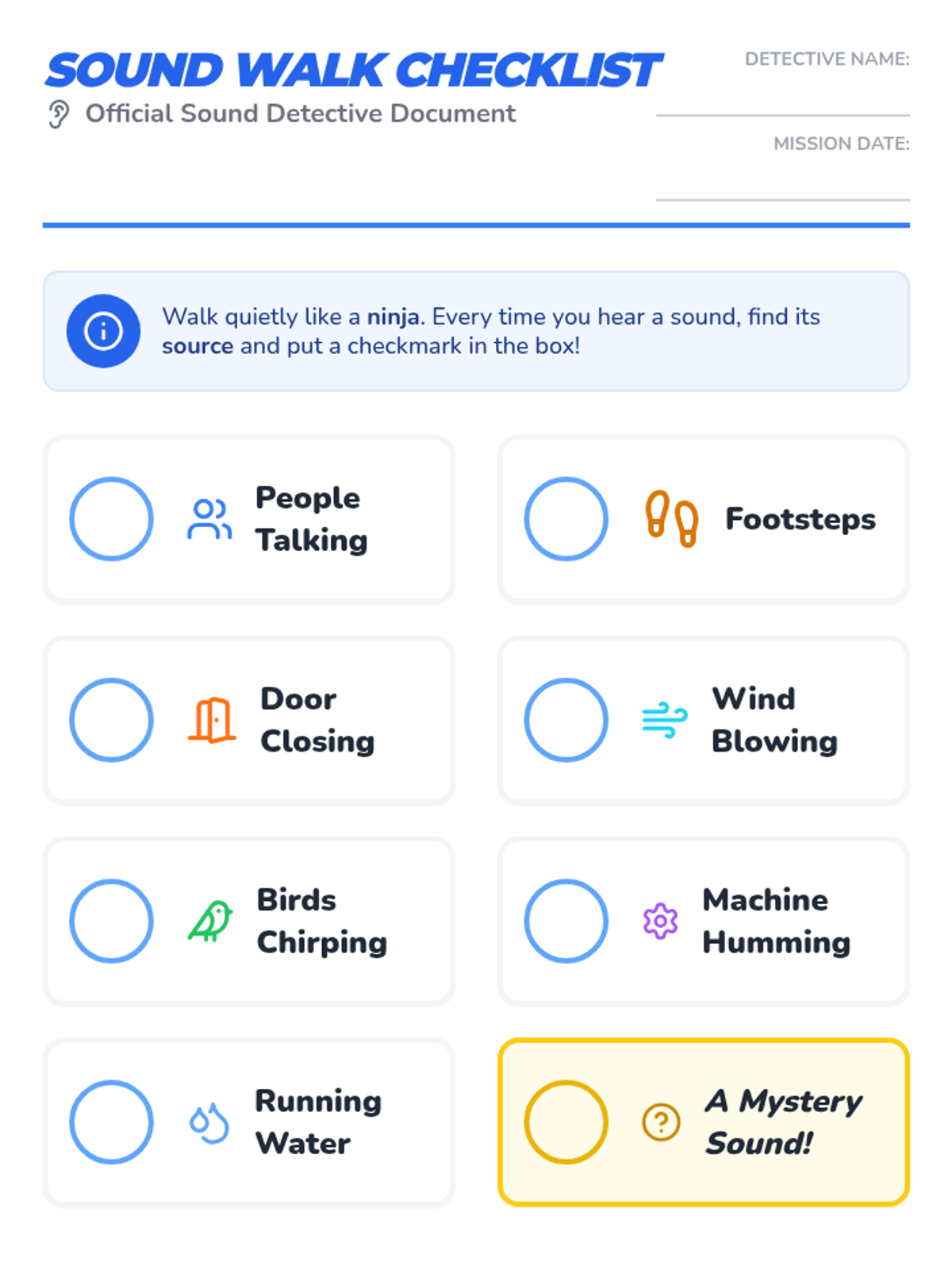 An introductory science lesson for Kindergarten and 1st Grade students to identify and categorize various sound sources in their environment through a 'Sound Walk' activity.