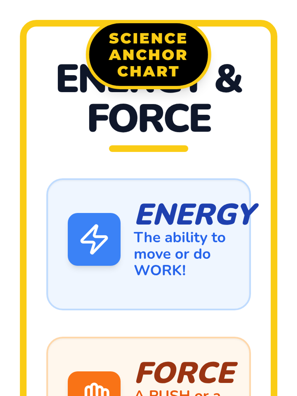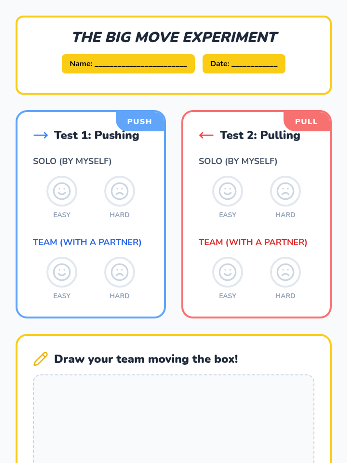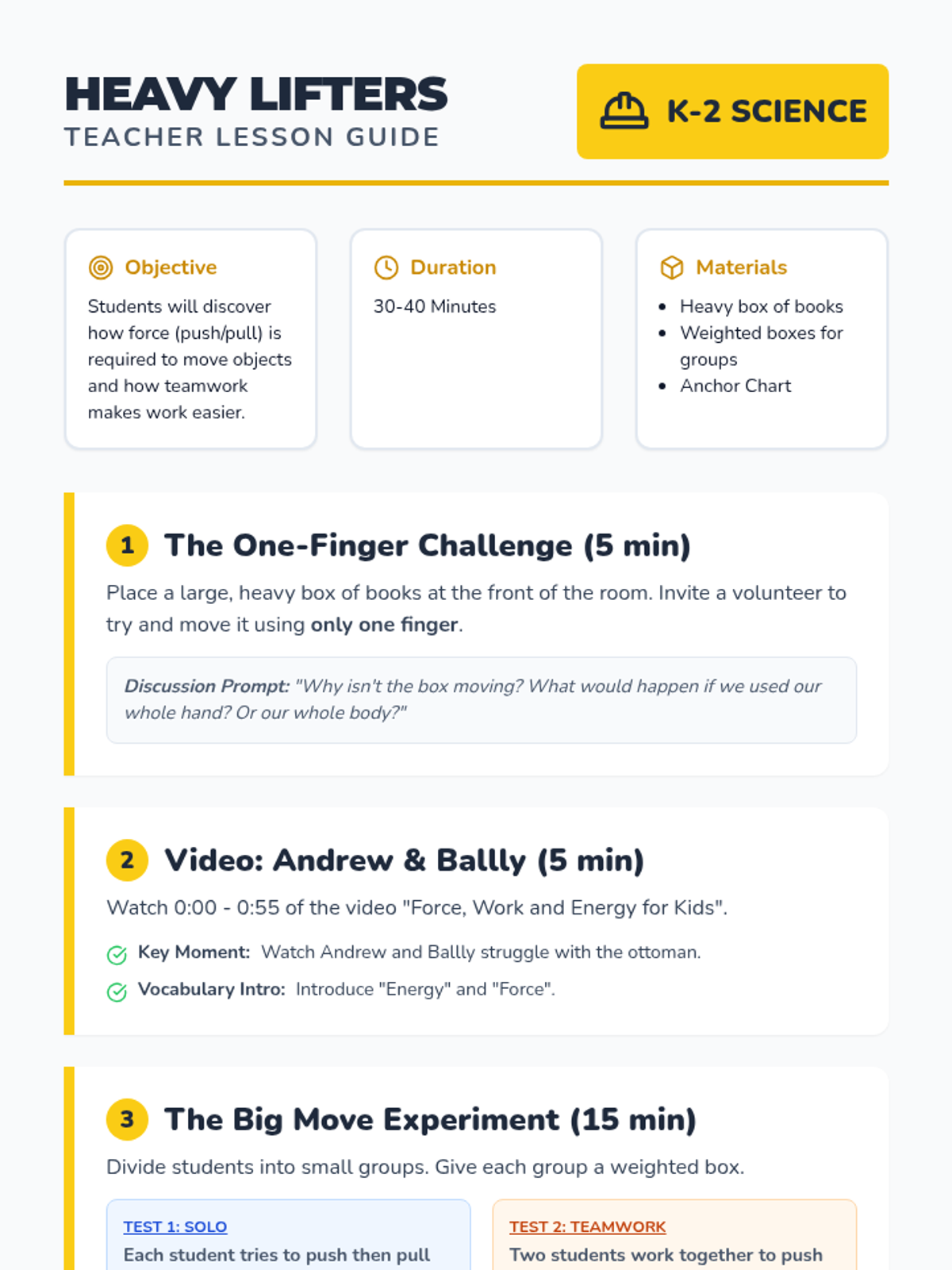 A hands-on physics lesson for K-2 students exploring the concepts of force (pushing and pulling), energy, and the power of teamwork to move heavy objects. Students will experiment with moving weighted boxes and connect their findings to real-world examples.