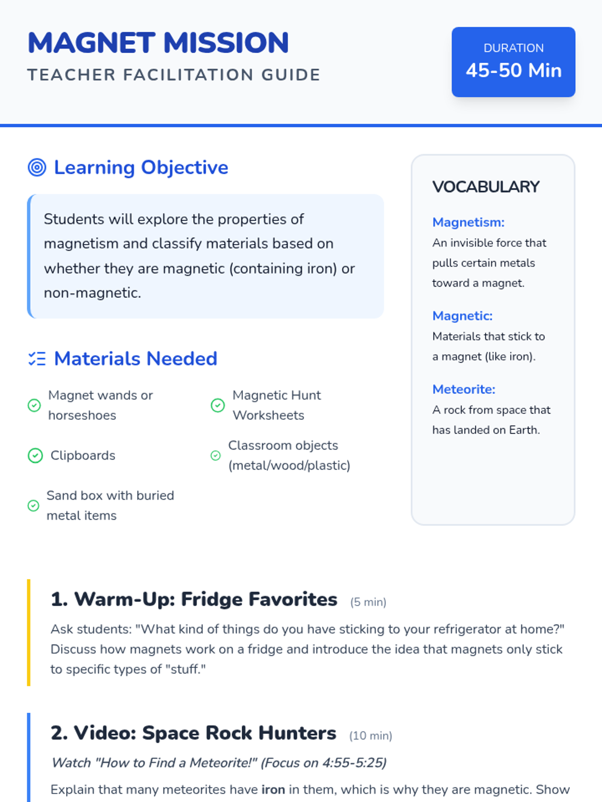 A hands-on science lesson where students explore the properties of magnetism through the lens of meteorite hunting, using a scavenger hunt to classify classroom objects.