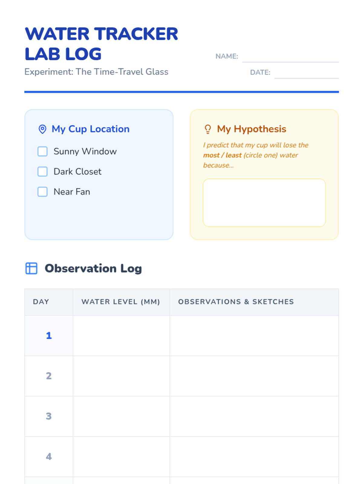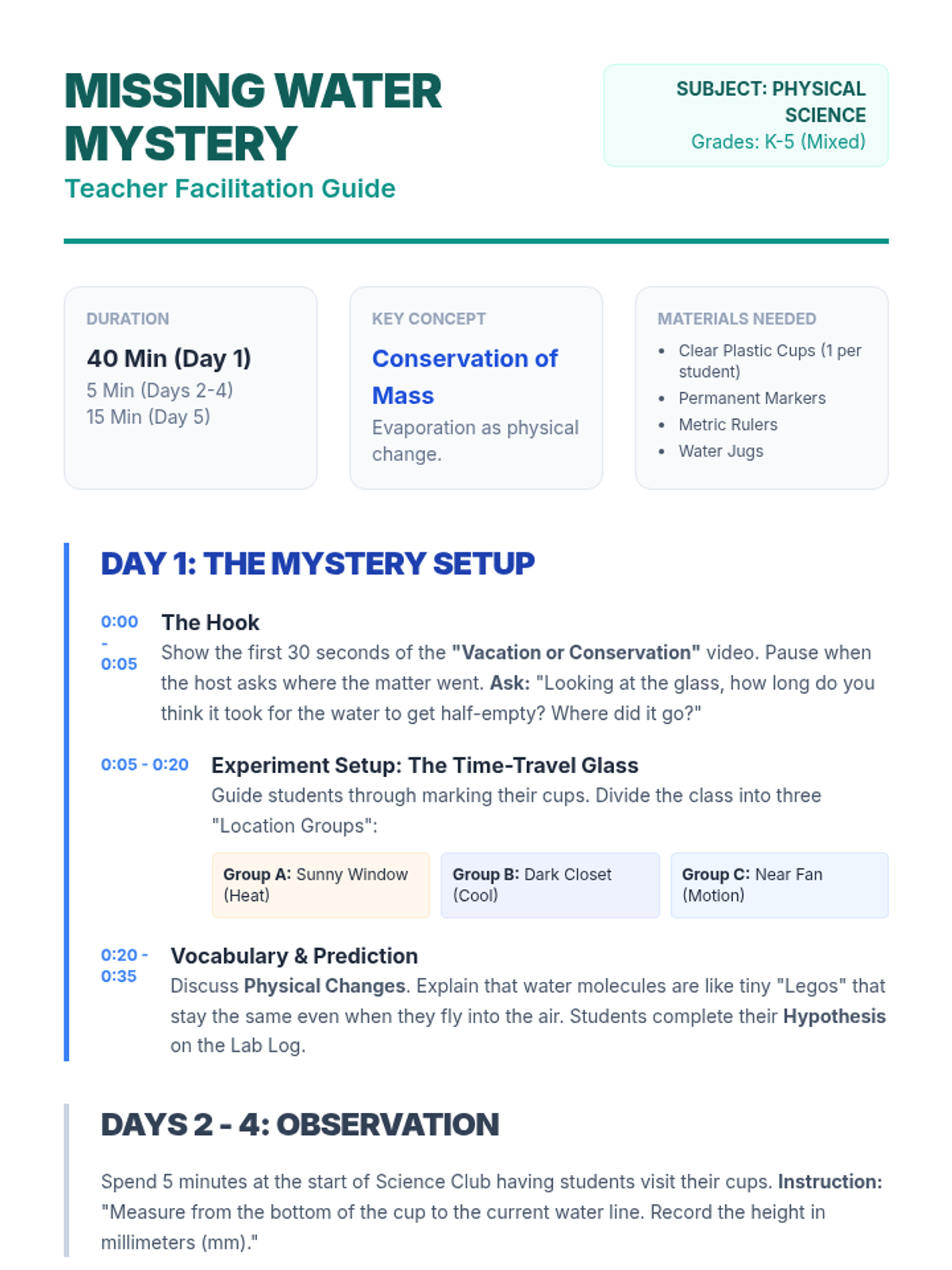 A hands-on experiment where students track evaporation rates across different environments to understand the conservation of mass and the behavior of water molecules.