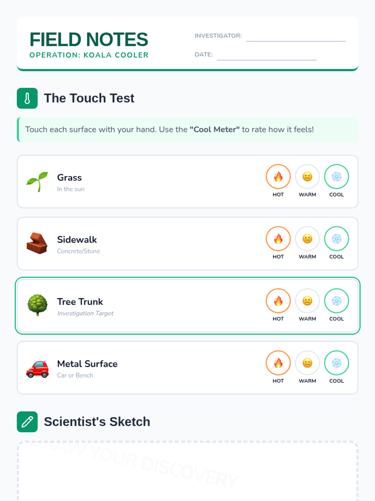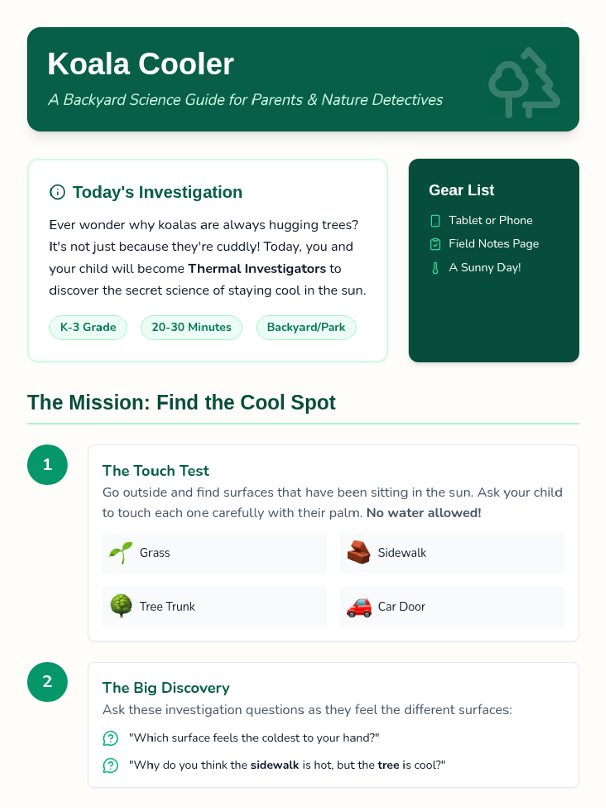 A hands-on backyard science investigation for parents and children (K-3) to explore how animals stay cool, centered on the unique adaptation of koalas hugging trees.