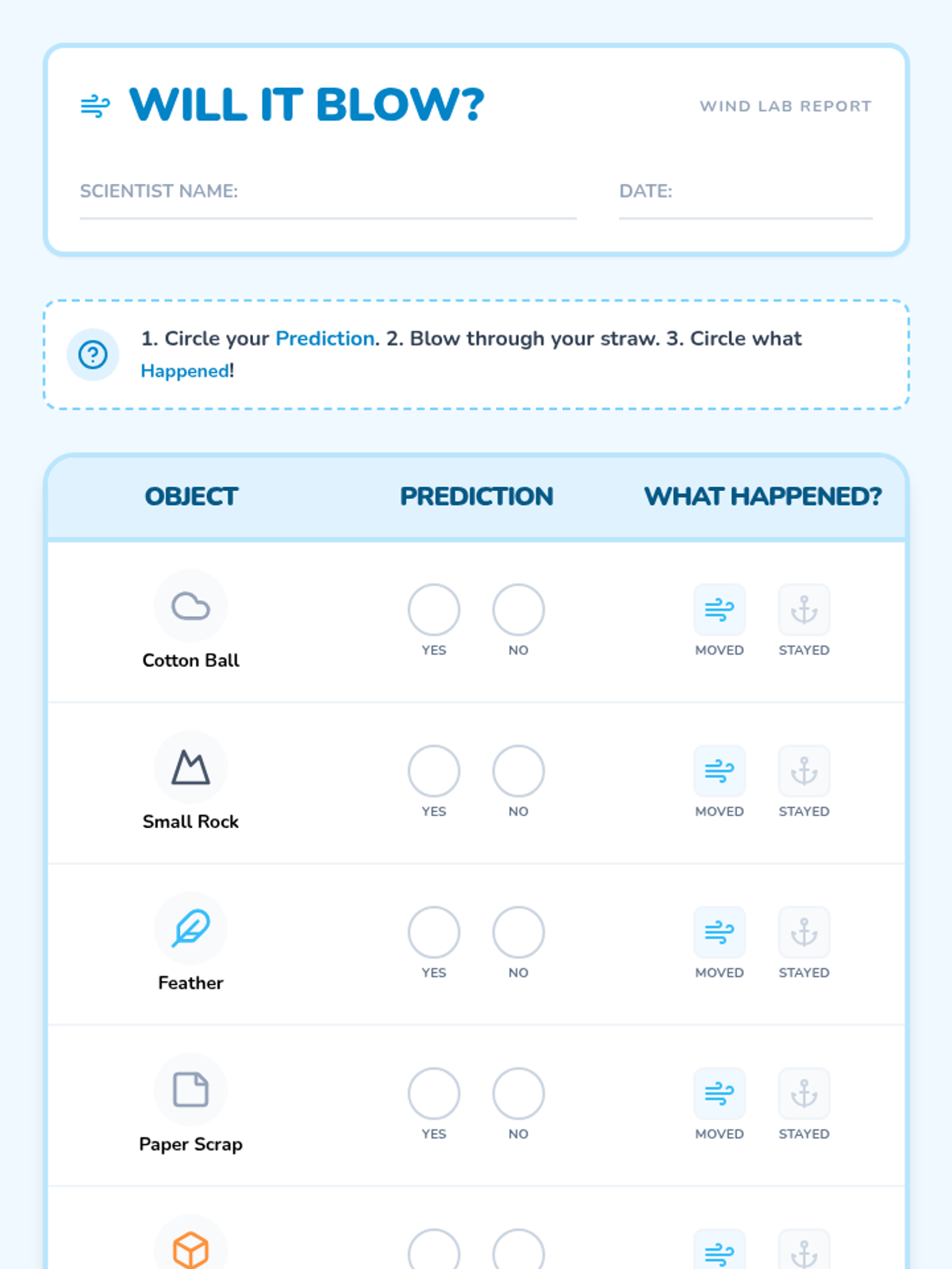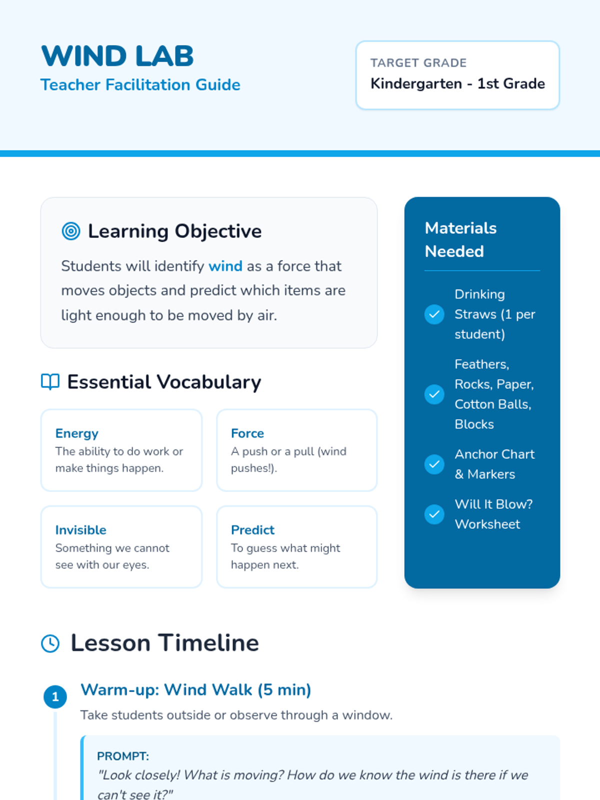 A Kindergarten and 1st Grade lesson exploring wind as a physical force. Students observe wind in nature, watch a demonstration of wind energy, and conduct their own 'wind tunnel' experiments using straws to move objects of varying weights.