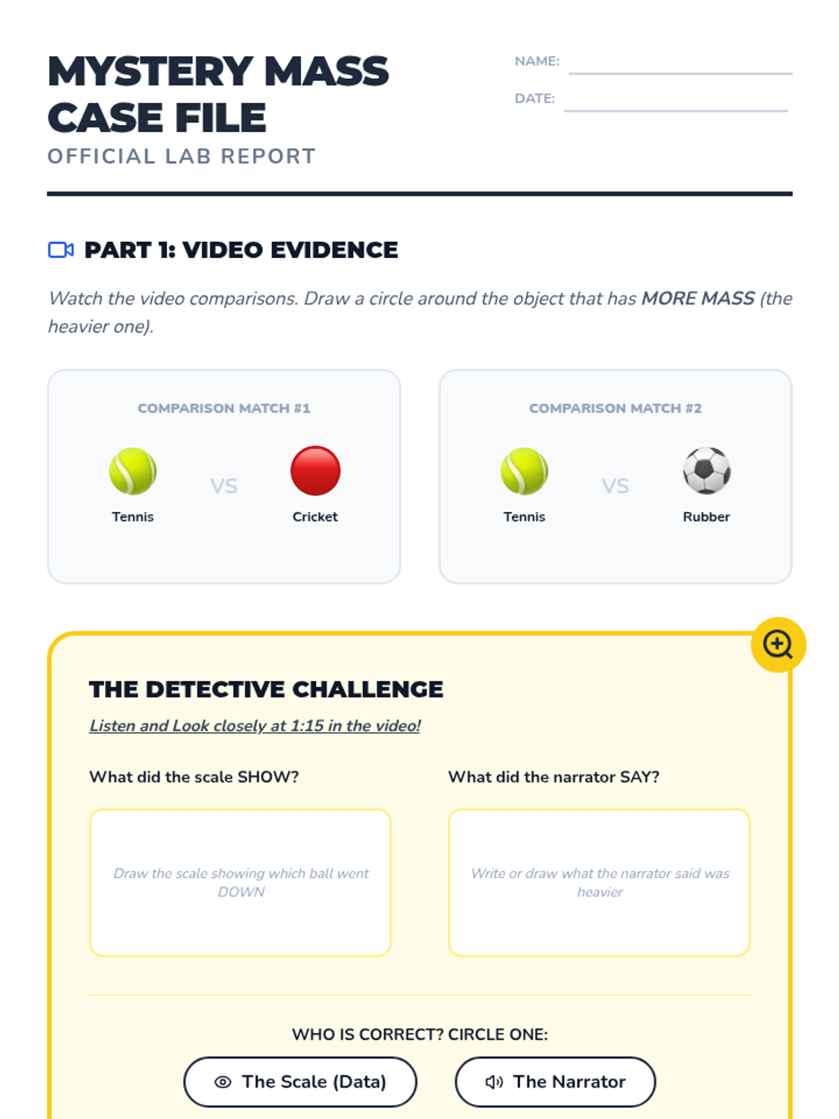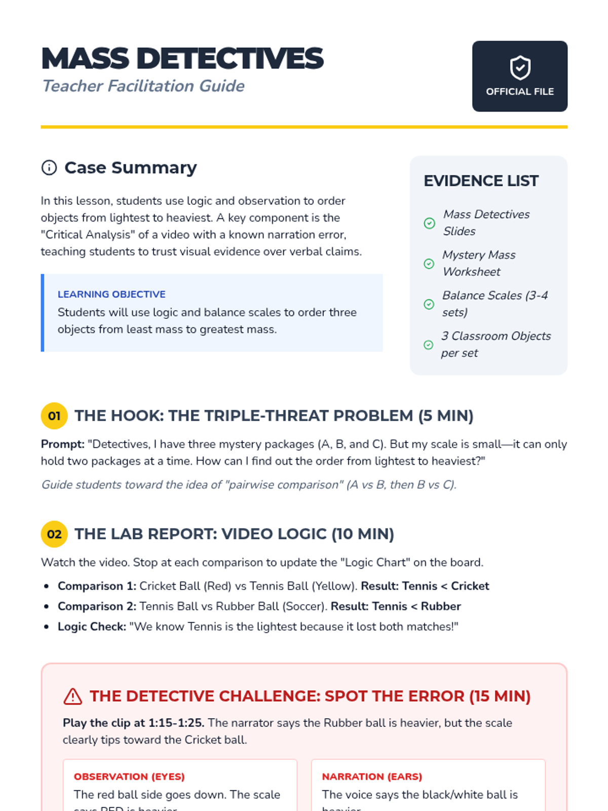 Students act as 'Science Detectives' to order objects by mass using a balance scale and logical reasoning, including a critical analysis of a video with a narration-visual discrepancy.