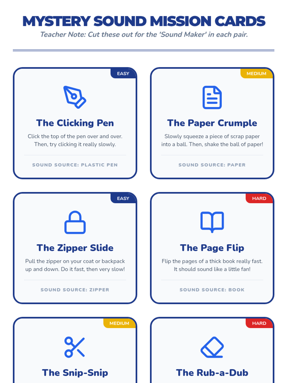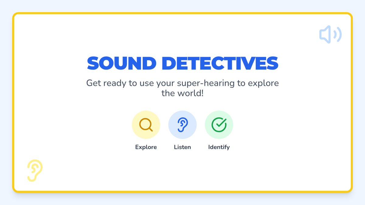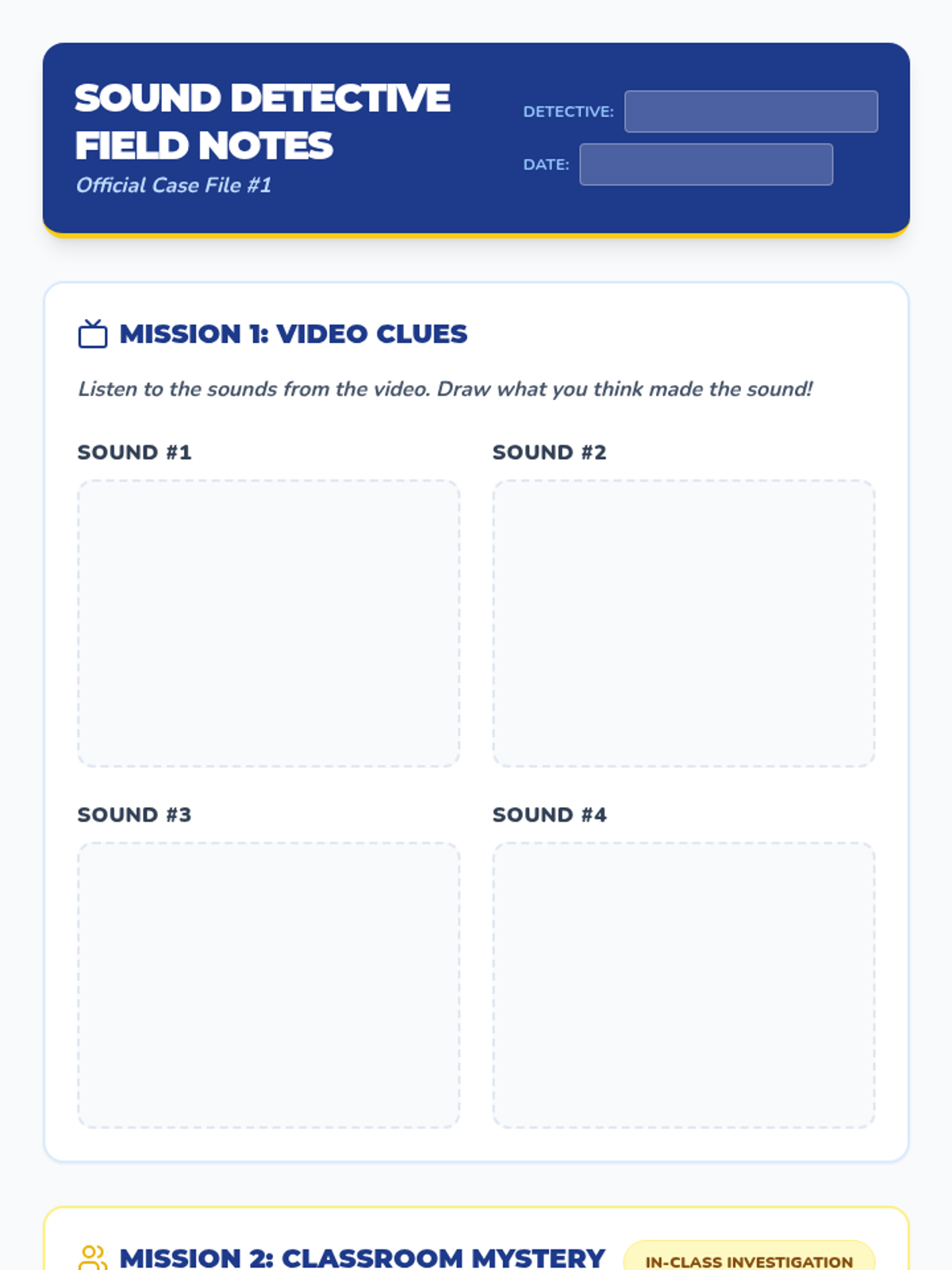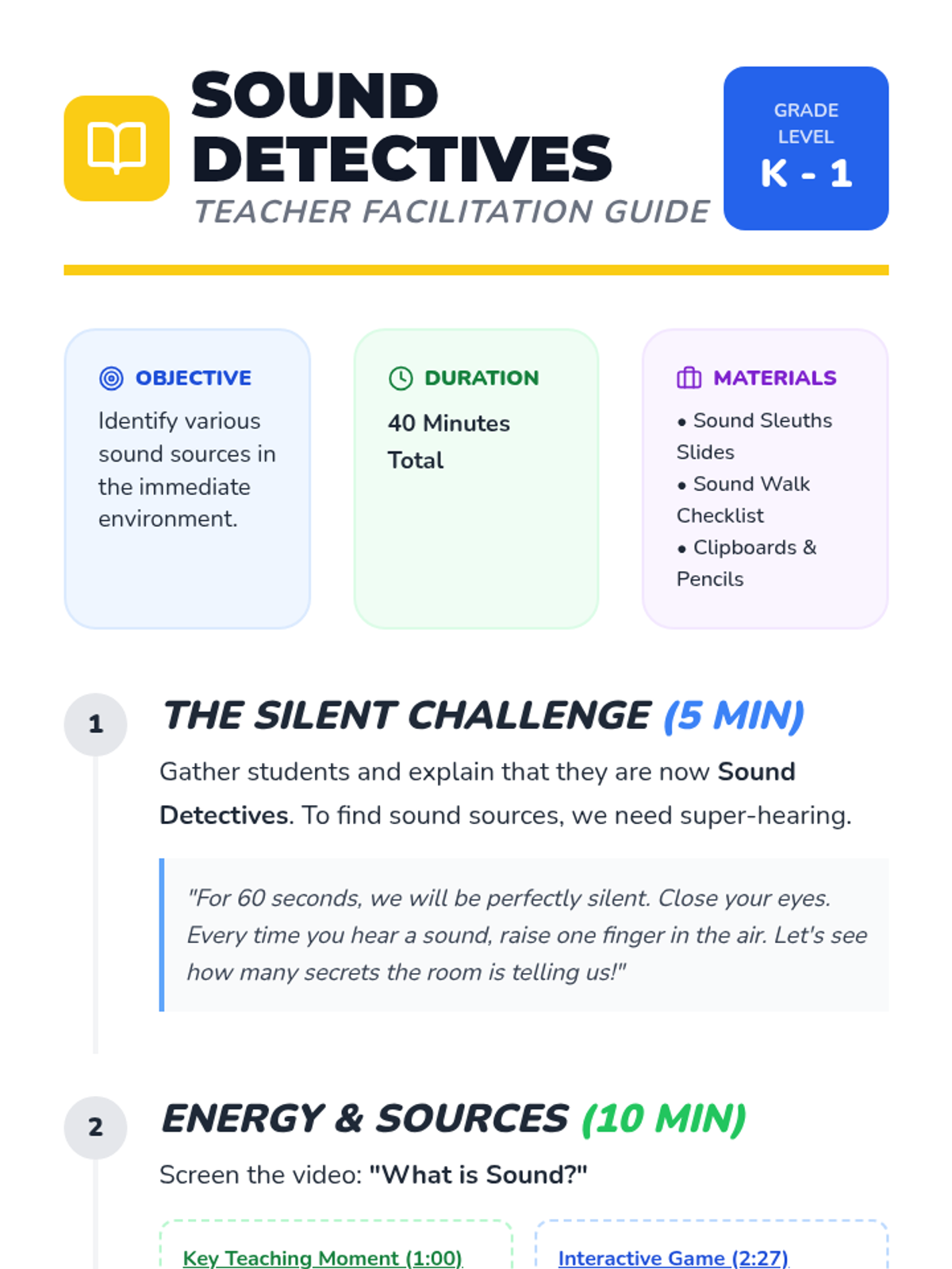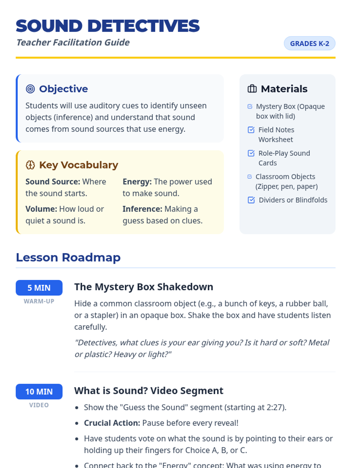 A Kindergarten to 2nd grade lesson focused on using auditory cues to identify unseen objects and understanding the concept of sound sources and energy. Students act as 'Sound Detectives' to investigate hidden sounds through a mystery box warm-up, an interactive video guessing game, and a collaborative hands-on activity.