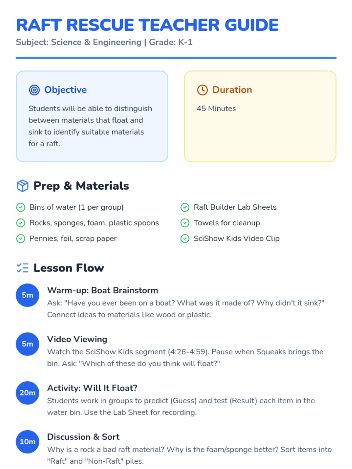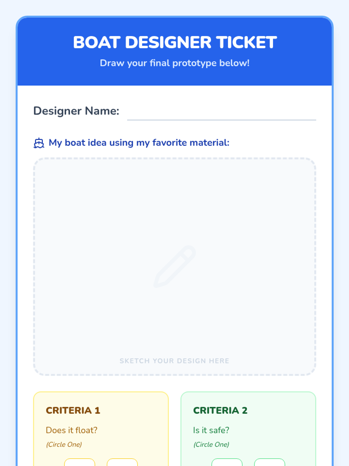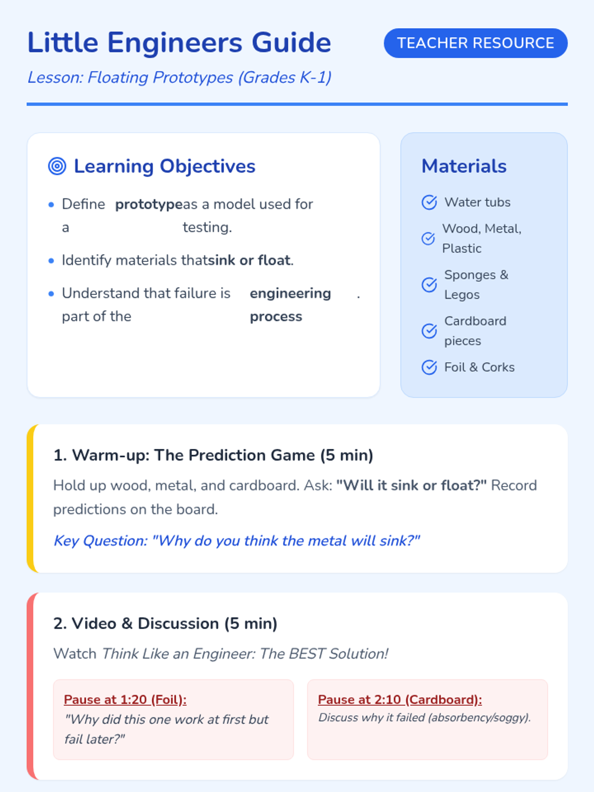 A hands-on engineering lesson for K-1 students focusing on the concept of prototypes and material properties like buoyancy and absorbency. Students test objects, watch a video about iteration, and design their own floating solutions.