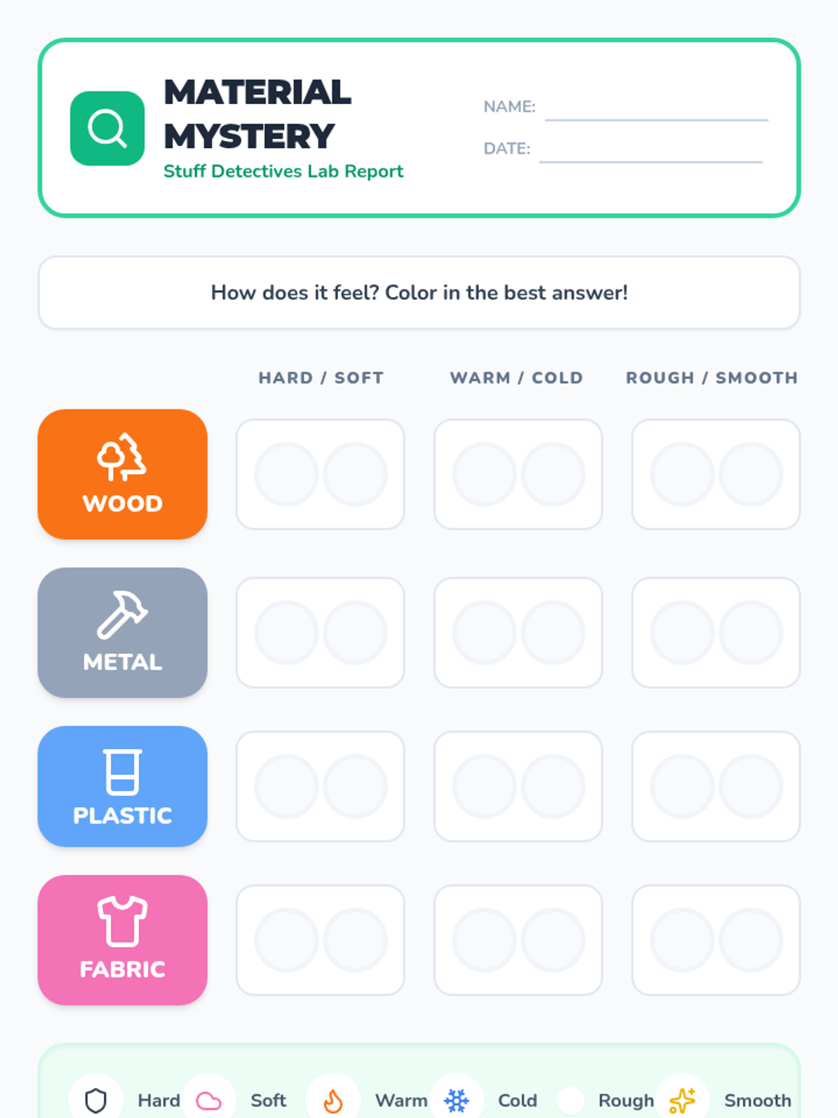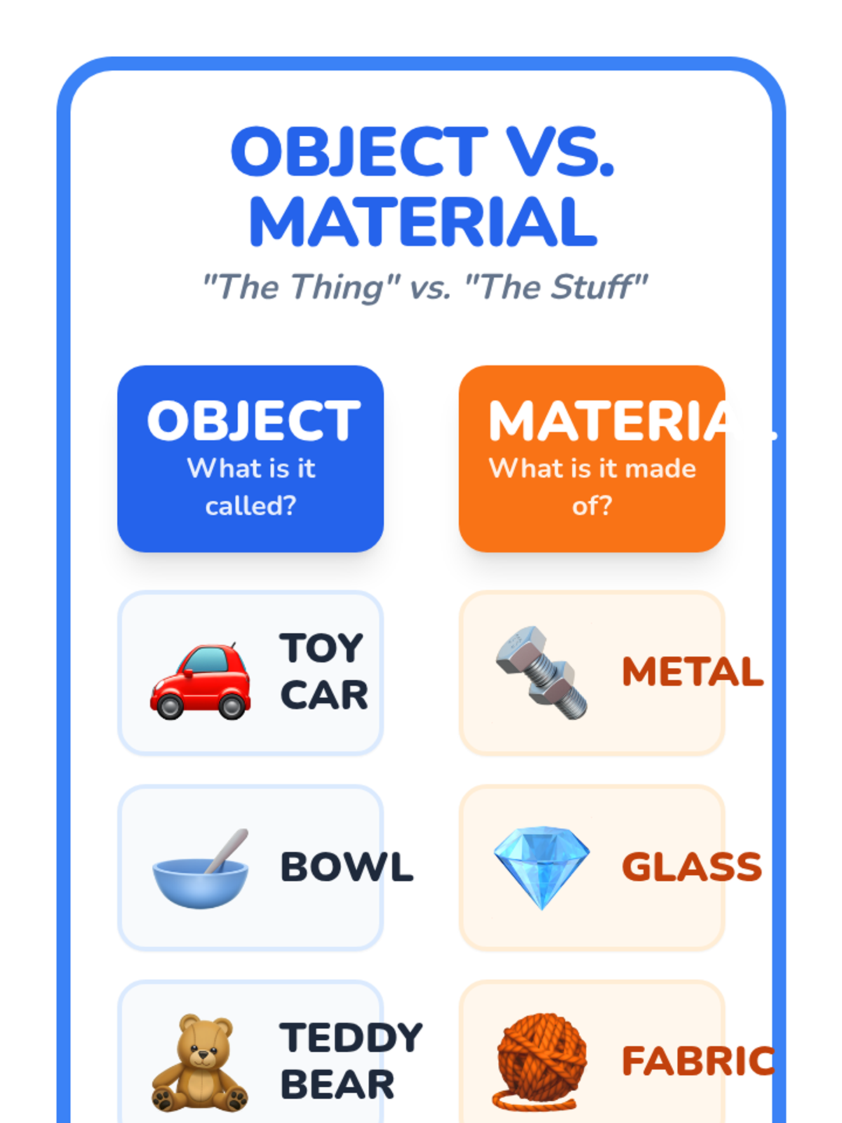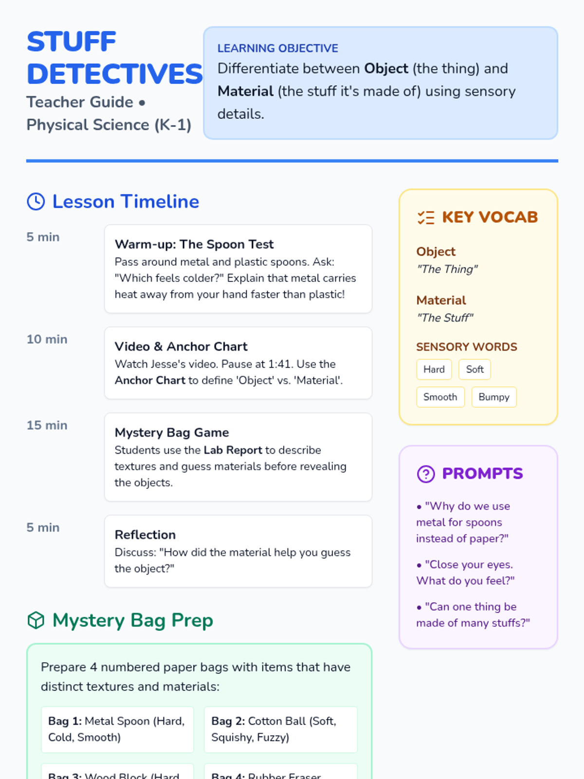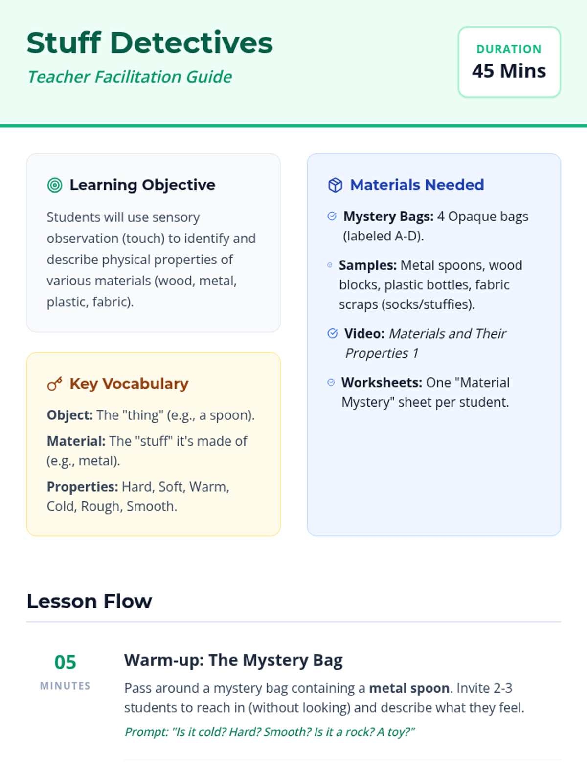 A foundational physical science lesson for K-1 students that uses sensory exploration and a mystery guessing game to distinguish between objects and the materials they are made of.
