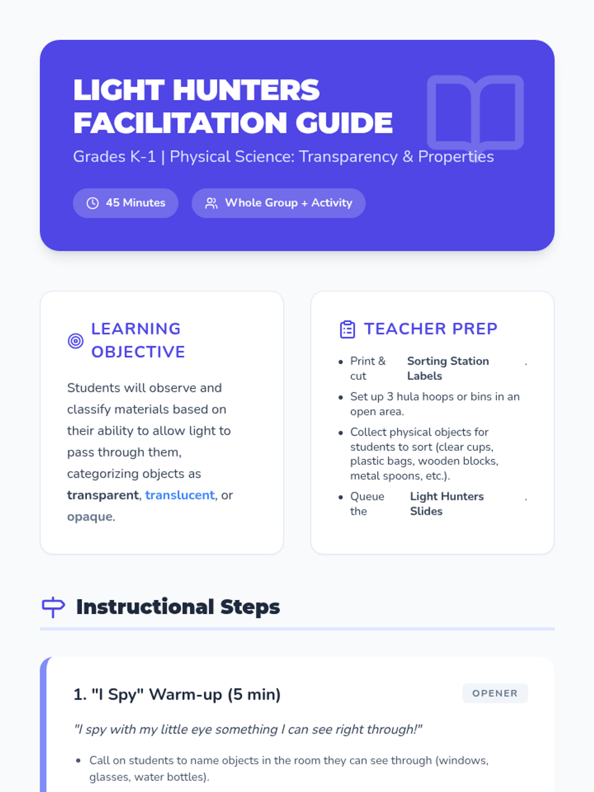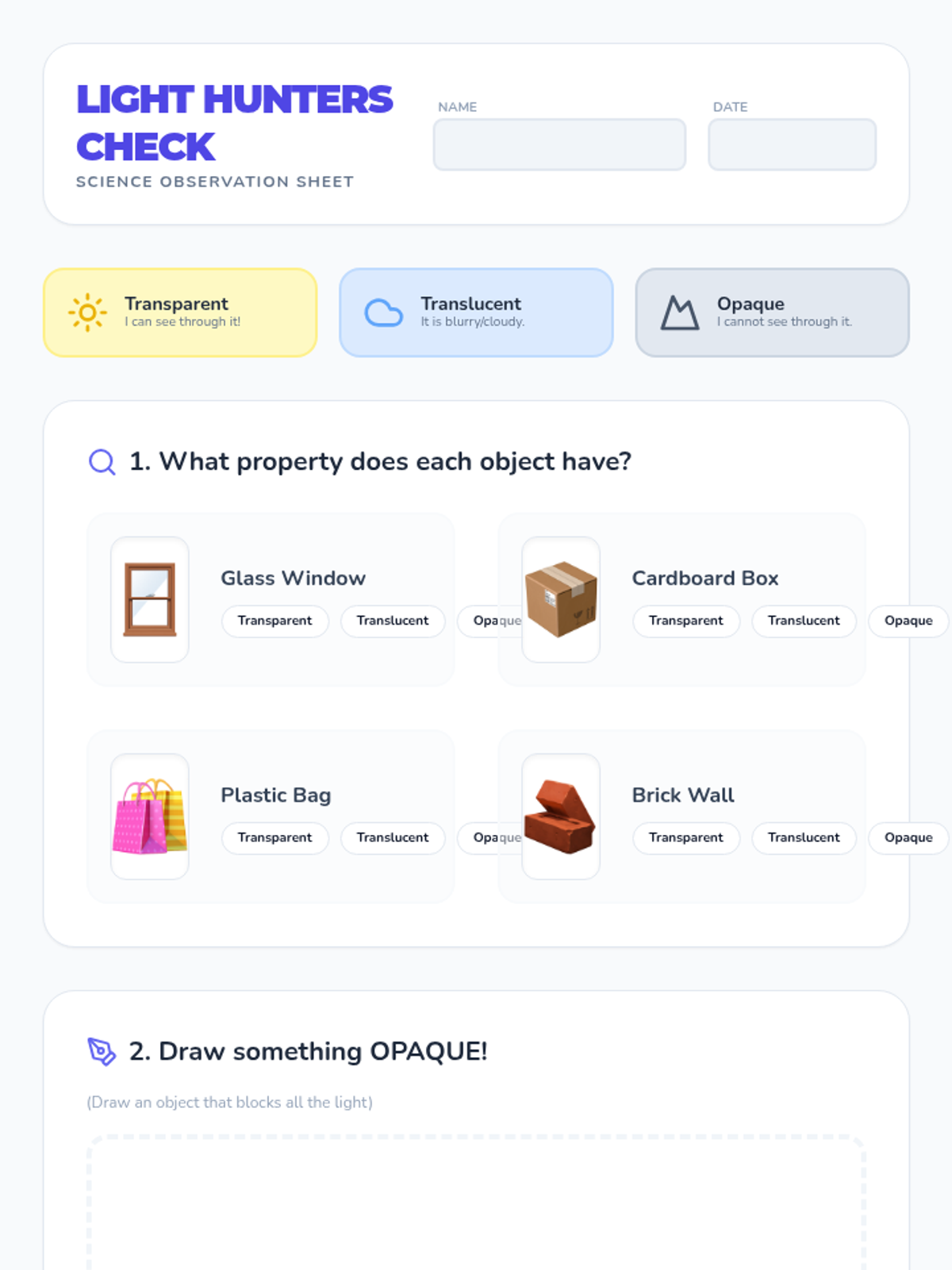 Students explore how light interacts with different materials by sorting objects into transparent, translucent, and opaque categories through a video-led discussion and a hands-on sorting station activity.