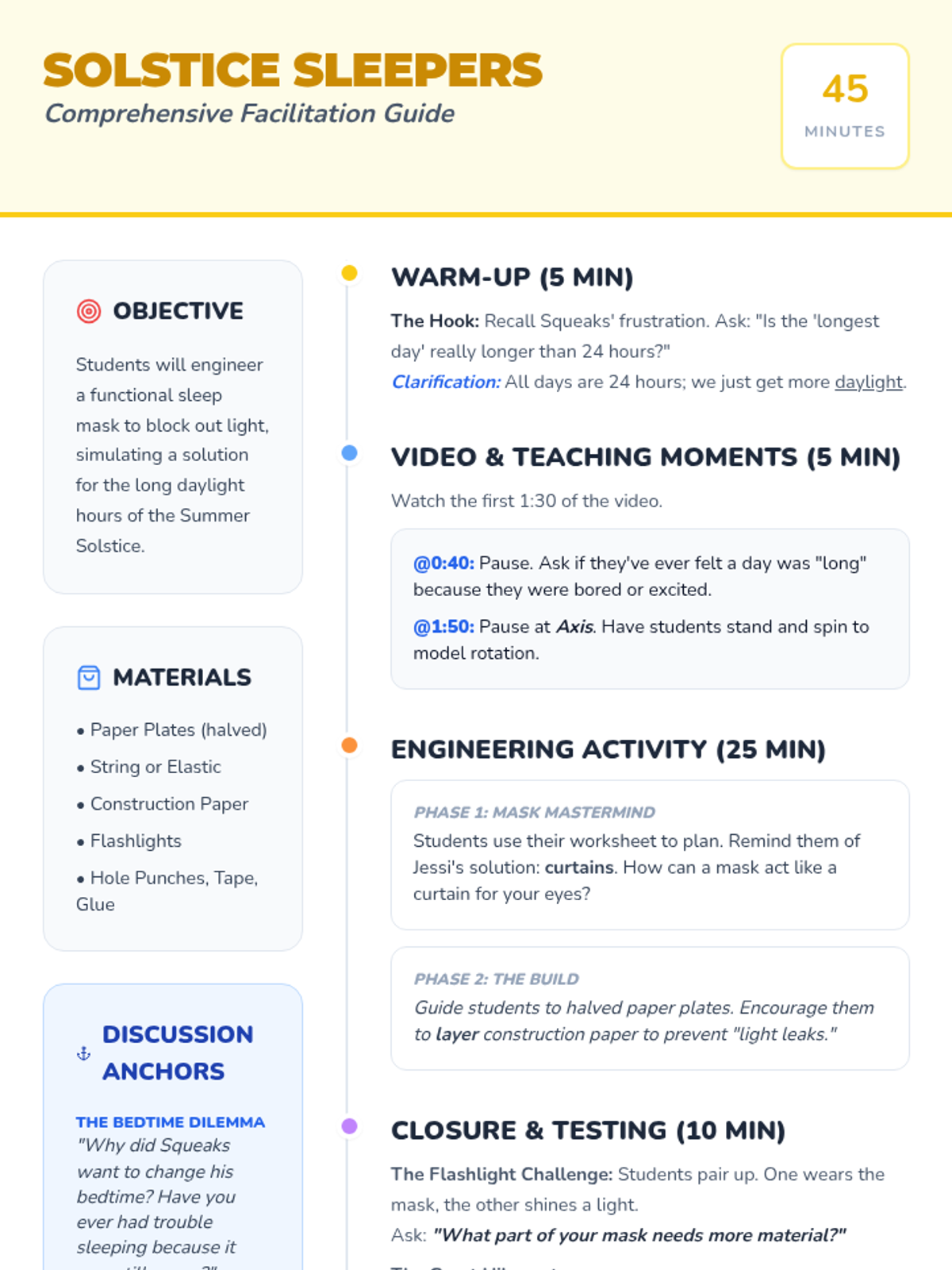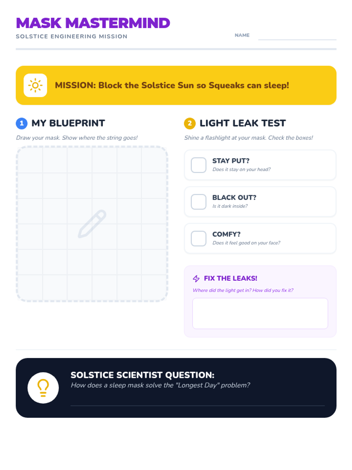 A hands-on engineering lesson where students design and test sleep masks to solve the problem of sleeping during the long daylight hours of the summer solstice.