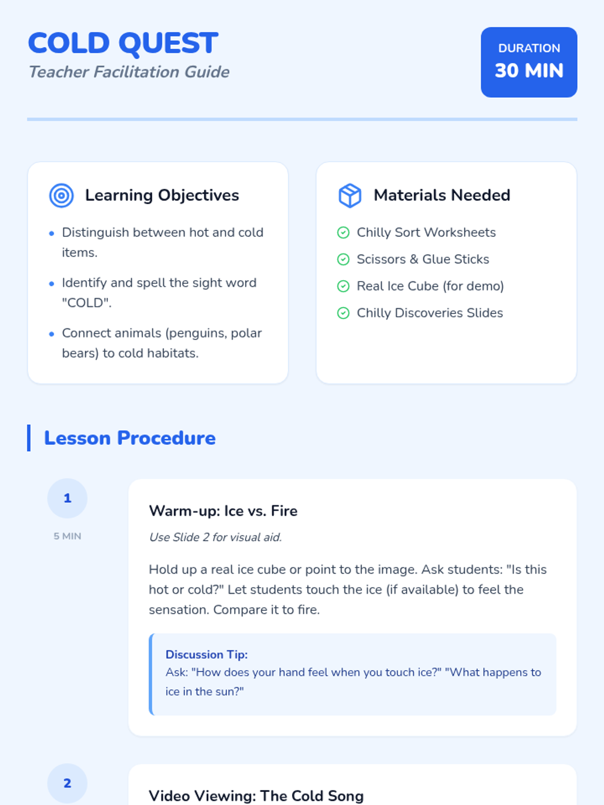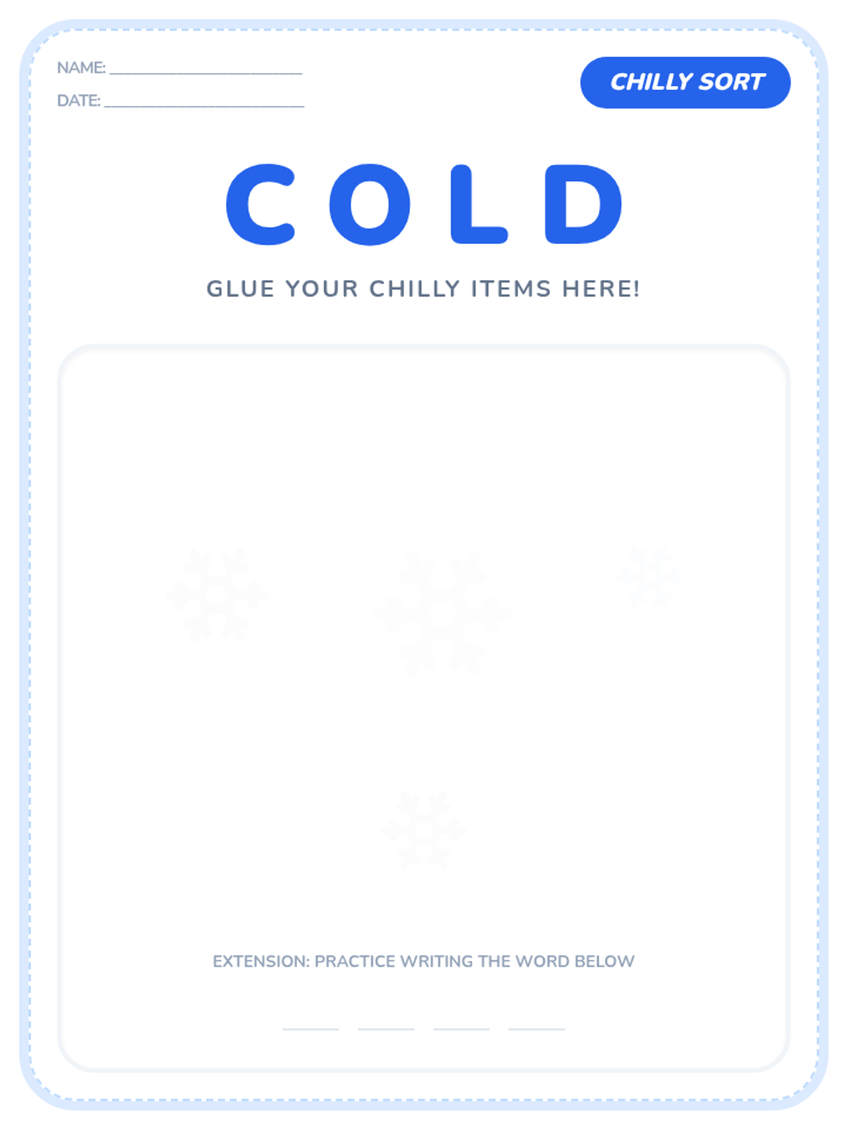 A foundational science and literacy lesson where Kindergarten students explore the concept of temperature by identifying cold items and learning to spell the sight word 'COLD'.