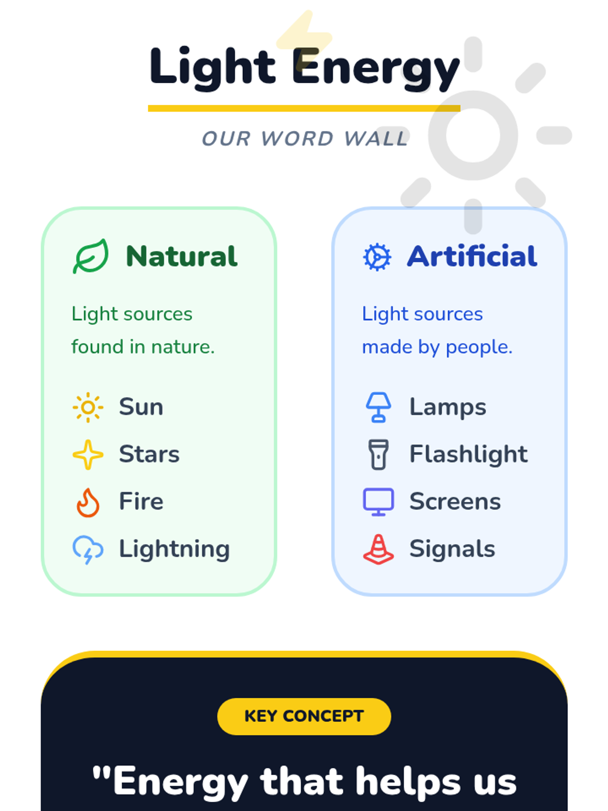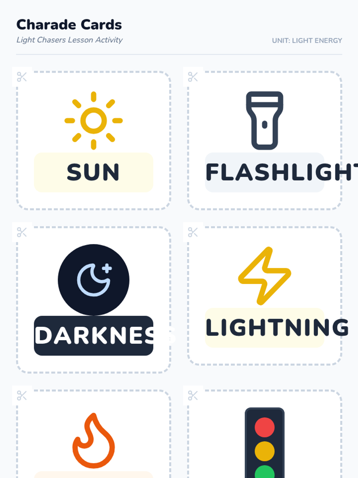 A Kindergarten and 1st Grade lesson exploring the concepts of light energy, natural and artificial sources, and darkness through interactive video viewing and charades.