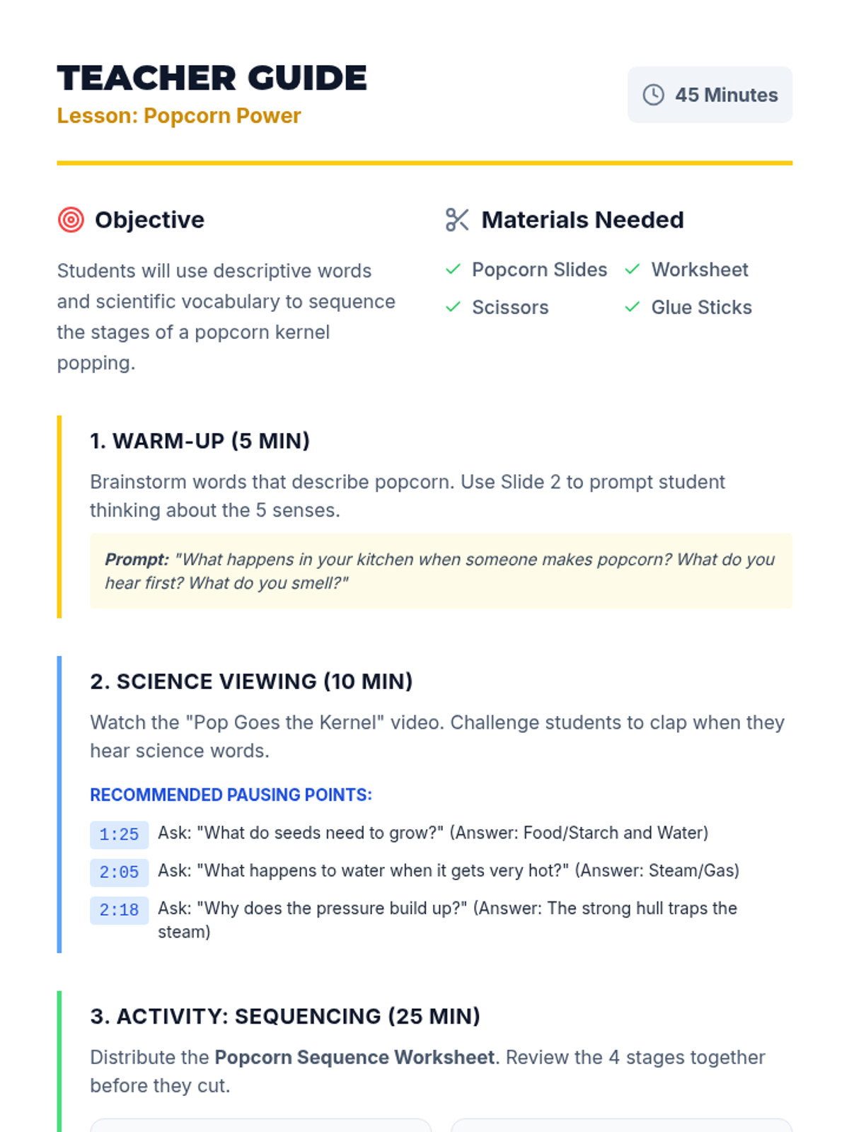Students investigate the science of popcorn, sequencing its life cycle from seed to snack while using descriptive language and scientific vocabulary.