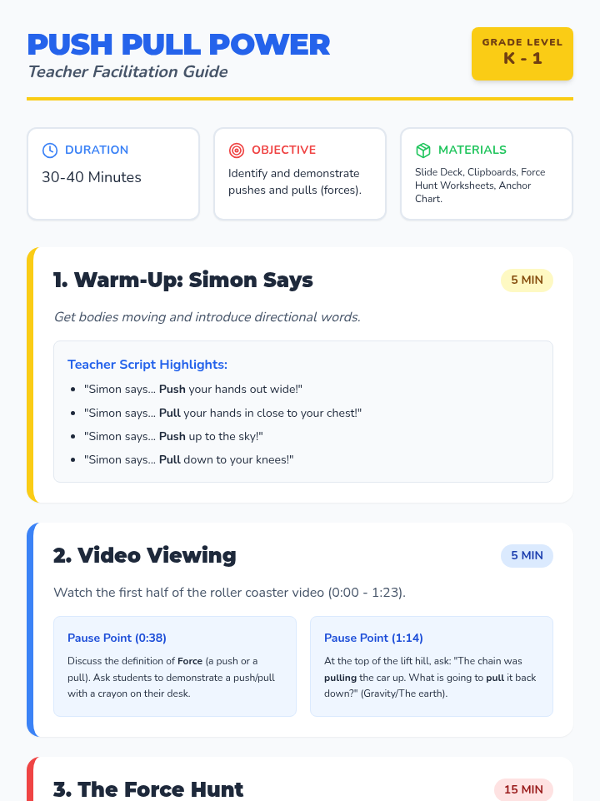 A foundational science lesson for Kindergarten students to identify and demonstrate the forces of pushing and pulling through visual aids and hands-on movement.