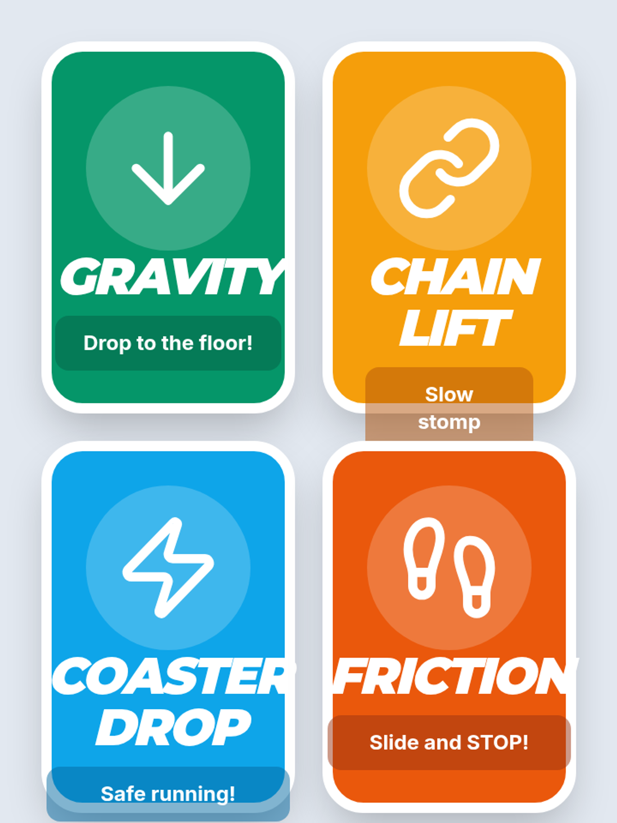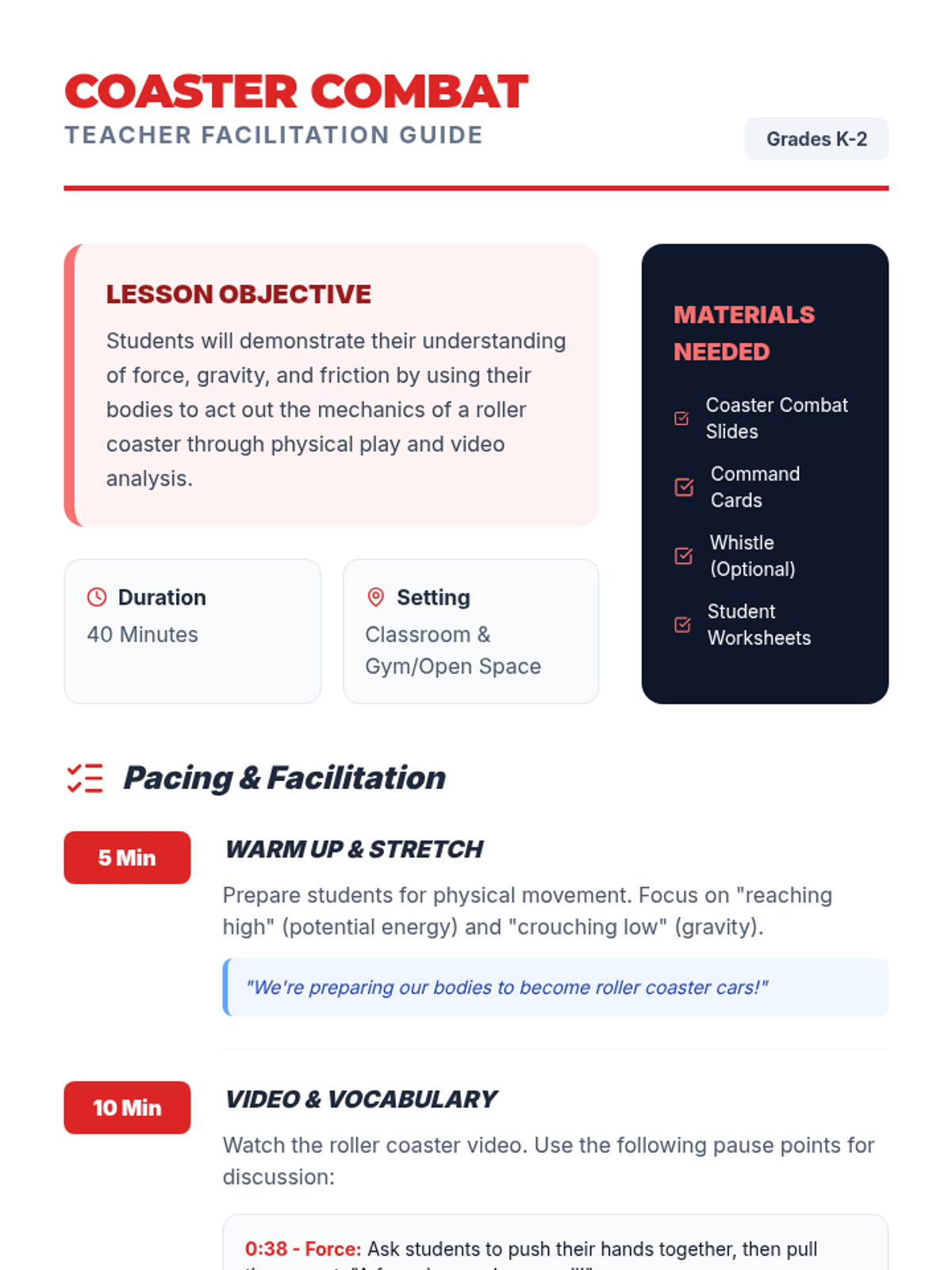 Students explore the forces of gravity and friction through movement and a roller coaster video, concluding with a physics-themed 'Red Light, Green Light' game.