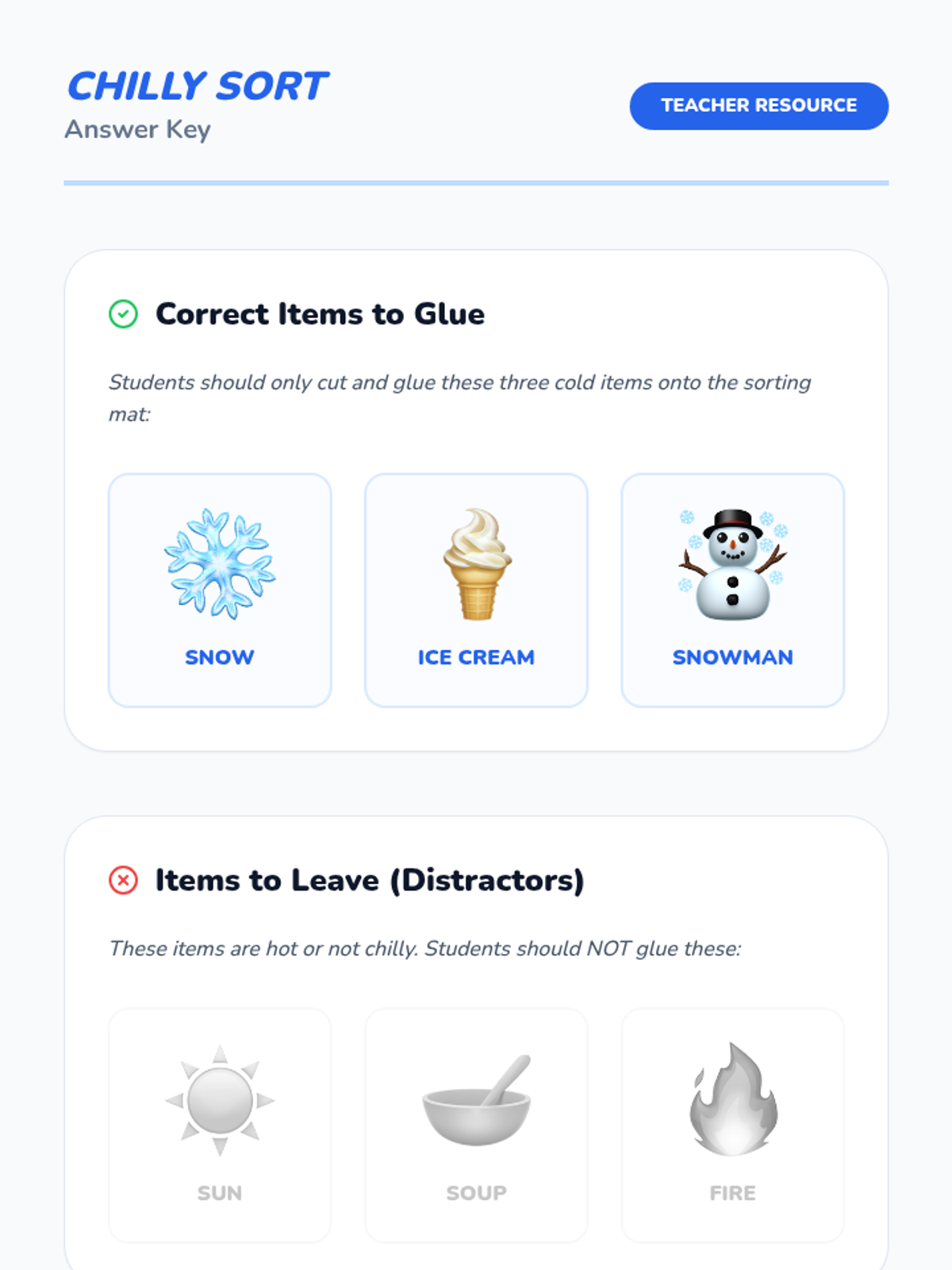 Students sort pictures of various items into 'hot' and 'cold' categories to build foundational vocabulary.