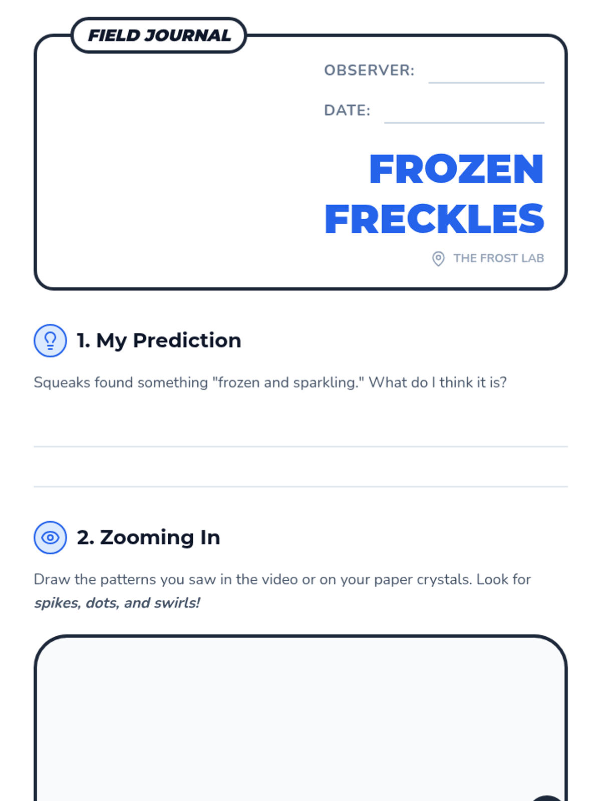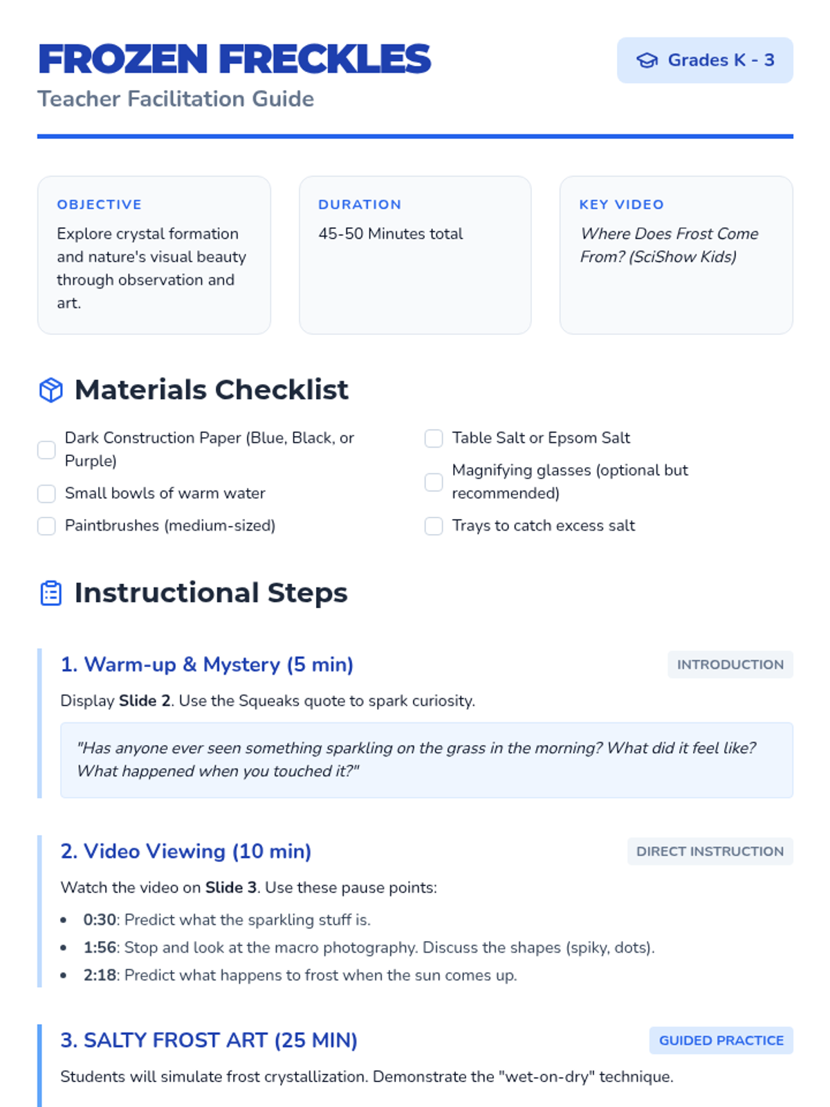 Students explore the science of frost through video observation and a salt-crystallization art activity that simulates ice crystal formation on leaves.