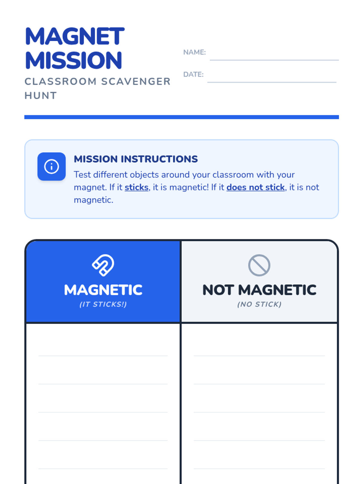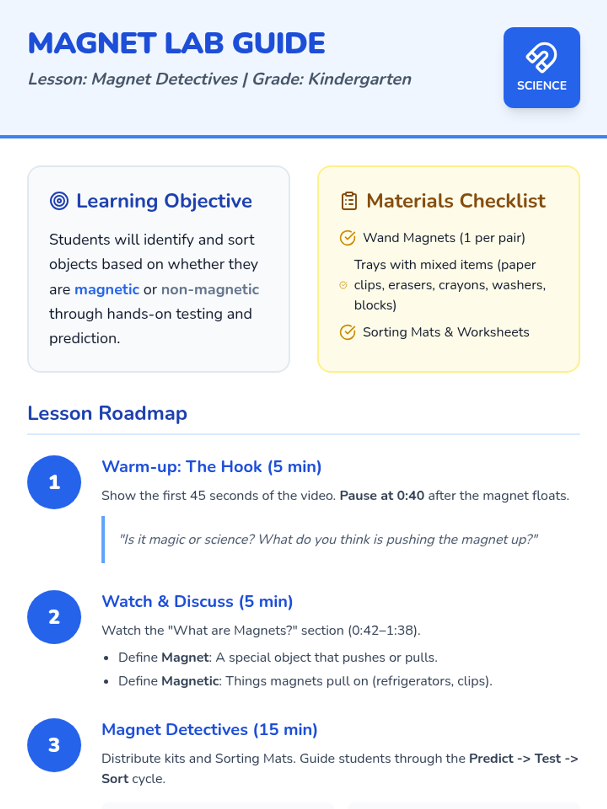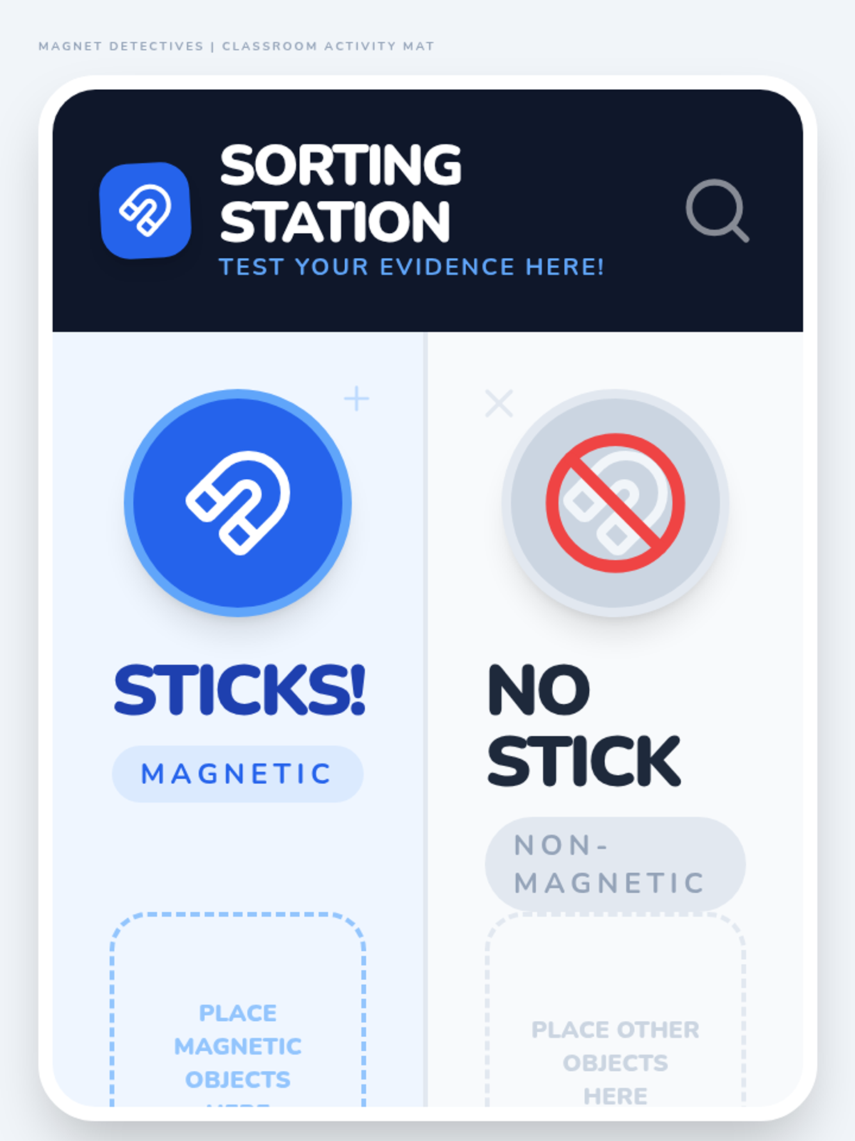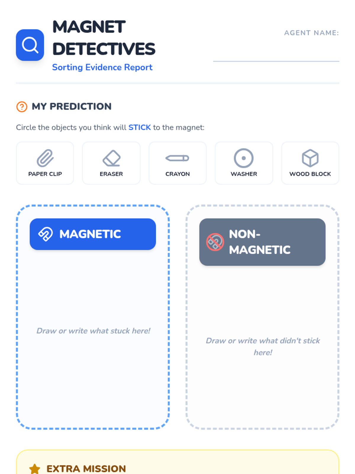 Students explore the invisible force of magnetism by testing common classroom objects and sorting them into magnetic and non-magnetic categories using a 'Magnet Detective' theme.