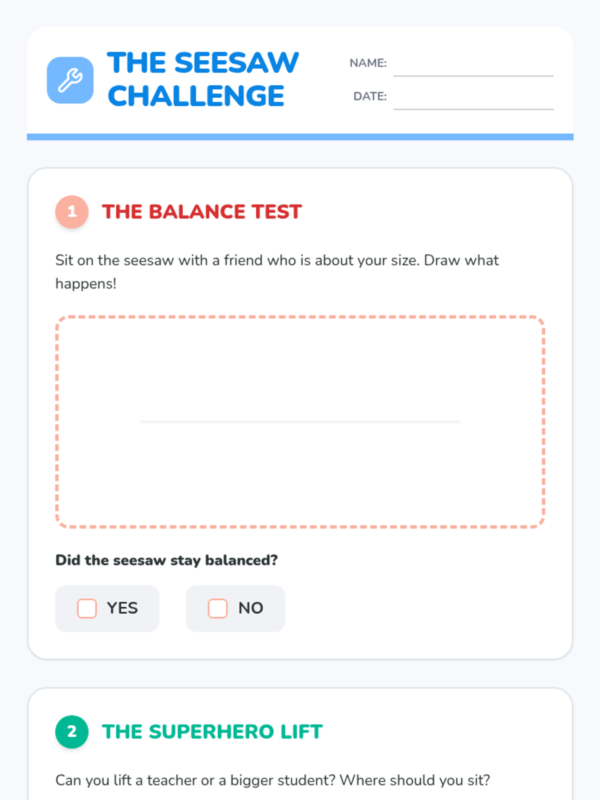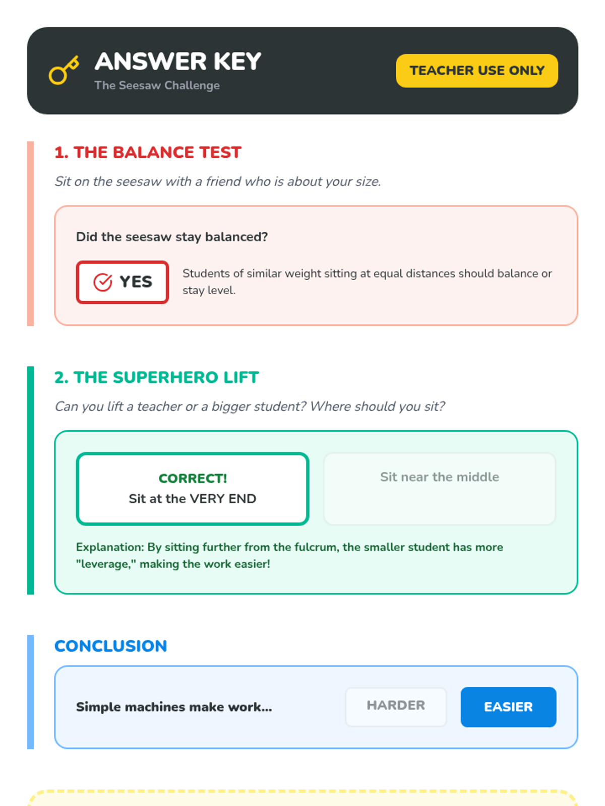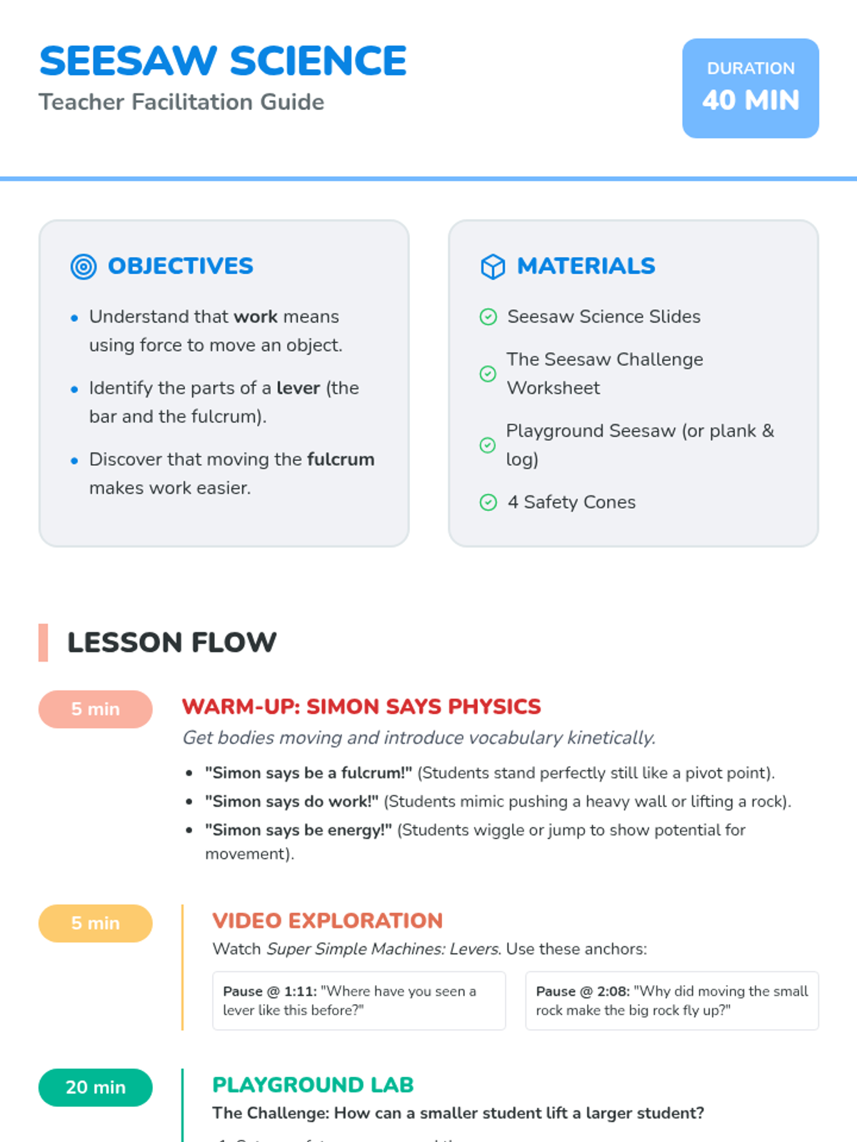 A hands-on physics lesson for K-2nd graders exploring work and energy using levers and playground seesaws. Students learn through a kinetic warm-up, a video exploration, and an outdoor 'Playground Lab'.