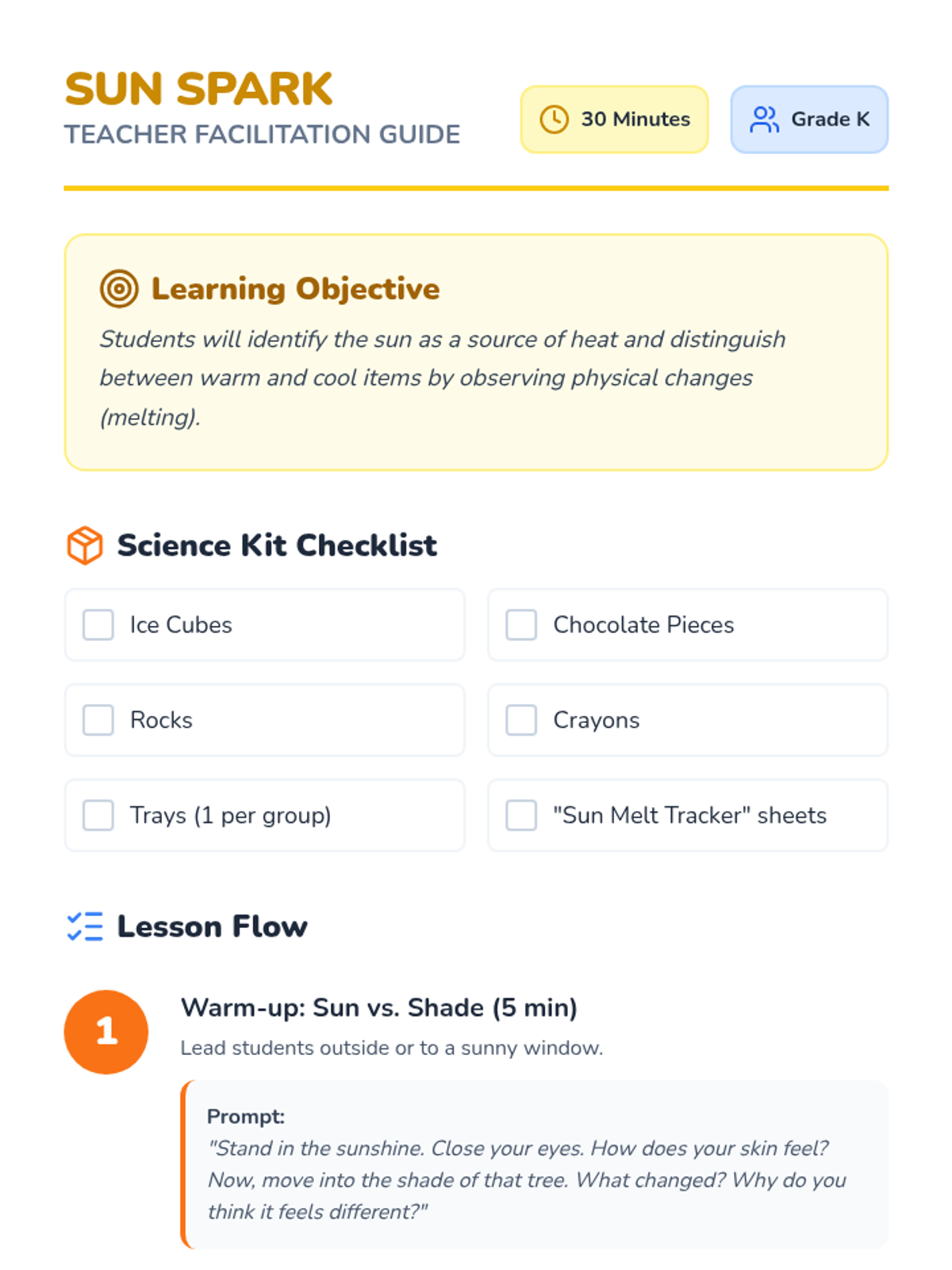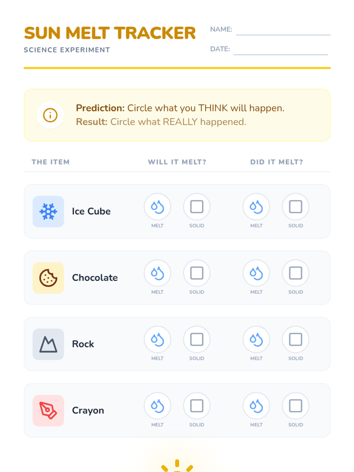 A hands-on Kindergarten science lesson where students explore the sun's role as a heat source through observation, video, and a 'Sun Melt' experiment.