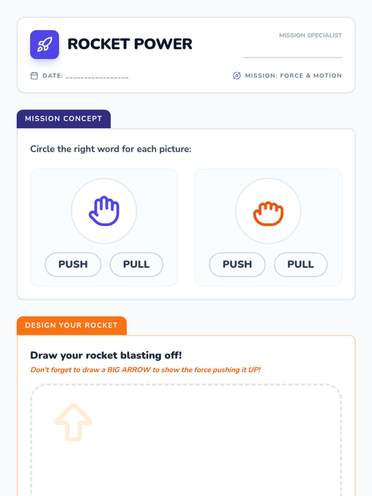 A hands-on exploration of force using air rockets, where kindergarteners learn about pushes and how the strength of a push changes an object's motion.