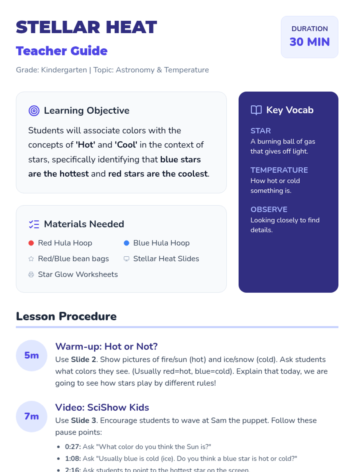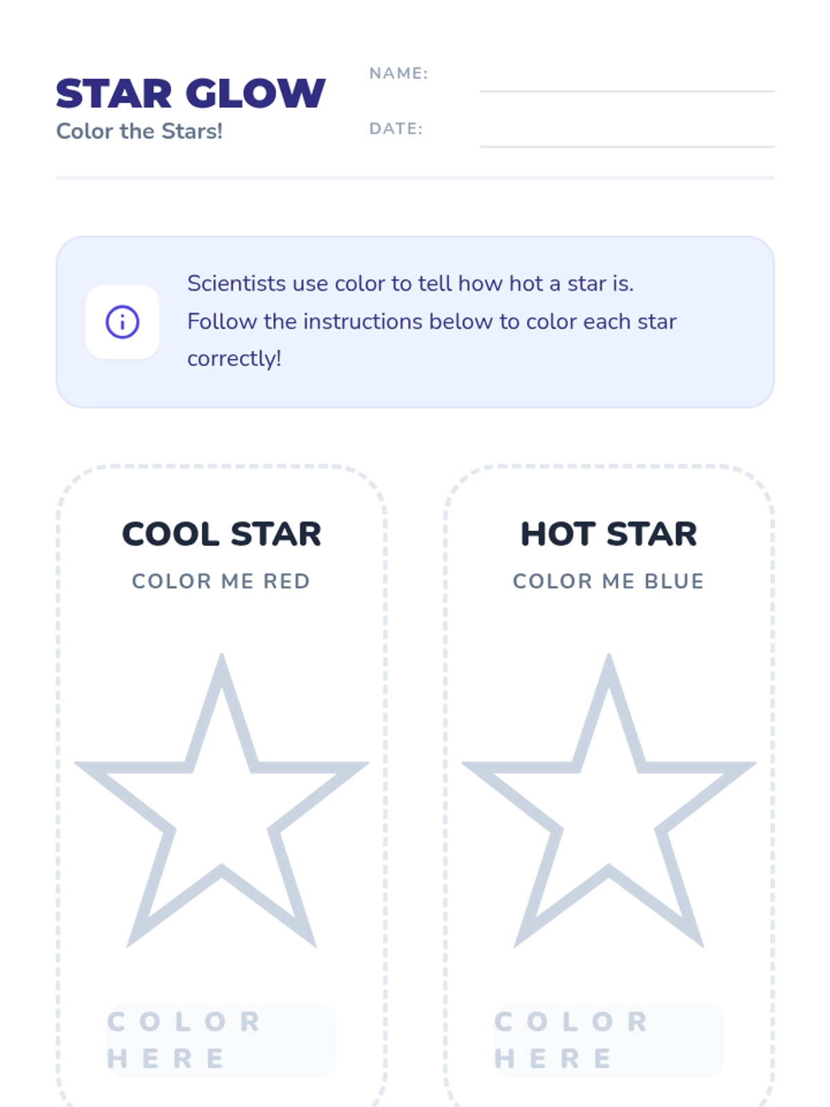 In this lesson, Kindergarten students discover that the color of a star tells us how hot it is, reversing their typical associations by learning that blue stars are the hottest and red stars are the coolest.