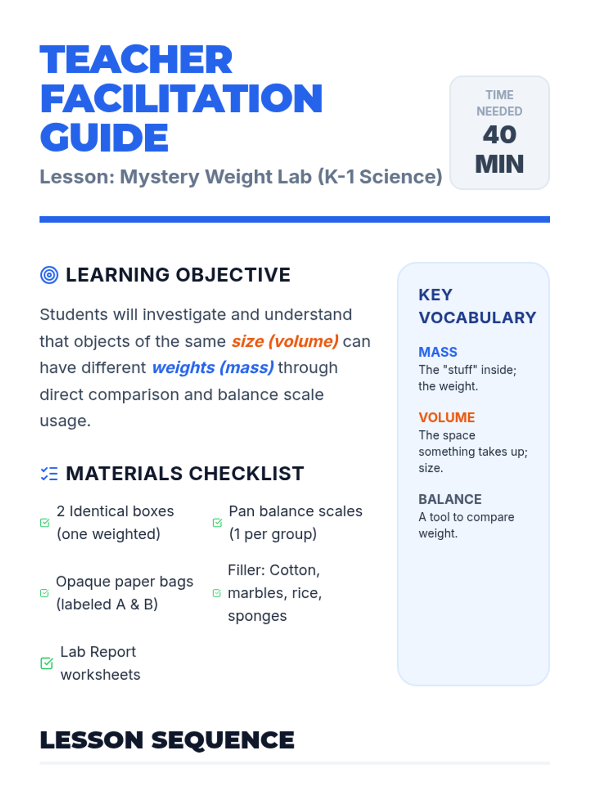 A hands-on science lesson for K-1 students exploring the relationship between size (volume) and weight (mass) using mystery bags and balance scales. Students use observational skills and tools to discover that items of the same size can have different weights.