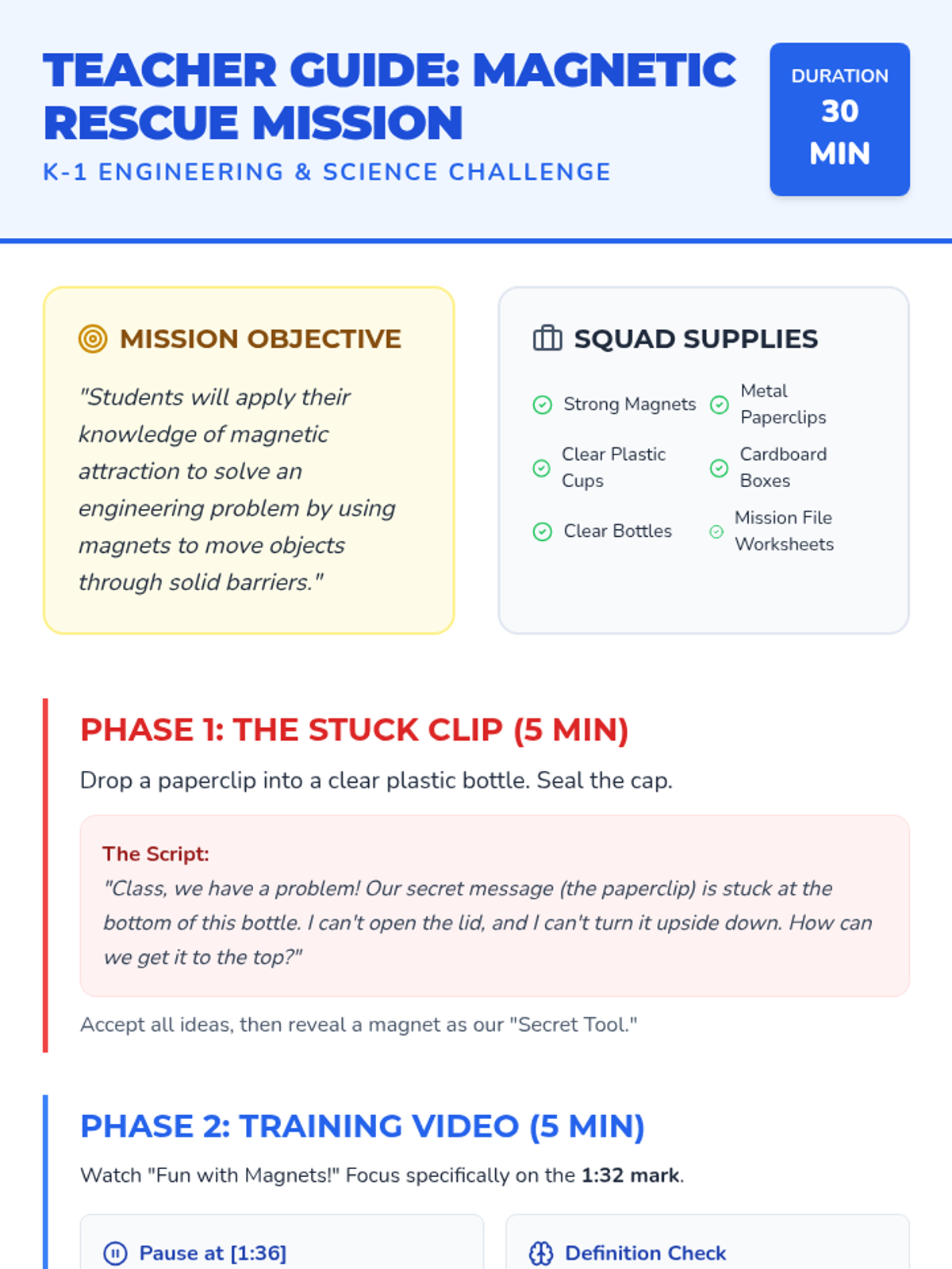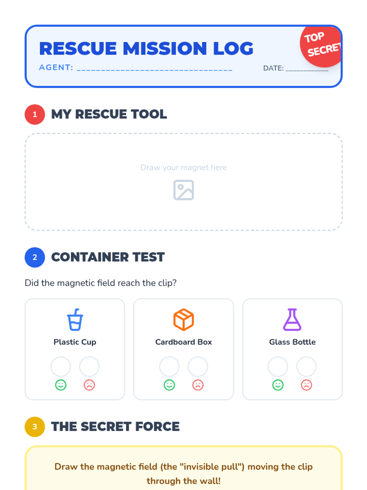 Students will investigate the 'invisible force' of magnets and apply their understanding of magnetic fields to solve an engineering challenge: rescuing a paperclip from the bottom of various containers without touching it directly.