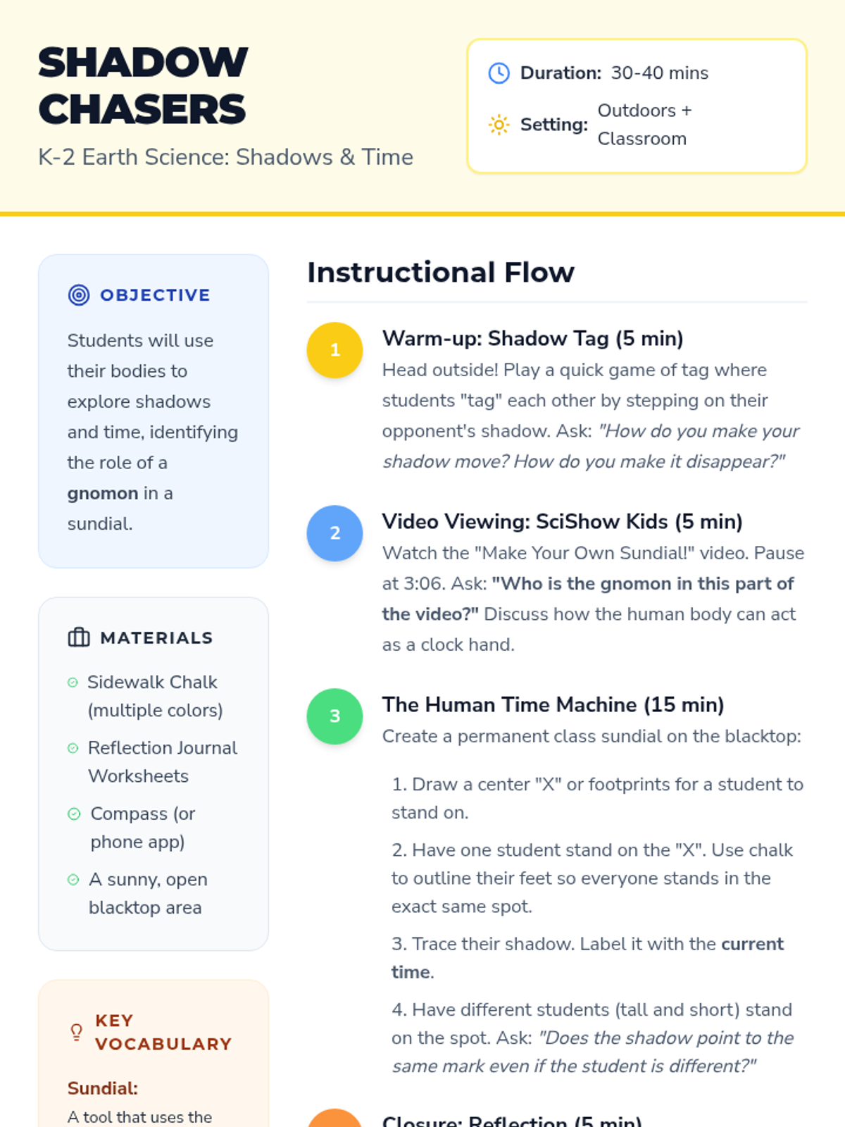 Students explore how shadows move with the sun by becoming 'human gnomons' in a giant blacktop sundial. This hands-on lesson connects physical movement to the Earth's rotation and the history of timekeeping.