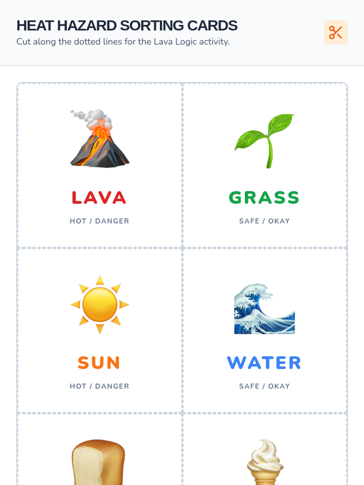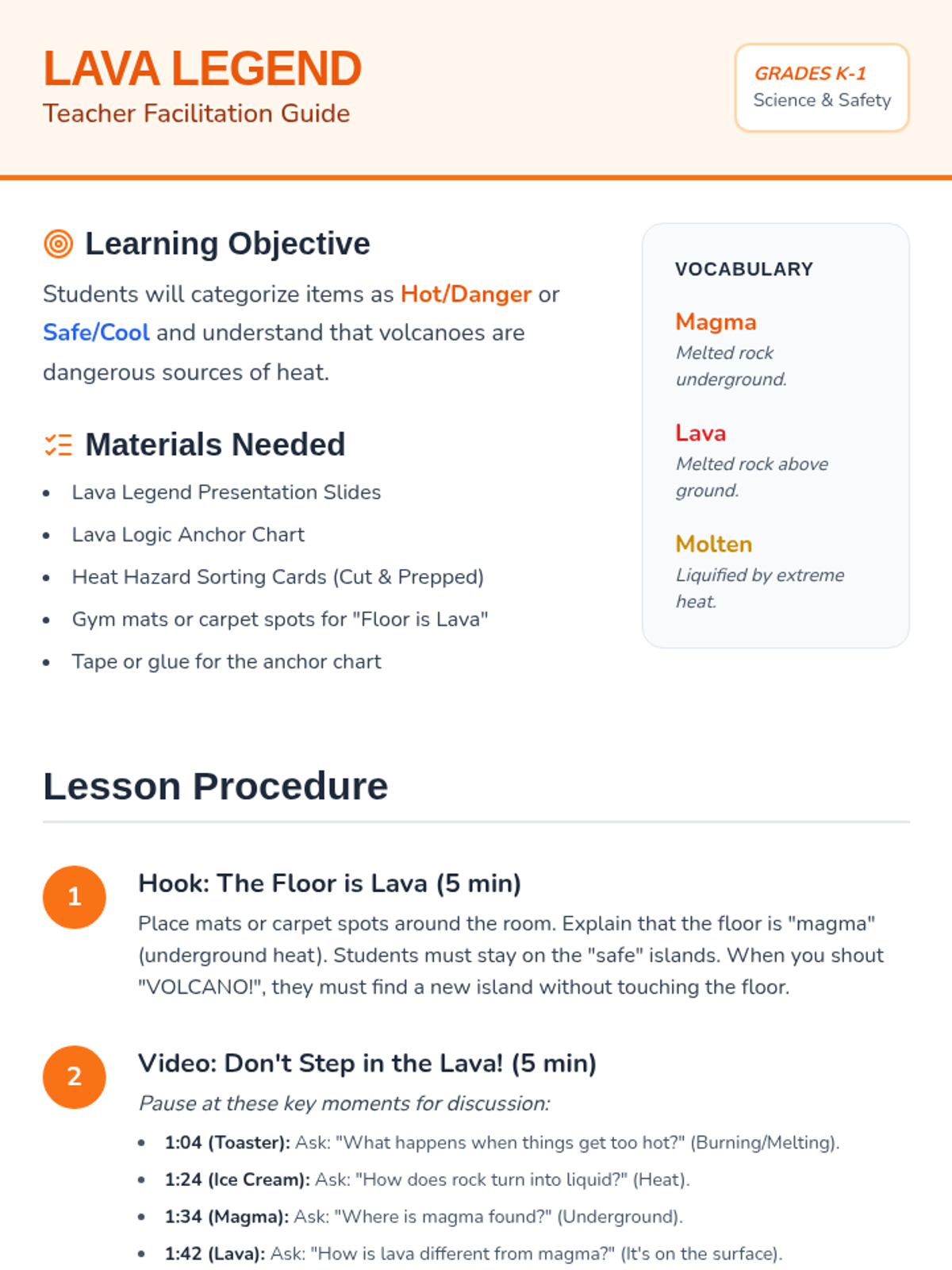 A high-energy science and safety lesson for Kindergarten and 1st Grade students to distinguish between 'Hot' and 'Safe' items using the Scratch Garden 'Lava is Hot' song. Students will learn basic volcanic science and practice safety categorization through movement and sorting.