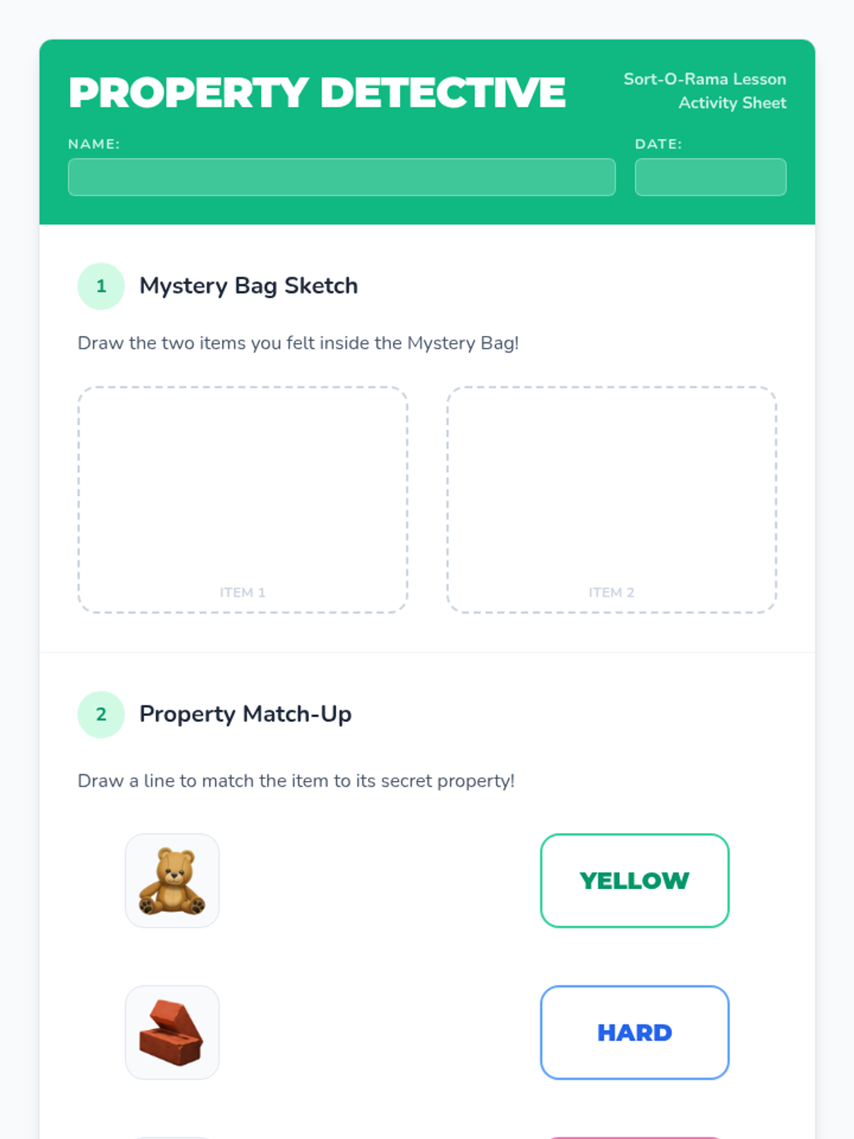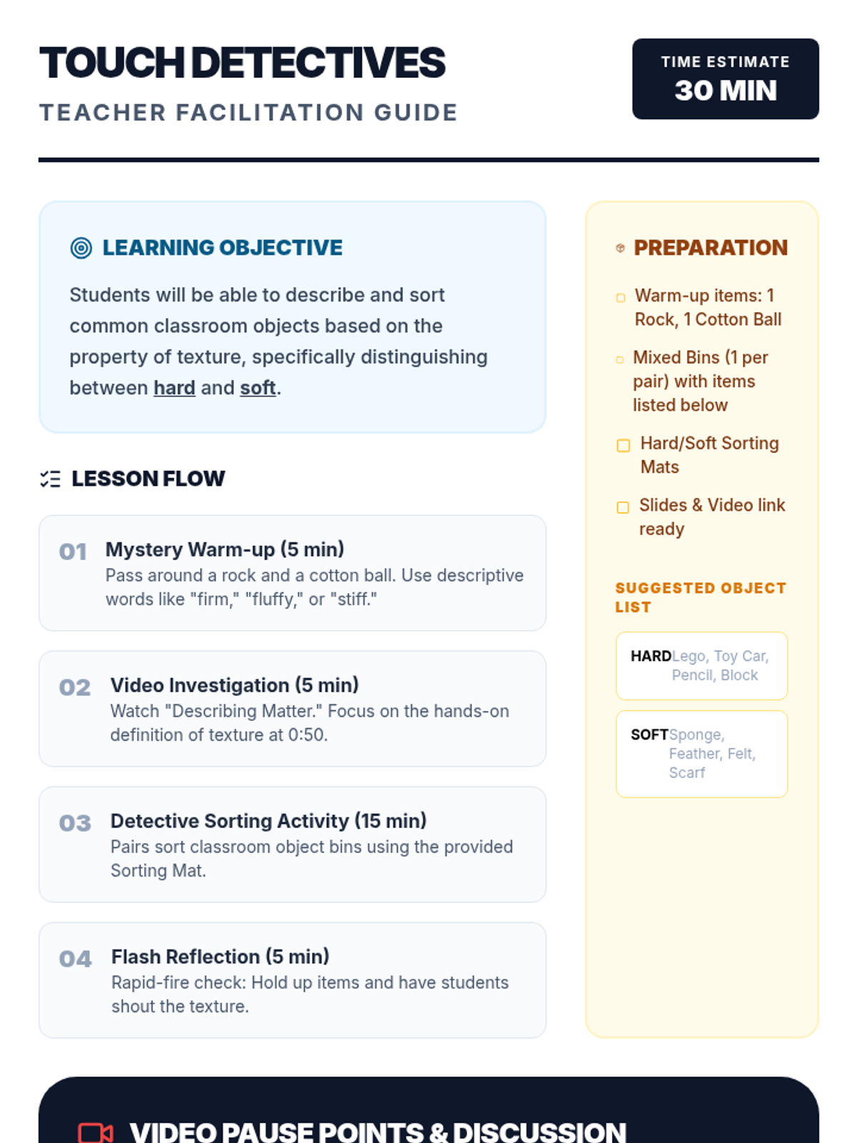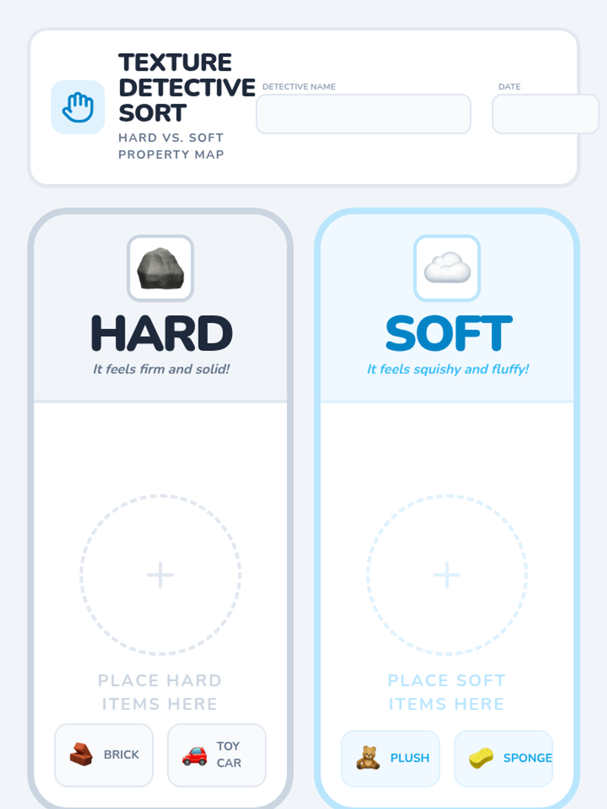 A hands-on kindergarten lesson where students explore the property of texture by sorting classroom objects into 'hard' and 'soft' categories using a video guide and interactive sorting mats.