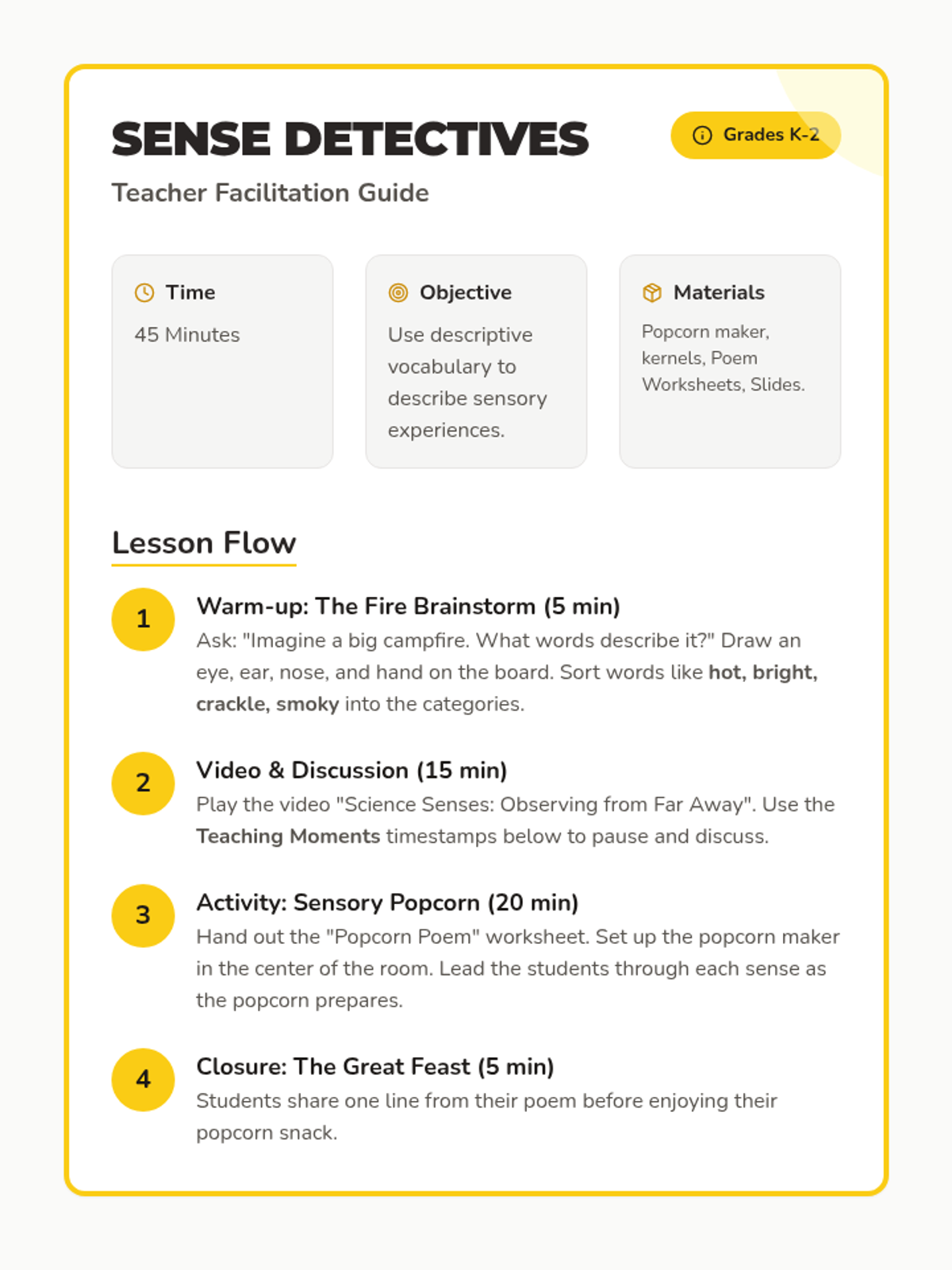 Students explore the five senses by observing a campfire (video) and participating in a multi-sensory popcorn popping activity, focusing on descriptive vocabulary and the science of observation.