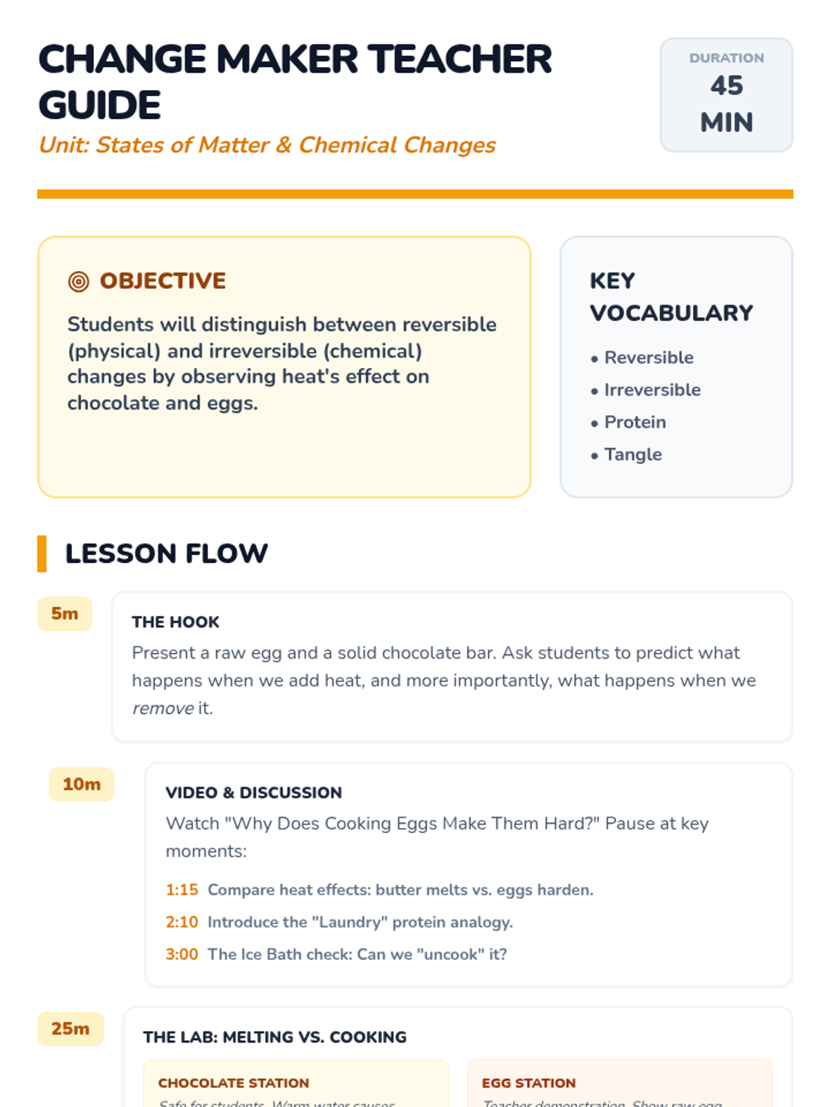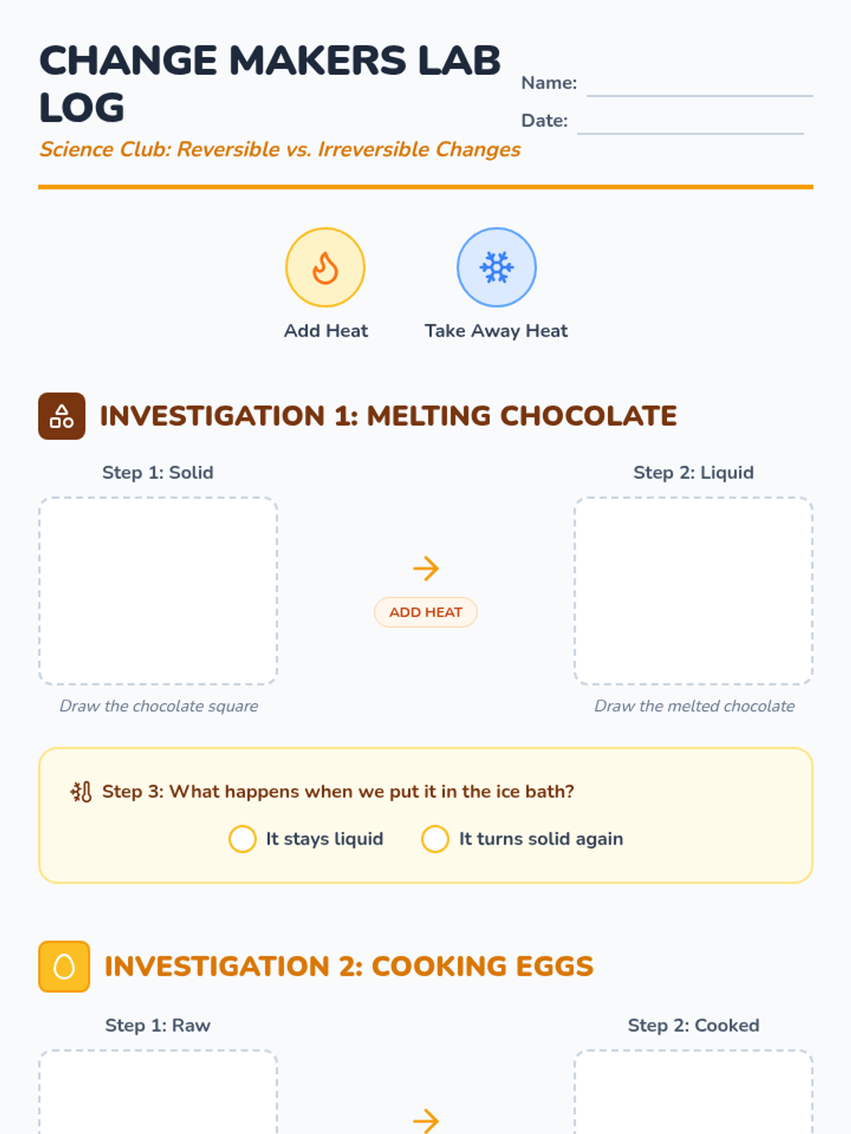A hands-on science lesson for K-3rd graders exploring reversible and irreversible changes using chocolate and eggs. Students investigate how heat transforms matter and use a 'protein tangle' analogy to understand why some changes can't be undone.